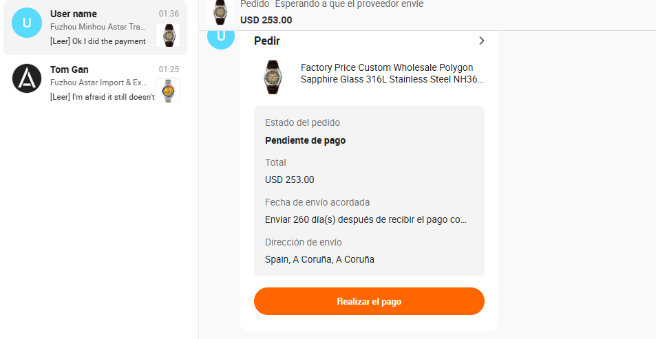 Buenos dias chicos, me vais a perdonar, es mi primer proyecto del foro y veo que ya estáis pagando, a mi no me ha llegado ningún mensaje aqui ni en la app de Alibaba, alguien que me pueda ayudar? Muchas gracias.