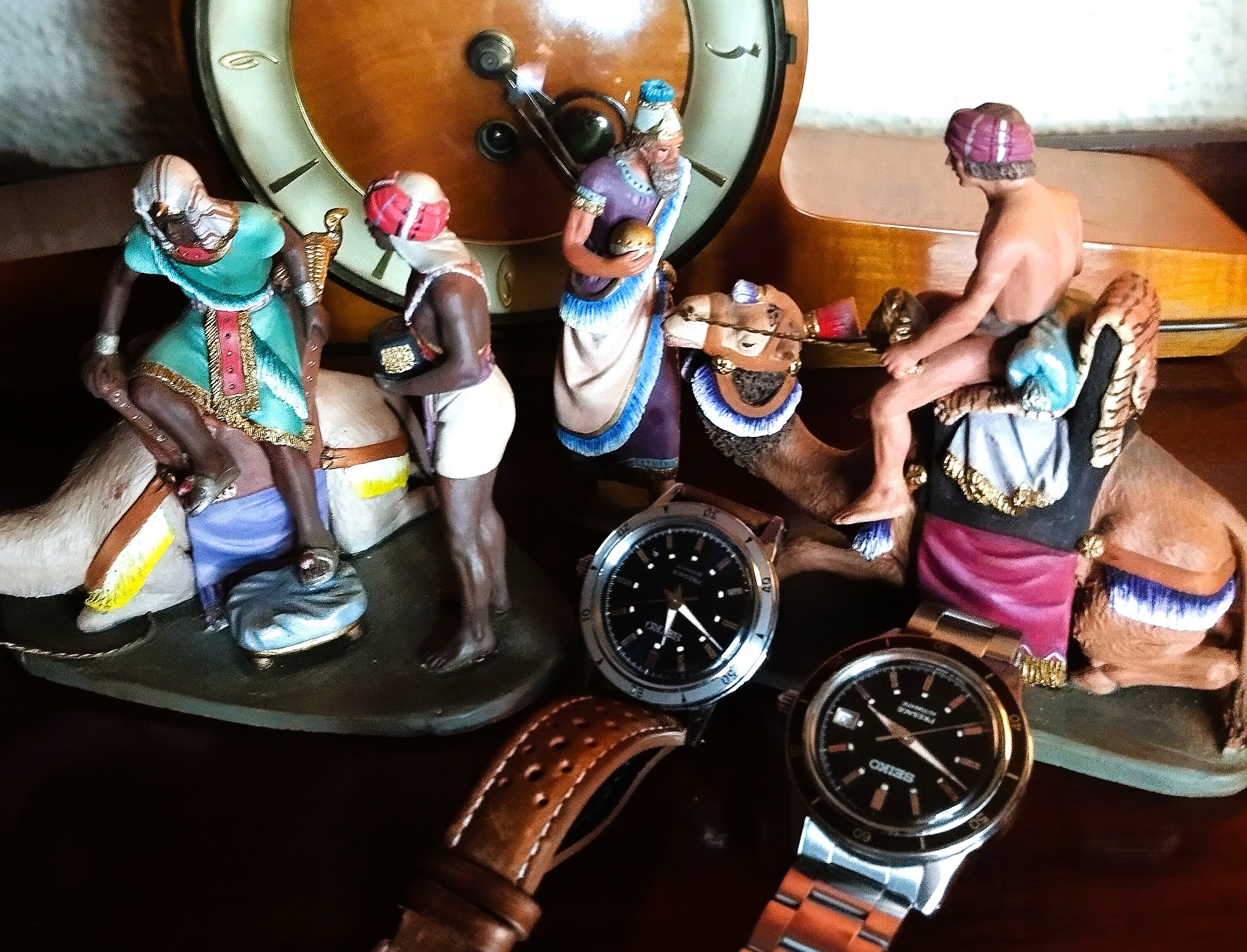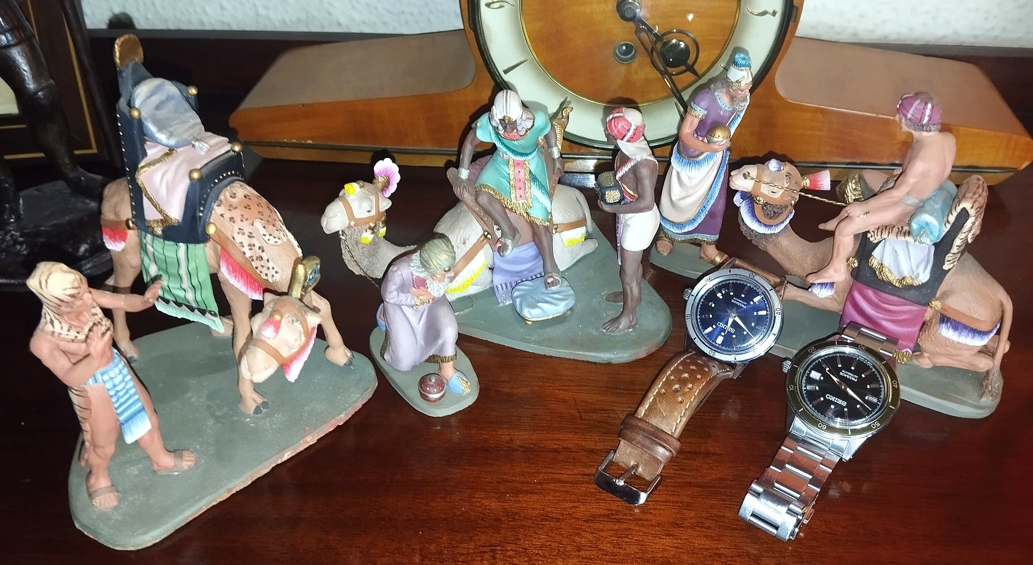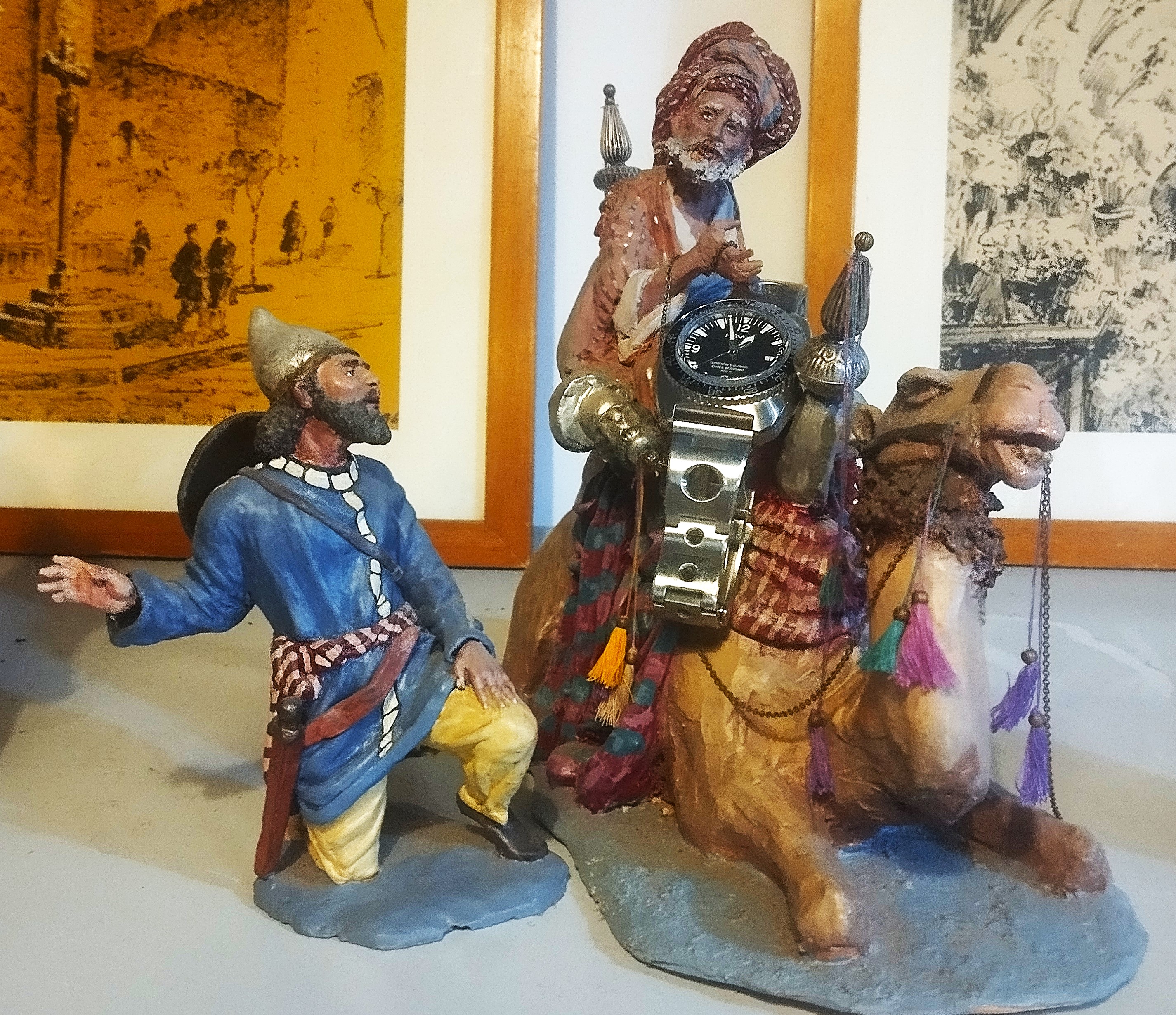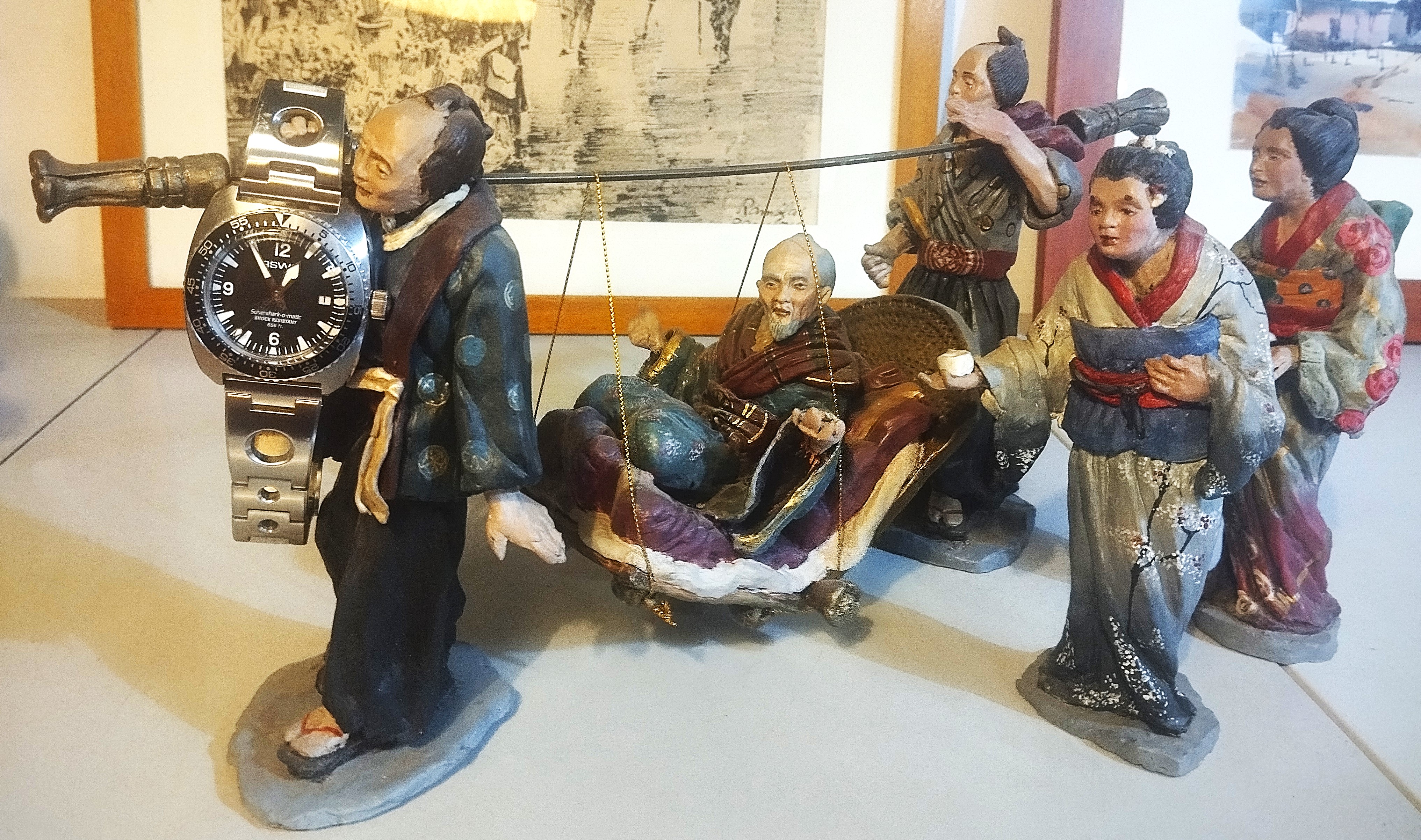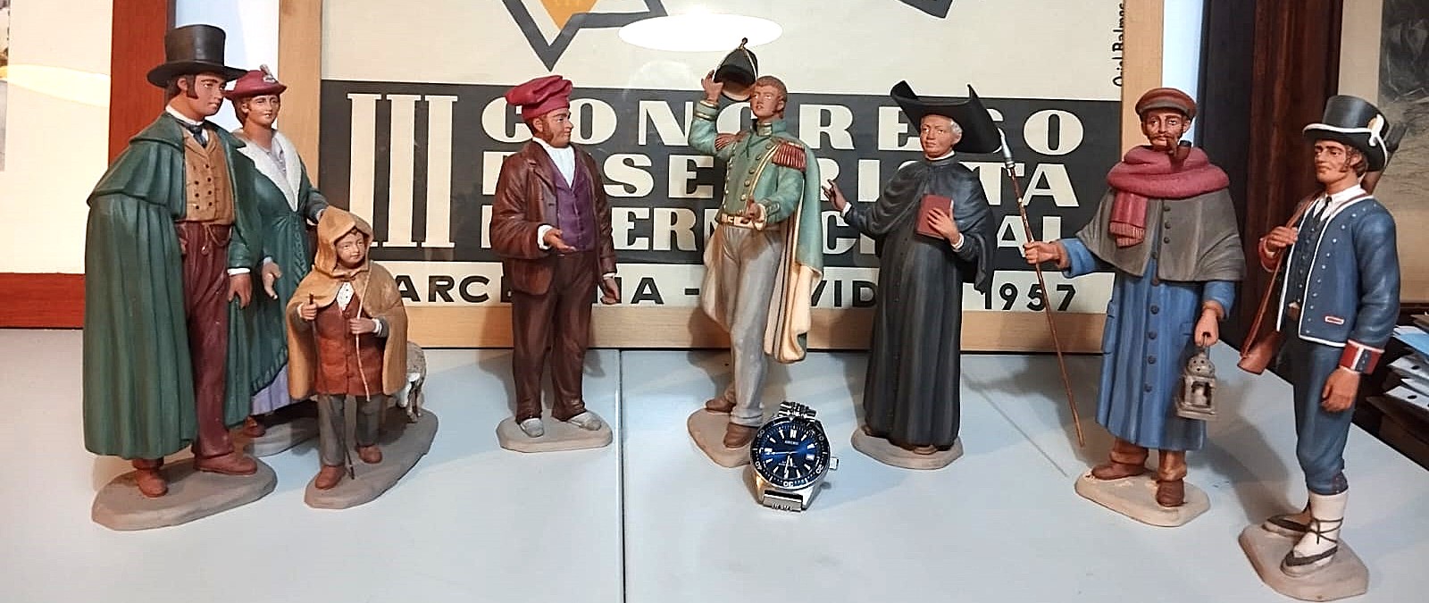 Figuras de 12 cm, diseño y molde Daniel modeladas por Gemma Bertran. Acompañados por dos Seiko Presage estilo 60’s.