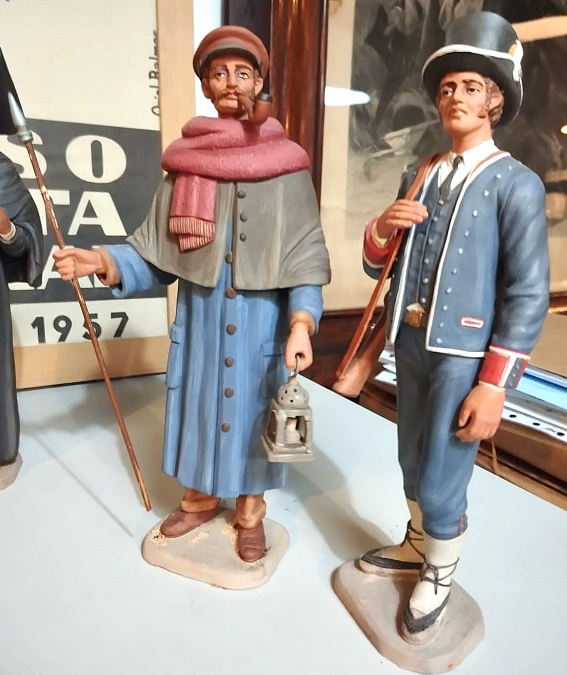 Finalmente, algo de boato. El sereno con chuzo, al que se le puede cambiar el chuzo por un bastón y la linterna por una maleta y hace de mozo de cuerda, y el Mosso d’Esquadra que vigila la Plana de Vic contra los bandoleros, en su uniforme decimonónico que es el que llevaban cuando yo era pequeño, en los días de gala, los guardias del Palacio de la Diputación Provincial, ahora Palau de la Generalitat.