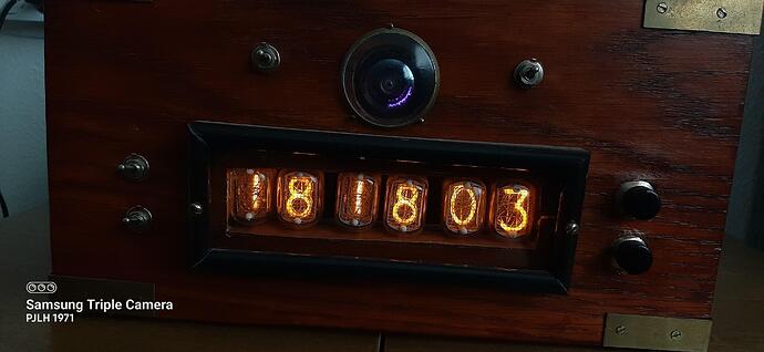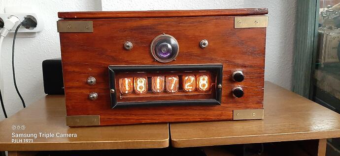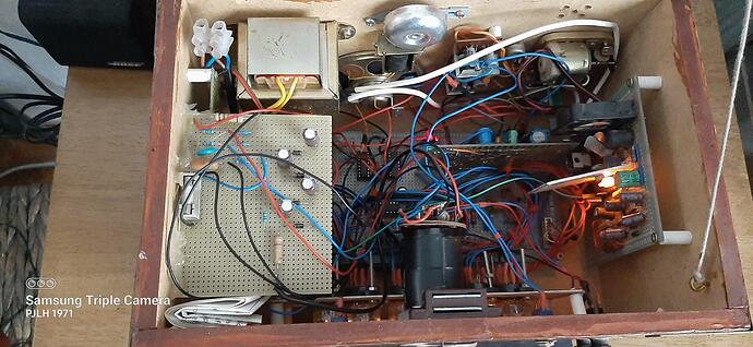 Dicho y hecho. Se trata de un reloj totalmente artesanal, como podéis ver de su interior, al que se le ha añadido un tubo “decatrón” más con fines estéticos que funcionales, y que lleva una campanilla para dar las horas, y un relé con la peregrina función de hacer “tic tac”. Menos mal que son anulables tanto el relé como la campana.