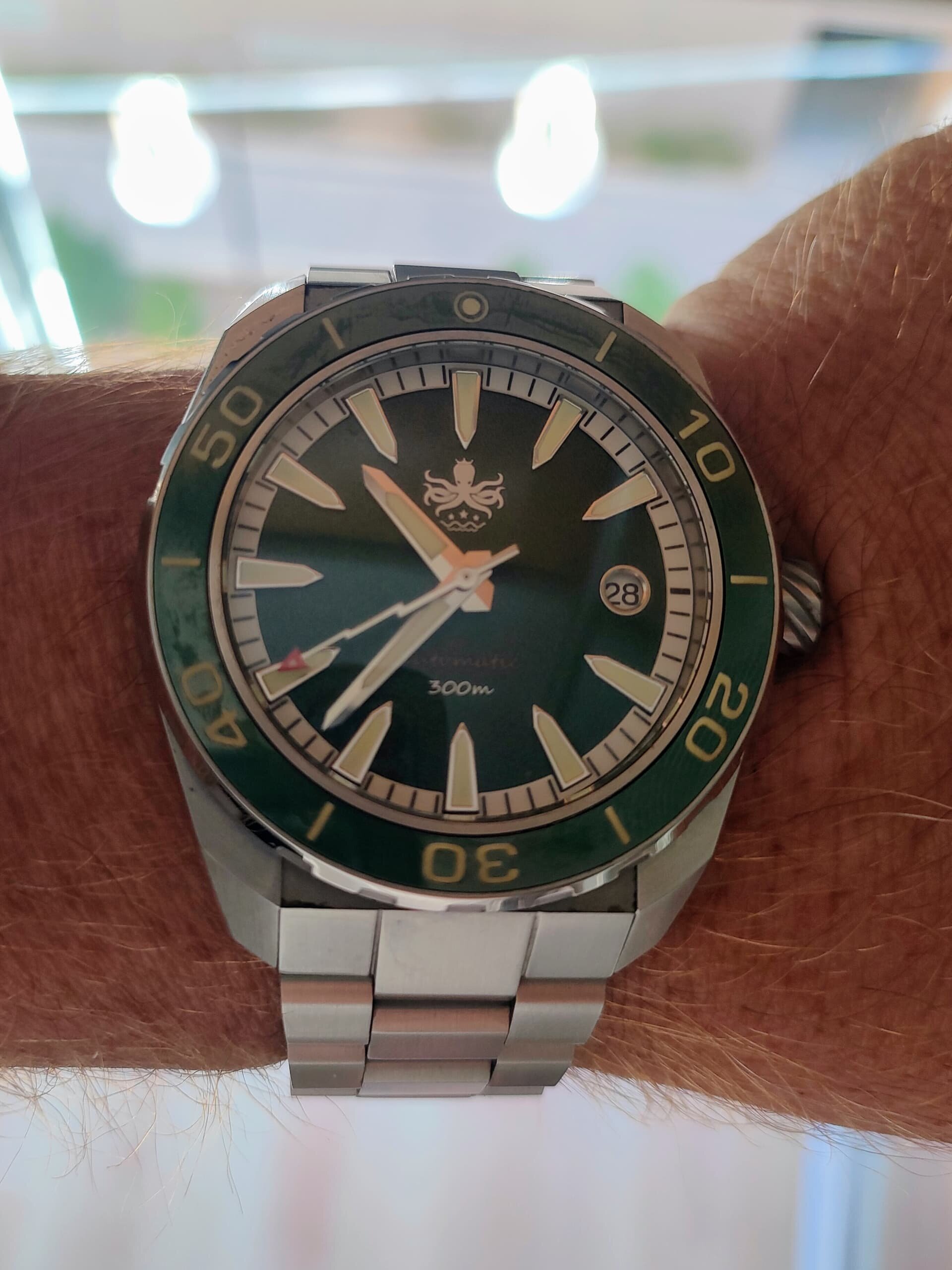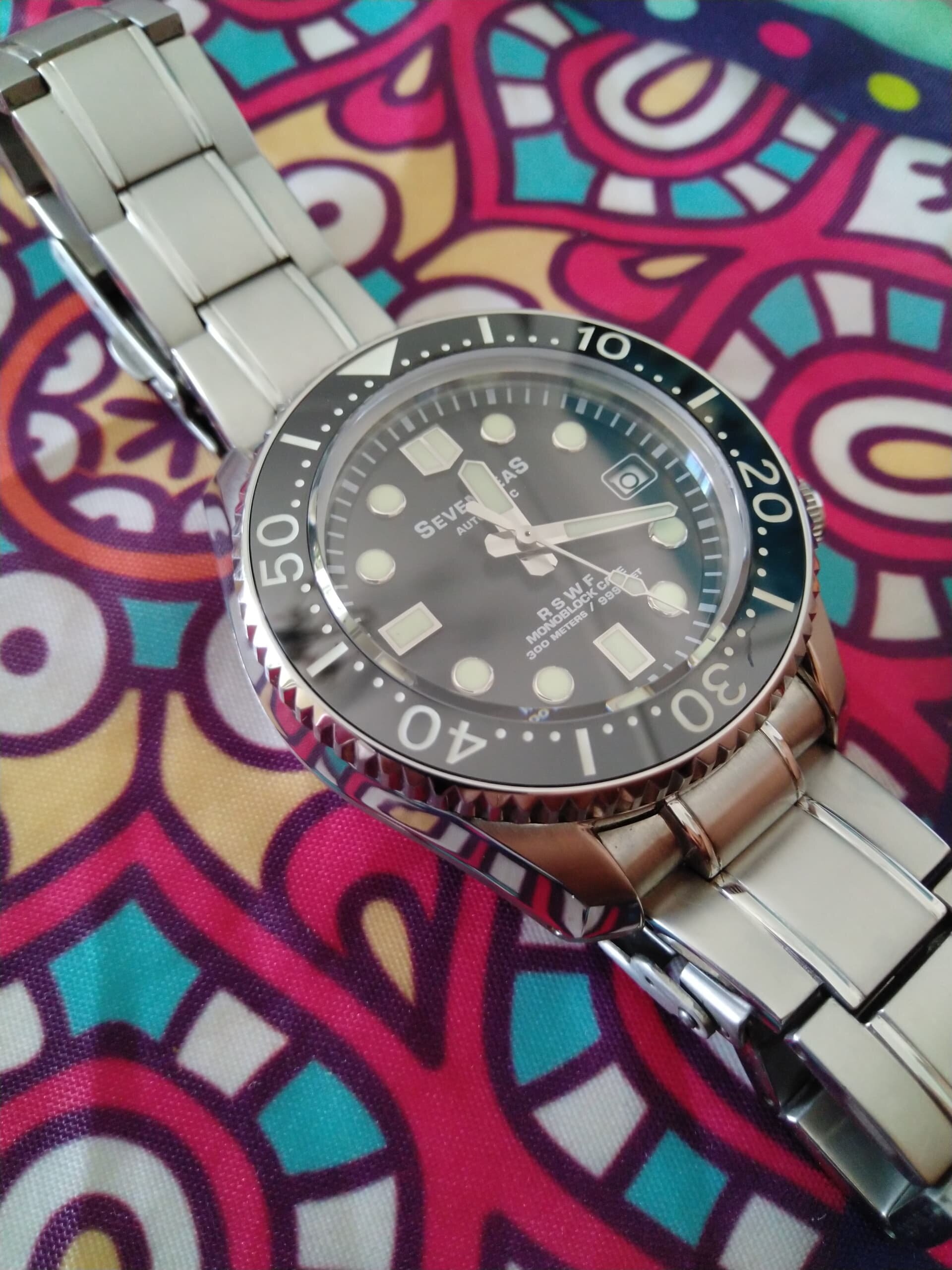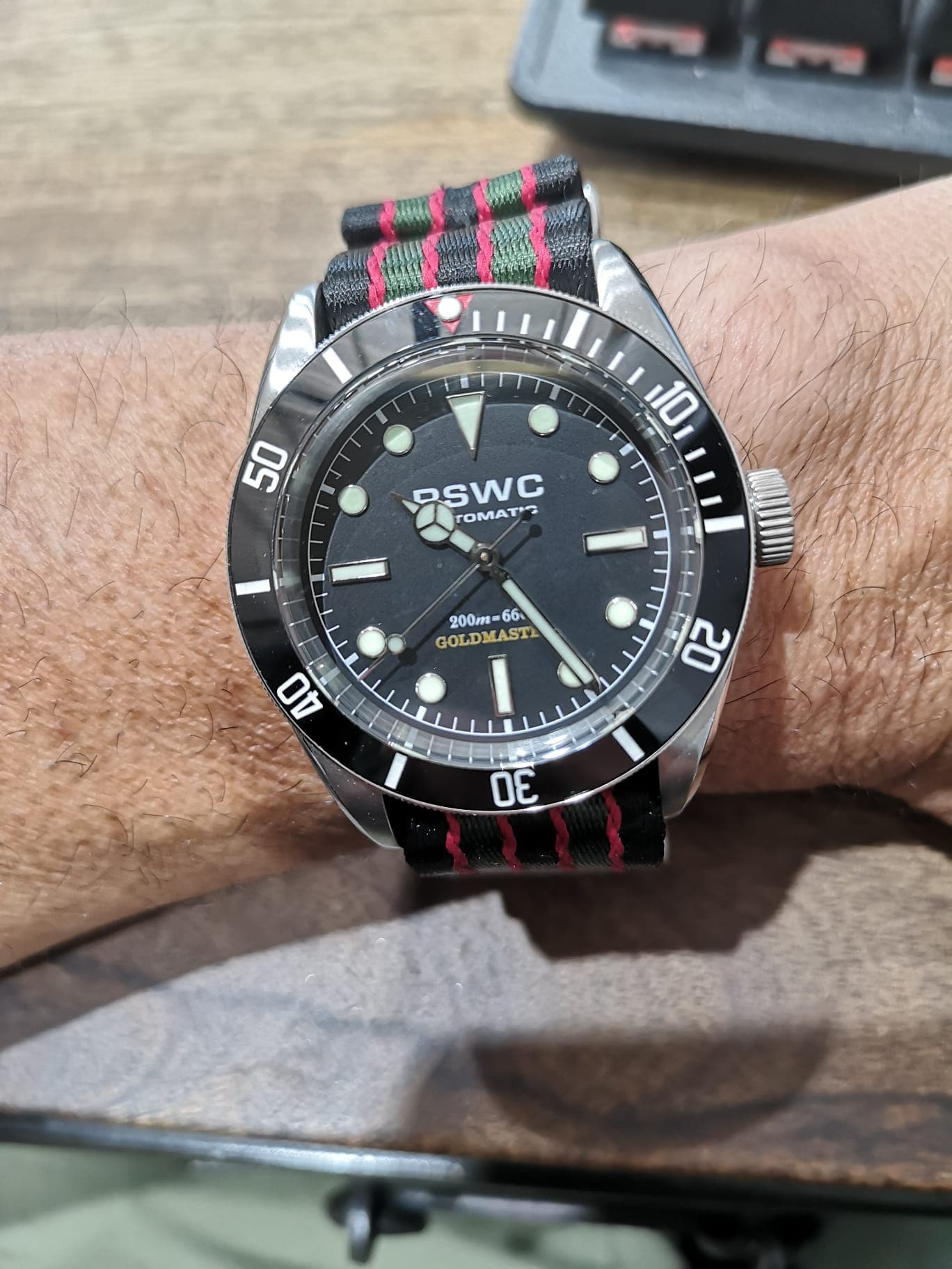 Probablemente el reloj más infravalorado de la ya mítica firma RSWC, el “Goldmaster”, con una relación calidad-precio insuperable, con un bisel finisimo con un tacto perfecto y sin holguras, un lumen de escándalo, índices aplicados, manecillas tipo Mercedes y el movimiento de Seiko NH35 que no será el más caro ni el más sofisticado ni el más bonito pero es duro y fiable como pocos.