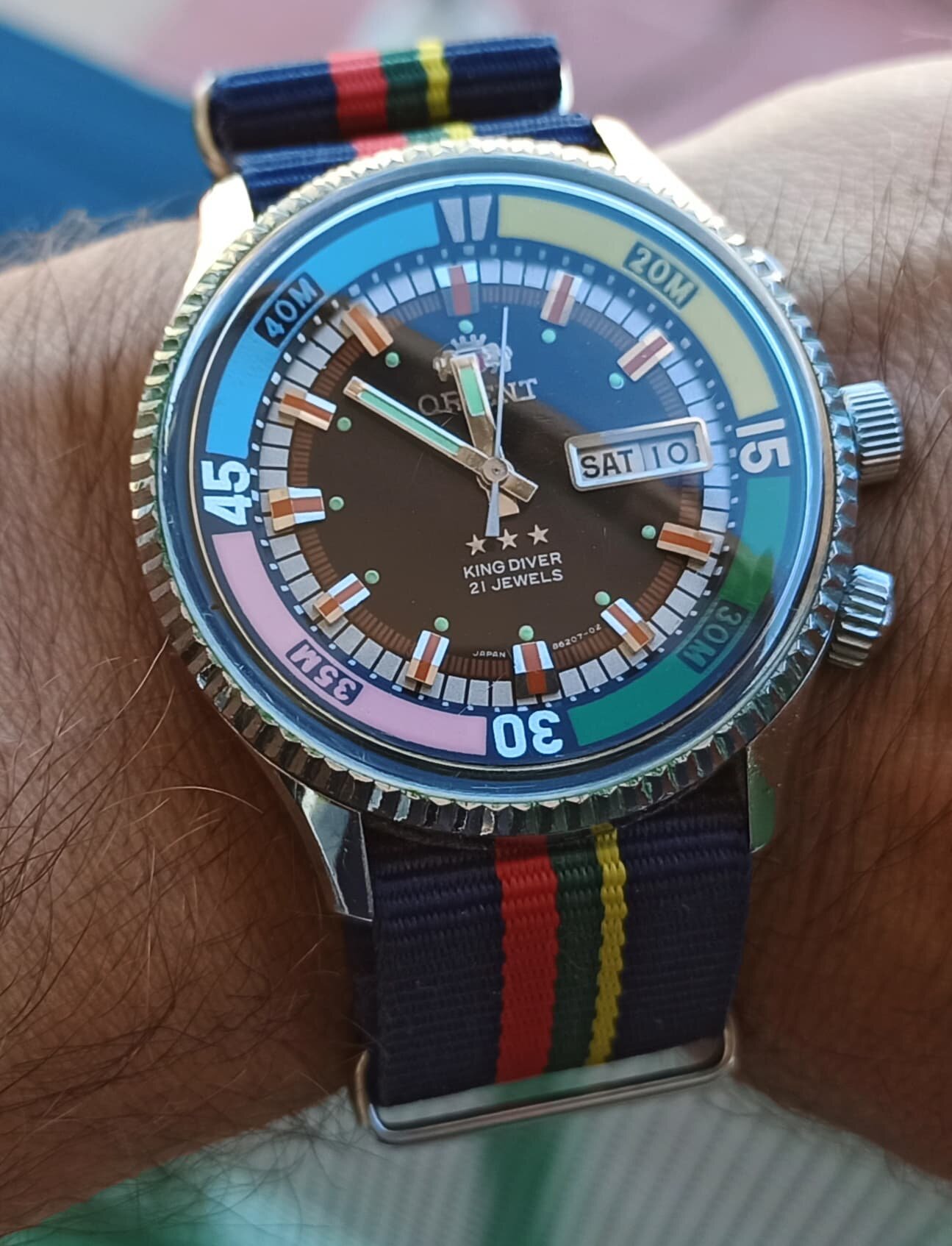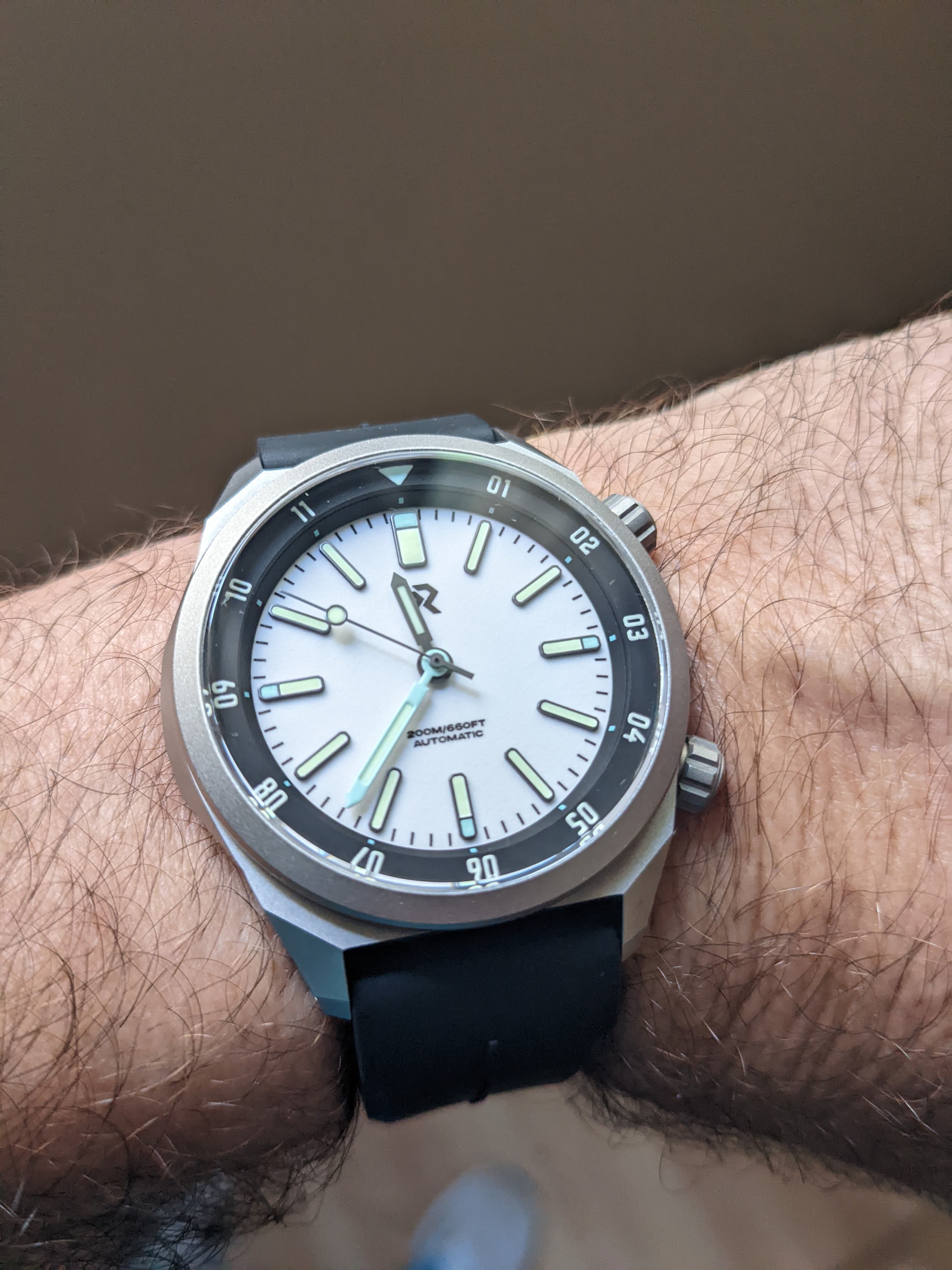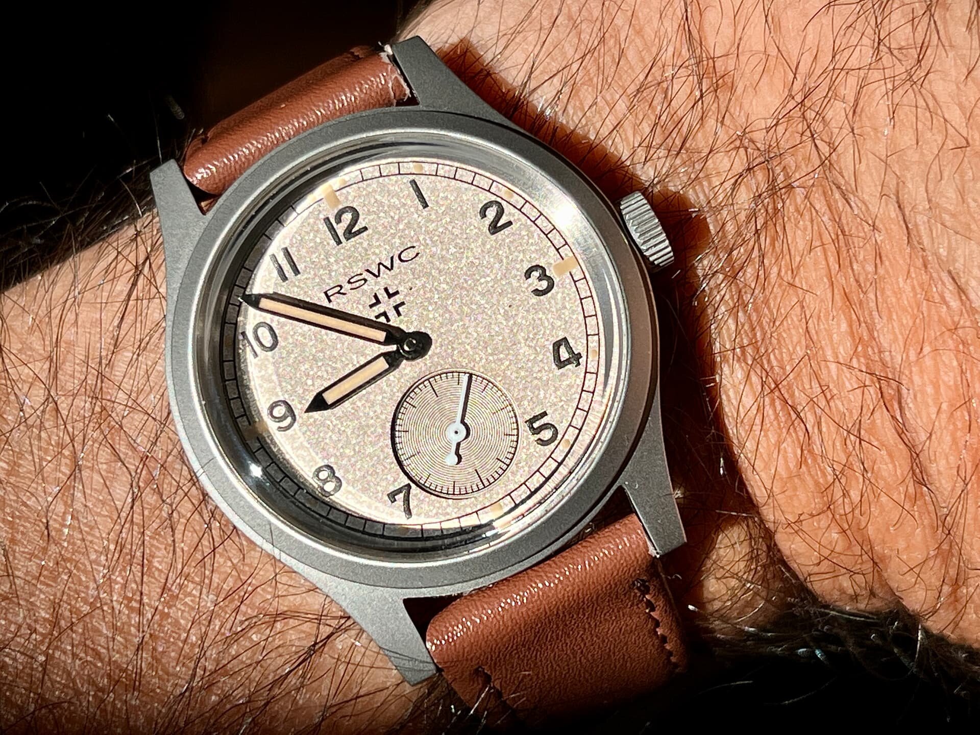 Probablemente el reloj más infravalorado de la ya mítica firma RSWC, el “Goldmaster”, con una relación calidad-precio insuperable, con un bisel finisimo con un tacto perfecto y sin holguras, un lumen de escándalo, índices aplicados, manecillas tipo Mercedes y el movimiento de Seiko NH35 que no será el más caro ni el más sofisticado ni el más bonito pero es duro y fiable como pocos.