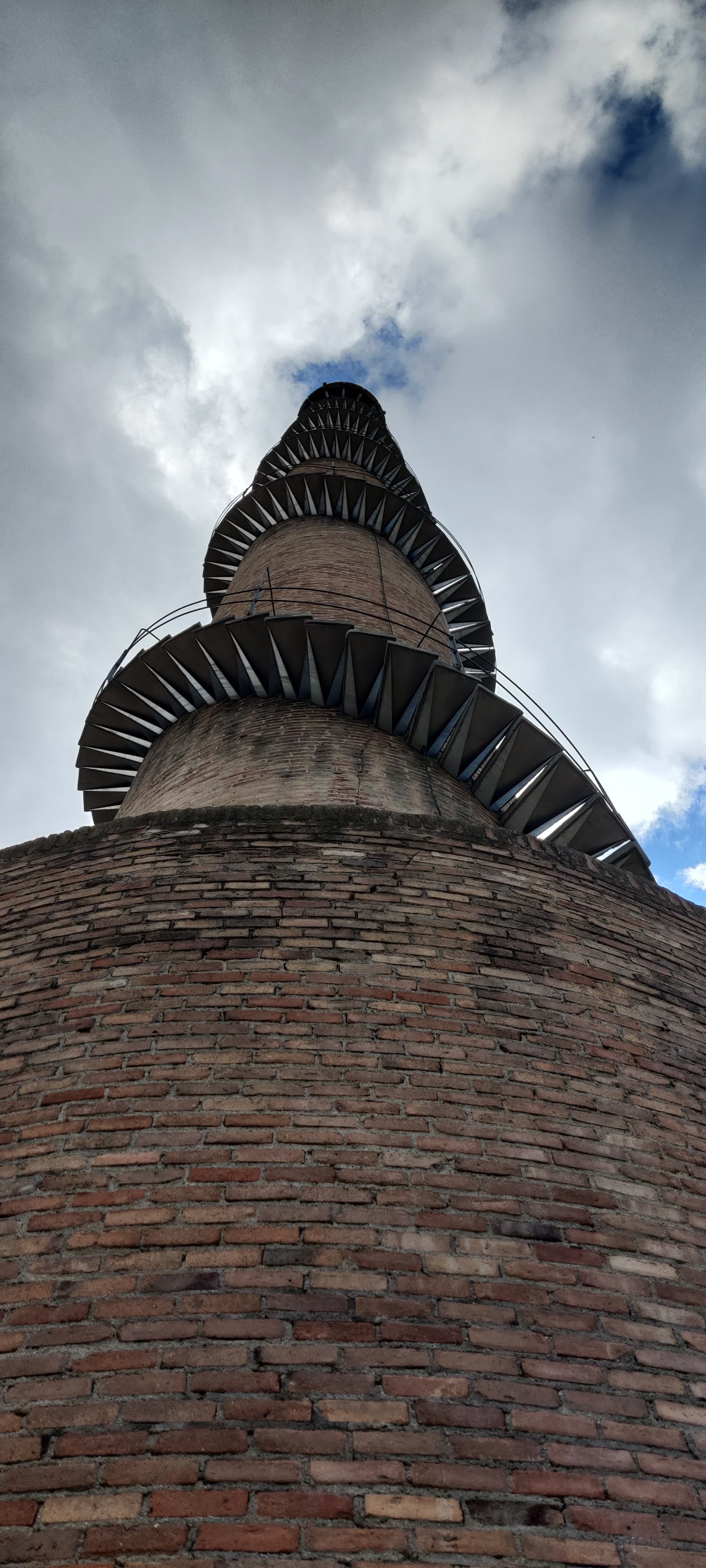 Bueno, aquí frente a la chimenea Almirall, de la antigua bòbila Almirall, ya desaparecida, donde se cocían ladrillos, pero se conservó la chimenea. Ésta, se construyó en 1956 ante la demanda, por el gran auge en la construcción de viviendas en Terrassa y comarca. Tiene el record Guinness de ser la chimenea con la escalera de caracol más alta del Mundo.
