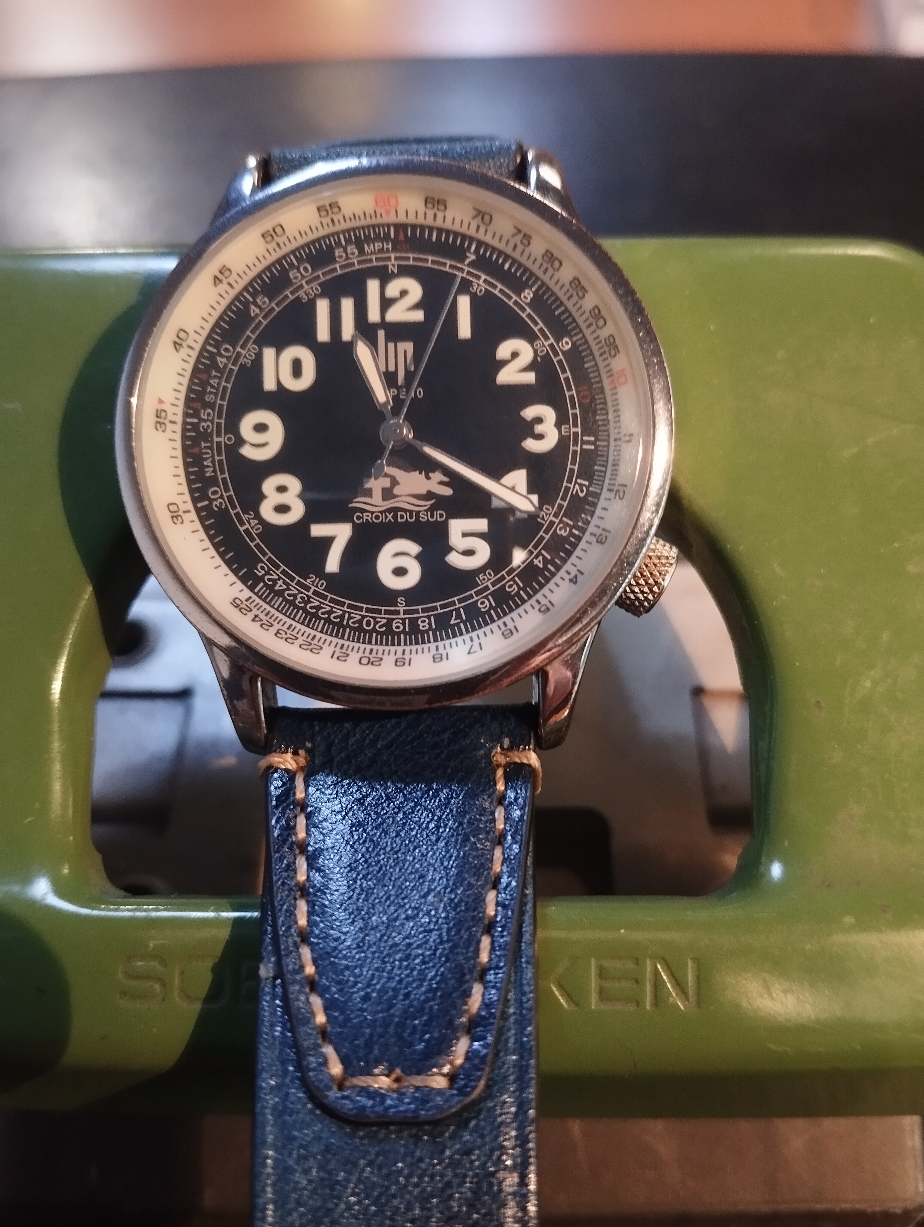 Por la mañana, este reloj Lip de cuarzo, ambientación aérea, que me ha costado 17 pavos!!! En cash converters. Eso sí, ha precisado cambio de pila y de correa.