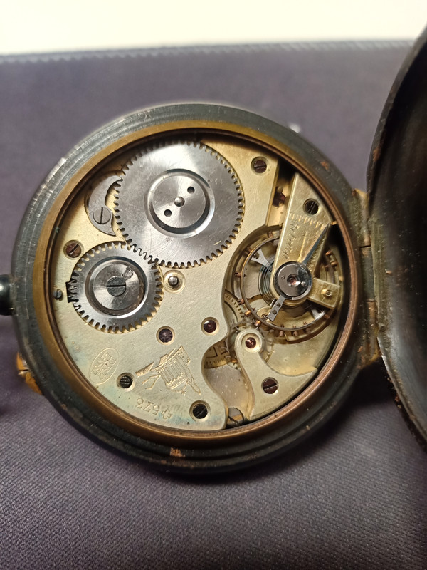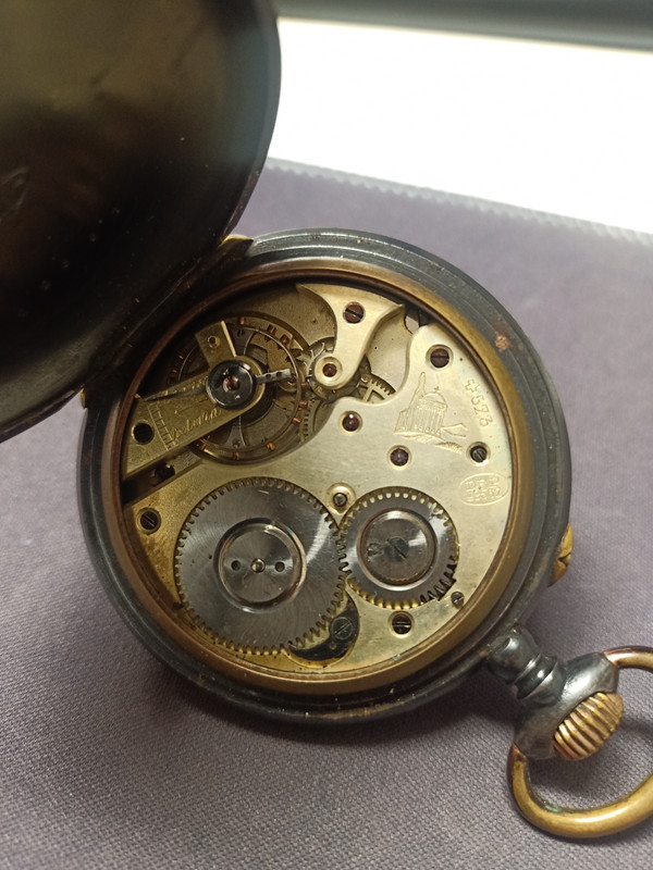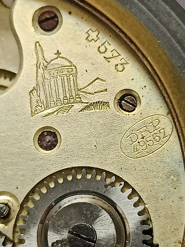 El número con las letras DRP es el de una patente alemana ( Deutsches Reichspatent) n.º 49567, otorgada a L. Marillier-Denzler en 1889. Se encontraba en Neuveville, Cantón de Berna, Suiza, y la patente se relaciona con el mecanismo de visualización de un reloj de bolsillo, en este caso de horas saltantes. La patente suiza 573 con la cruz, también fue otorgada a Henri Jaccard en 1889 y era exactamente para lo mismo. Por lo visto, estos dos fabricantes querían mantener bien protegida su patente. El fabricante de tu reloj, y que su sello es el del templo, corresponde a la marca registrada de Louis Marillier-Denzler situada en Quai du Bas 92 en Biel.