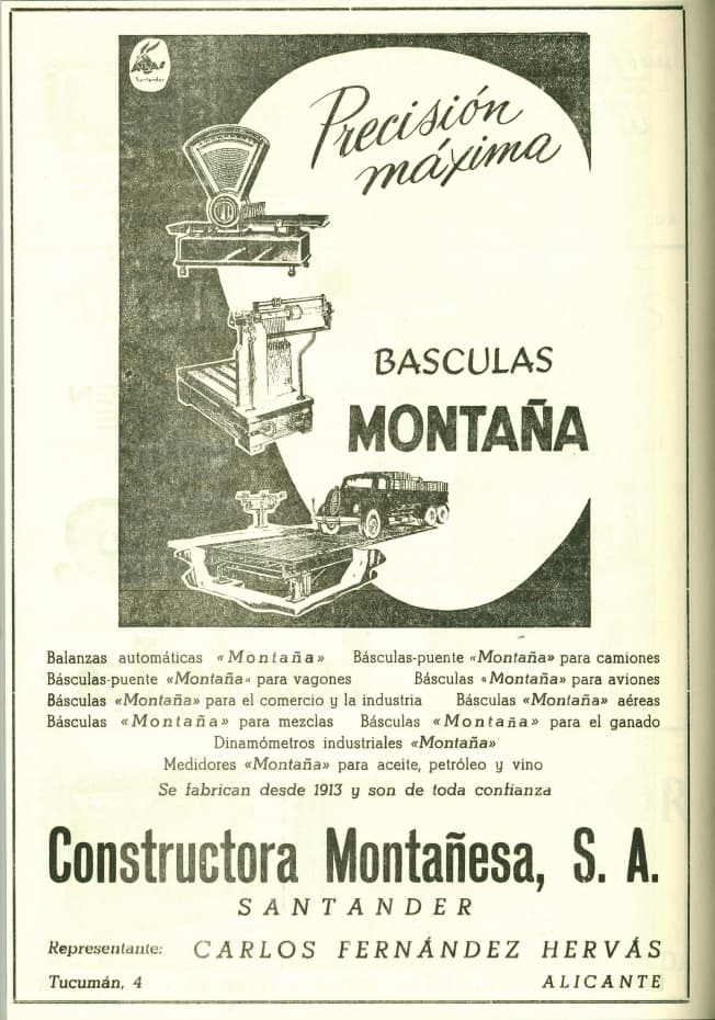 La nueva fábrica incluía todos los adelantos y permitirá a Constructora Montañesa S.A. convertirse en líder de su sector, fabricando todo tipo de básculas para la industria y para el comercio; desde las automáticas, hasta las de pesar sacos, bocoyes, ganado vivo o muerto, pasando por las básculas puente para vagones y camiones. En este breve anuncio aparecido en El Cantábrico, 15 de junio de 1924, podemos ver ya la variedad de aparatos que se ofrecían.