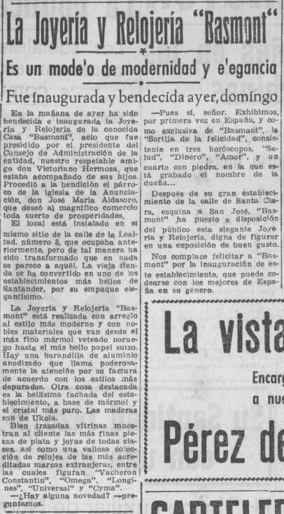 Por el otro, la apertura de unos establecimientos de venta al público de todo tipo de artículos para el hogar, pequeños electrodomésticos y menaje, bajo el nombre Basmont (acrónimo de “Básculas Montaña”). La primera de estas tiendas se abrirá en diciembre de 1949 en el número 3 de la reconstruida calle Lealtad (había sido pasto de las llamas en el incendio de Santander de 1941). En la Hoja del Lunes, del 19 de diciembre de 1949 aparecía la siguiente nota publicitaria presentada como si de una crónica de sucesos se tratara.
