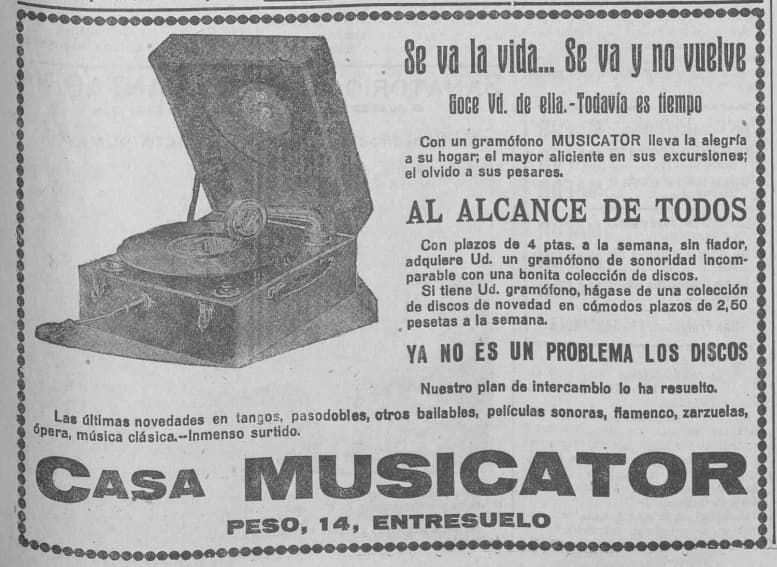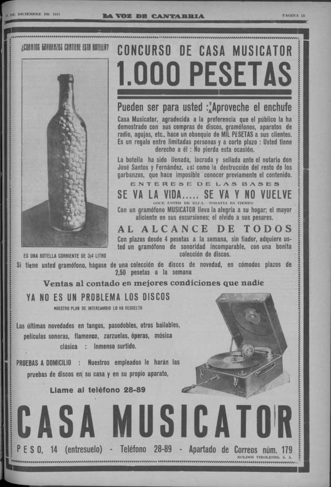 Las cosas van bien y la empresa empieza a mostrar interés en otros sectores. Encontramos también en el BOPI una nota por la que se le concede en marzo de 1932 el registro de Casa Musicator, un establecimiento destinado a la venta y fabricación de gramófonos, aparatos de radio, discos y toda clase de aparatos musicales y que se encontraba en la calle del Peso, 14, Santander, aunque ya se pueden encontrar anuncios de ese negocio en 1931, como este breve aparecido en La Voz de Cantabria del 19 de julio de 1931,