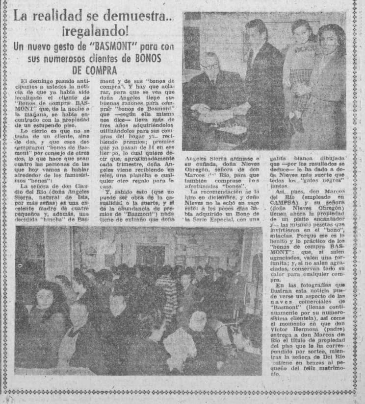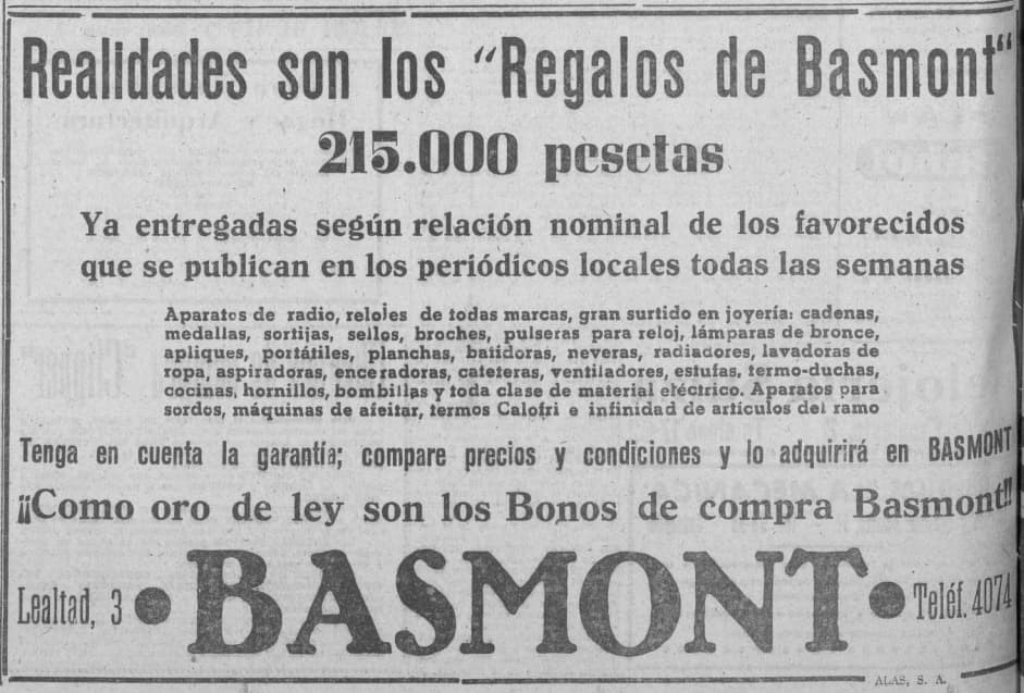 Los años 50 verán una expansión notable de este nuevo sector del negocio (quizás se podría considerar que la experiencia con Casa Musicator fue una especie de antecedente a esta idea), con un listado de productos cada vez más amplio. Con la marca Basmont se venderán desde lavadoras a batidoras y como veremos, con los años el nombre “Basmont” será un habitual en el paisaje santanderino. Otro detalle característico serán los bonos de sorteo Basmont. Al más puro estilo del foro, los premiados se elegían según el sorteo de la ONCE y los menos afortunados podían descontar el precio del boleto de sus futuras compras, todo ello enmarcado con el lema “Realidades son los regalos de Basmont”. Los premios fueron creciendo en importancia, si al principio eran de 50, 100 pesetas, o pequeños productos, para el décimo aniversario de Basmont (en 1958) se celebraría a lo grande con un piso como primer premio, y en 1960, un Seat 600.