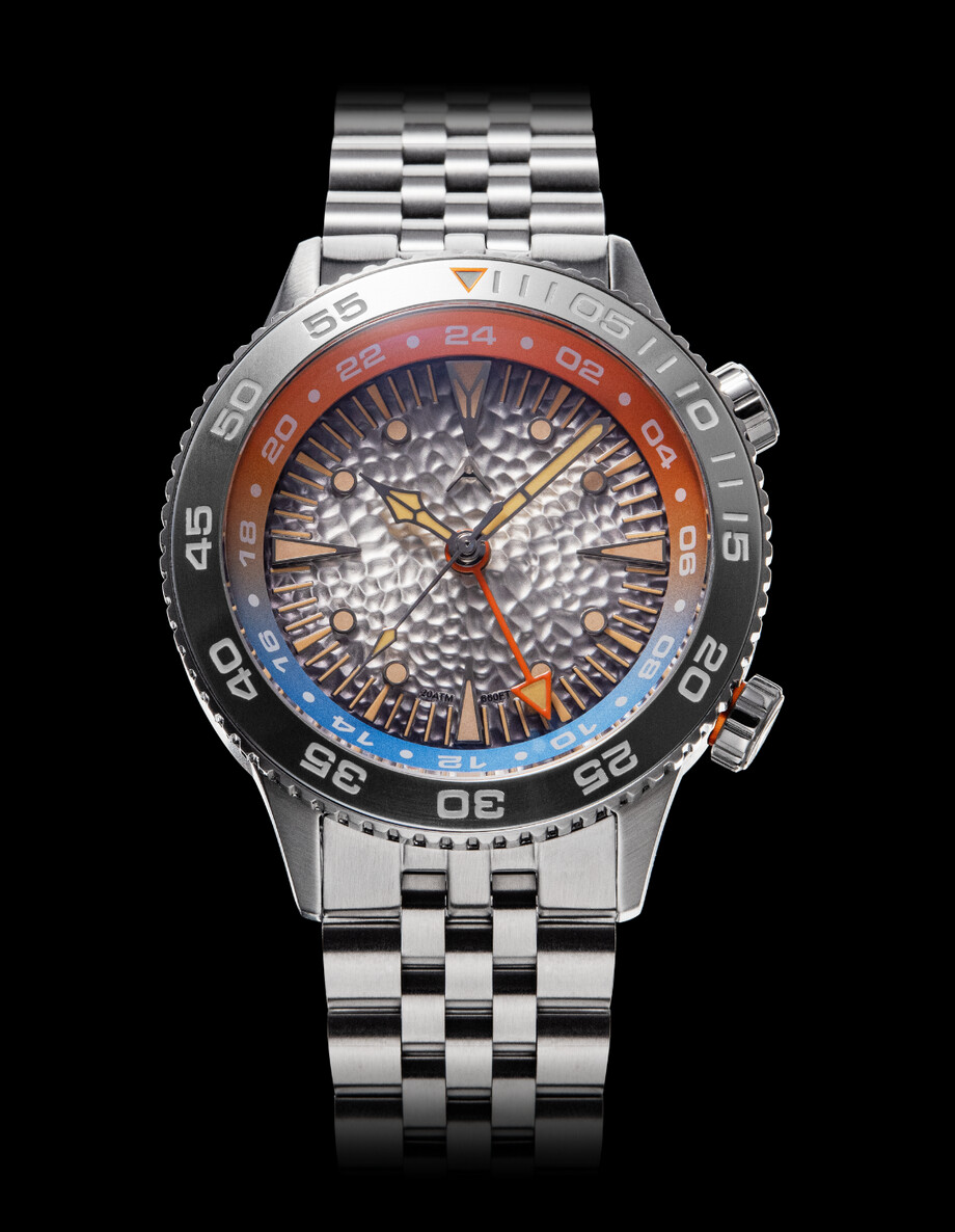 Countycomm 500M Alto Mare 42mm 9075 GMT, igualmente cumple con todo pero el diseño no me termina de cuadrar, ese naranja y las asas.. no sé…