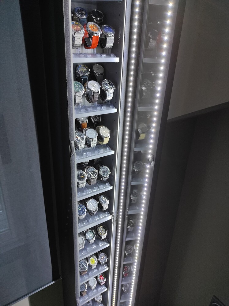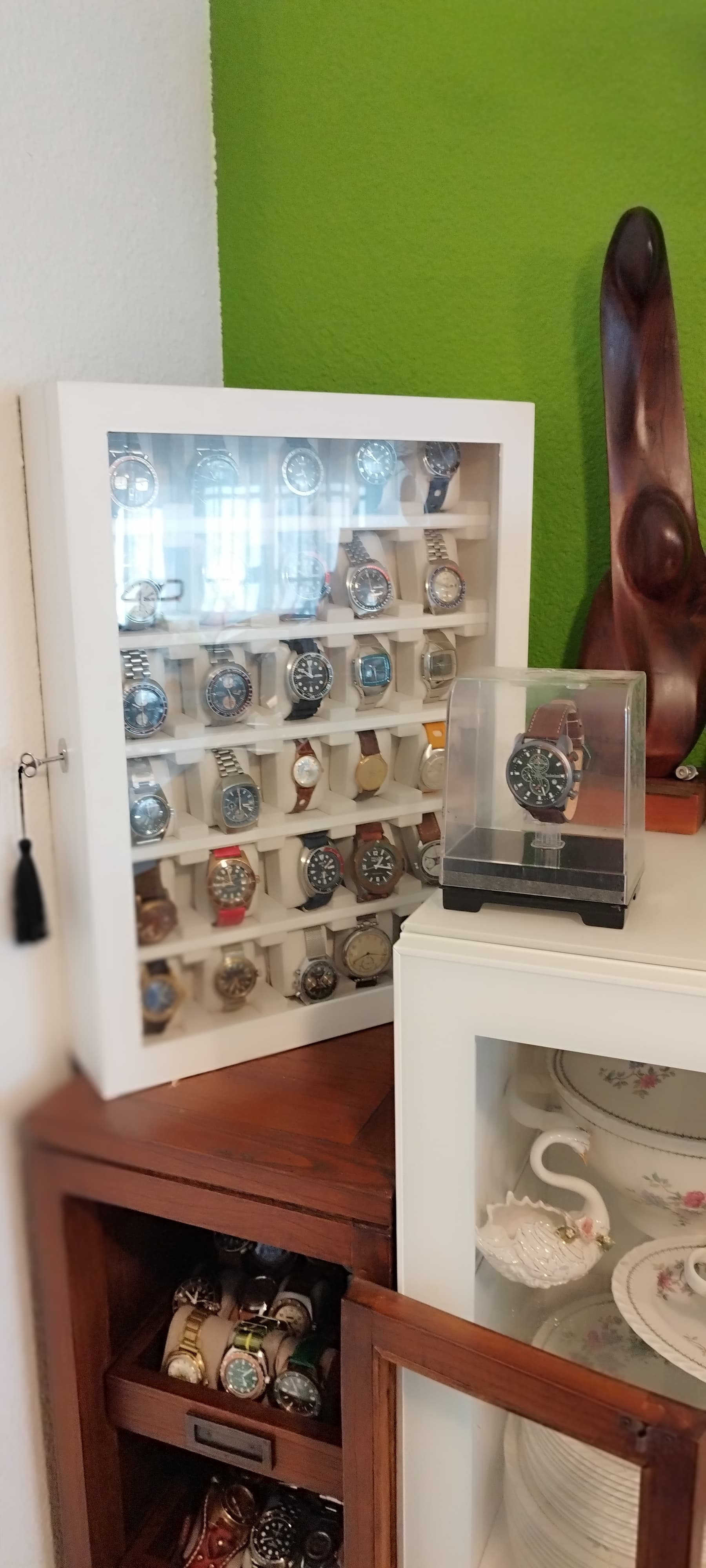 Si tienes sitio en casa y tienes la seguridad de que no te van a echar, compra la vitrina de cabeza, el precio es muy muy bueno, aproximadamente las misma, nuevas, se van por las nubes, incluso en la parte de abajo tiene sitio para almacenar las cajas de los relojes.