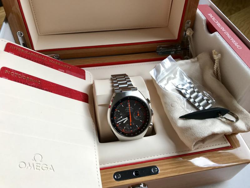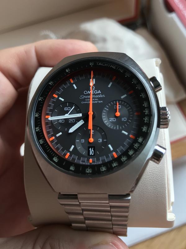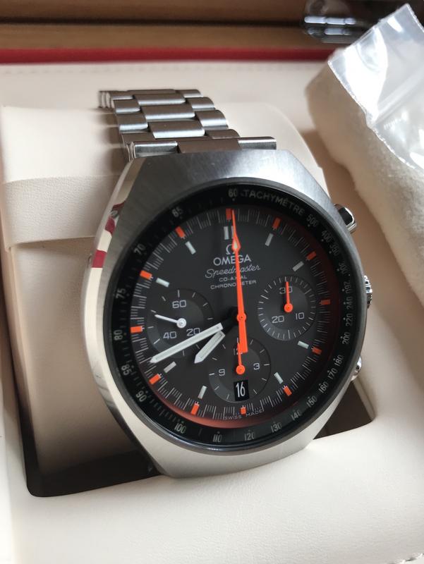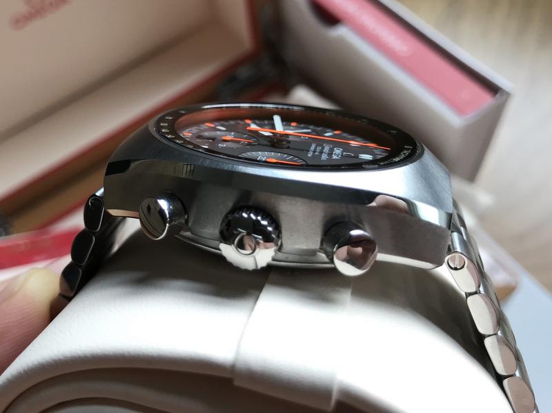 Modelo 327.10.43.50.06.001, tal vez uno de los mas bonitos speedmaster (para mi gusto) y en su versión Racing con unas agujas naranja fluor increíbles que es muy difícil de fotografiar, en directo no tiene nada que ver con las fotos que adjunto por desgracia. Una gran re-edición con sabor vintage. No olvidemos de su increíble brazalete comodísimo y con microajuste de 6 posiciones ni tampoco su anillo interior con superluminova que hace que se ilumine el taquímetro de la esfera.