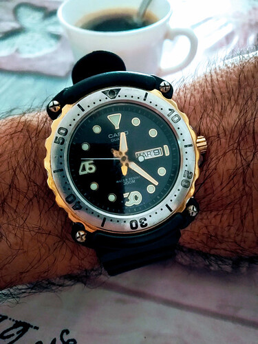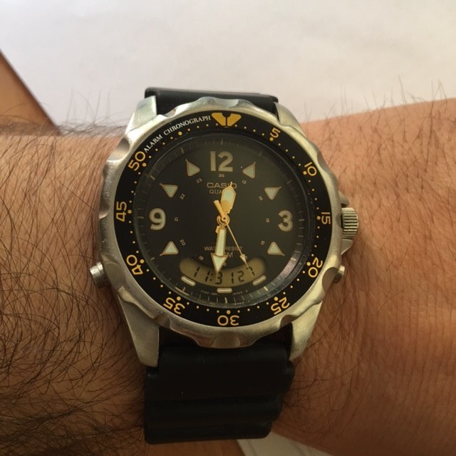 Tengo especial predilección por los modelos más “veteranos” de la marca y medito mucho – a veces- la compra de un modelo u otro, porque además de tenerlos guardados una condición es usarlos de vez en cuando y sobre todo me tienen que gustar. Hoy os presento el AD-711 con el módulo 388. Se trata de un ana-digi tipo diver 200M con caja de acero roscada. El tamaño es pequeño (unos 37 mm, 40 si incluimos la corona), pero es muy llevadero y tiene una terminación y materiales muy buenos.