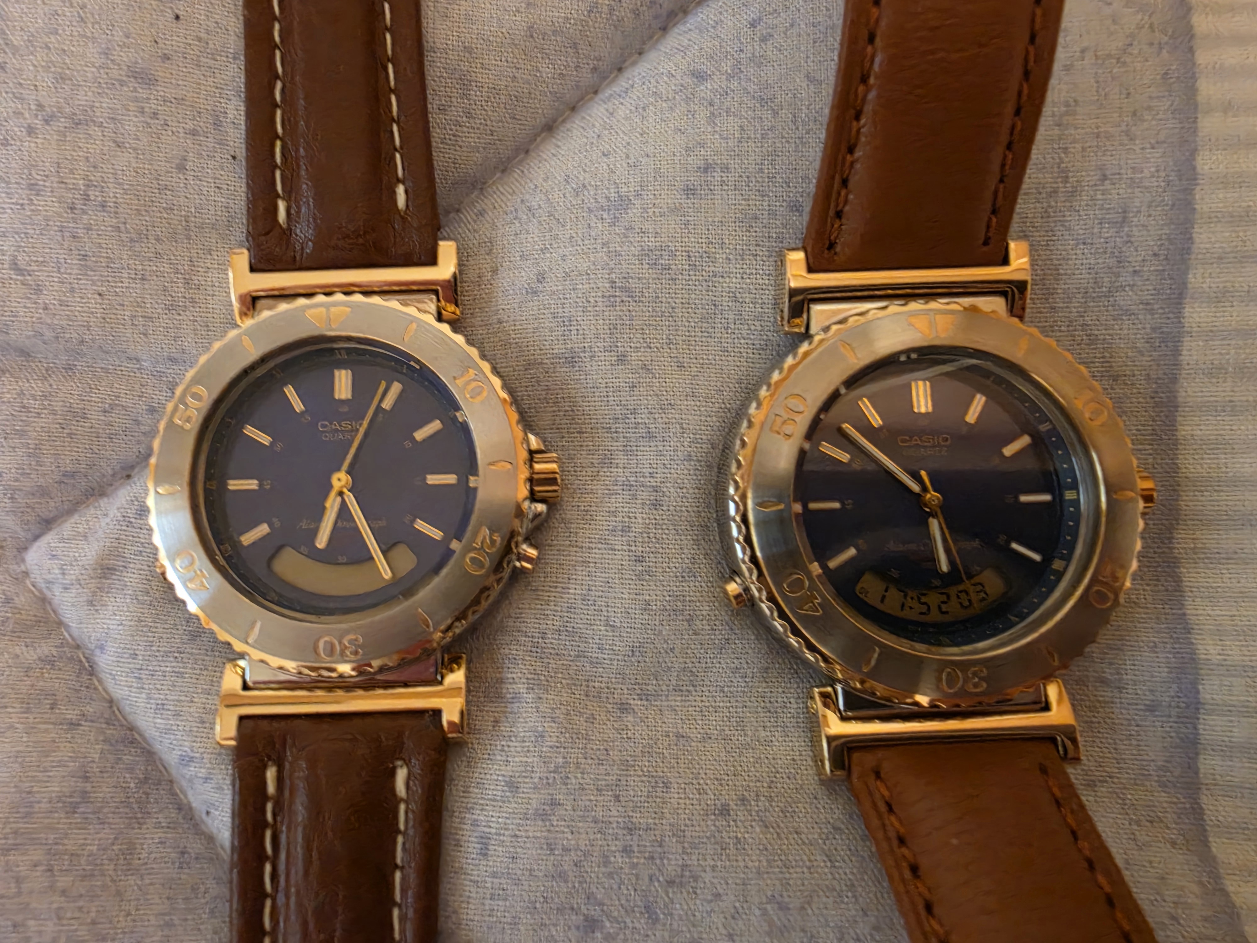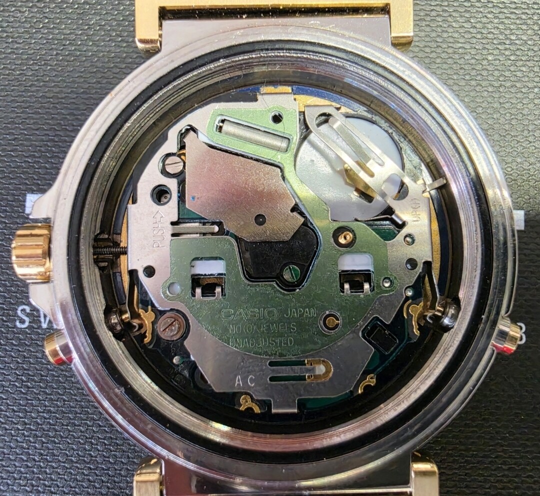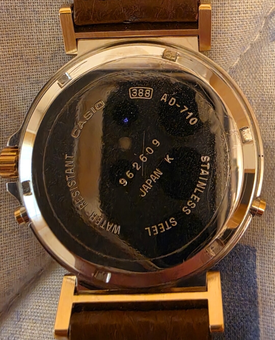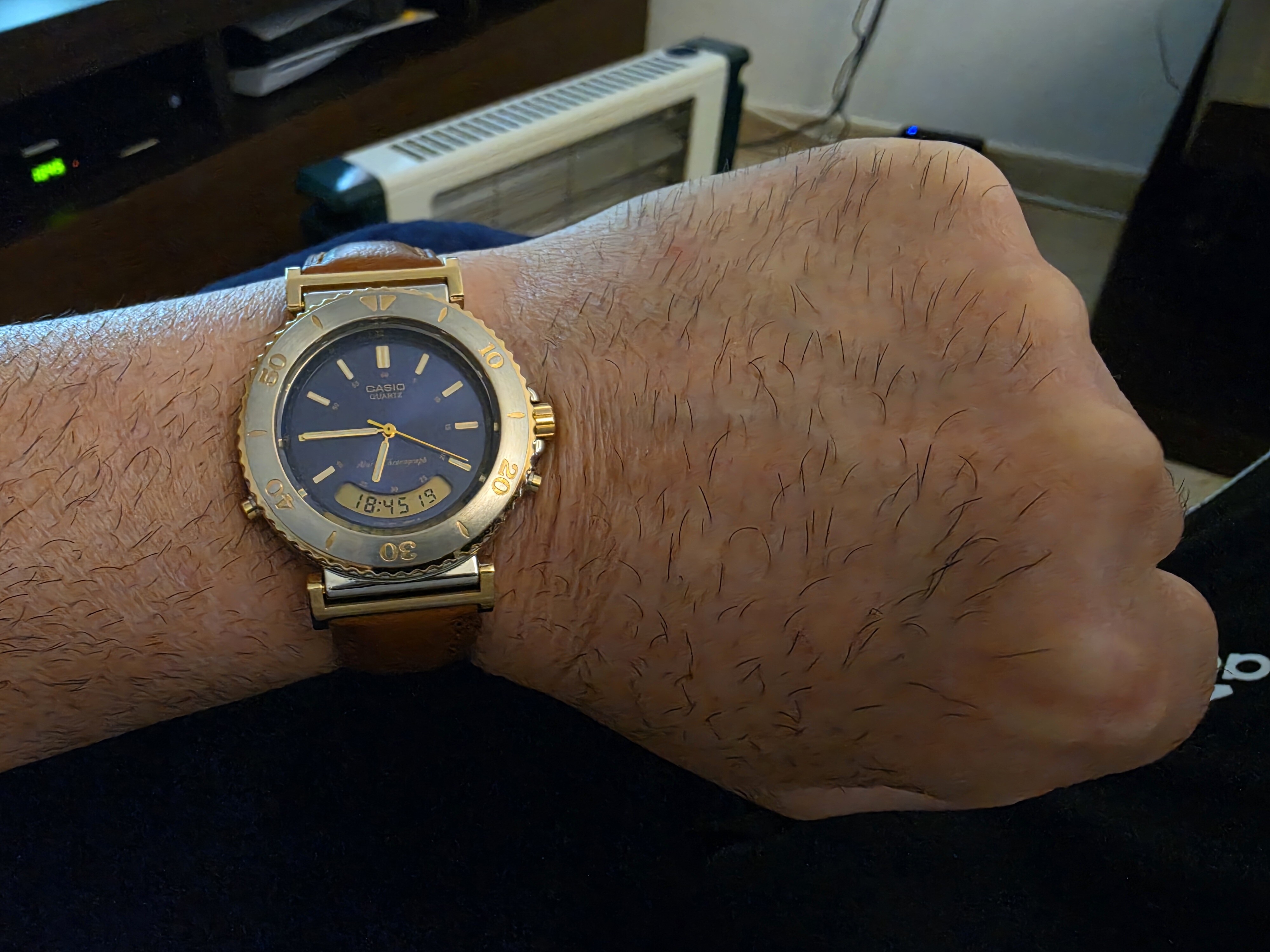 Aunque no es un modelo habitual, tampoco parece un “olvidado” de la marca. La pantalla puede mostrar la hora o bien la fecha, además de mostrar las funciones del reloj que se manejan con solo dos botones: alarma, crono, dual time. Suficiente para las pretensiones del reloj, ya que su punto fuerte es su clasicismo, sus acabados, sus materiales….y lo que trasmite. El reloj no cuenta con luz y el lumen está “agotado” por el paso de los años. Alterna acero pulido y motivos en dorado que están bien combinados: