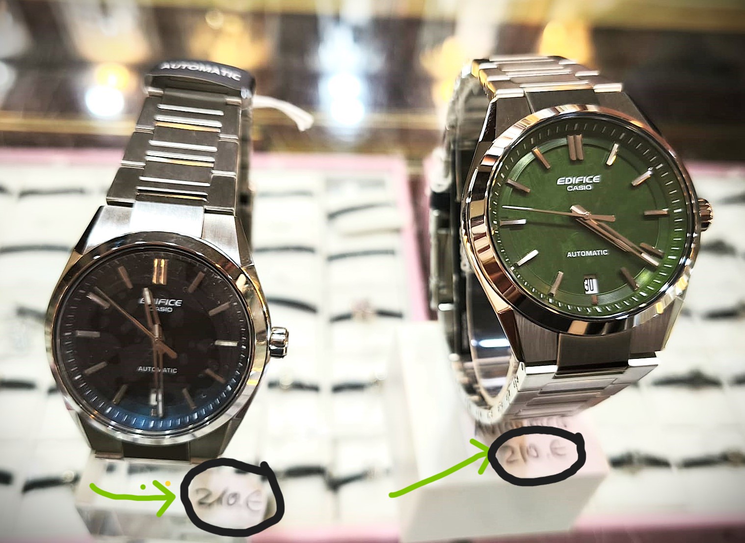 Hoy paseando con un compi, pasamos por una relojería, y vimos los Casio Automaticos, los vimos en otra a unos 270 euros, mas o menos precios como On Line, pero al llegar a esta no pude menos que probarmelo, oye me gusto la sensación y mas el precio. Al final no cometi un pecado por el tamaño, pero me gustaron mucho y su precio : 210€