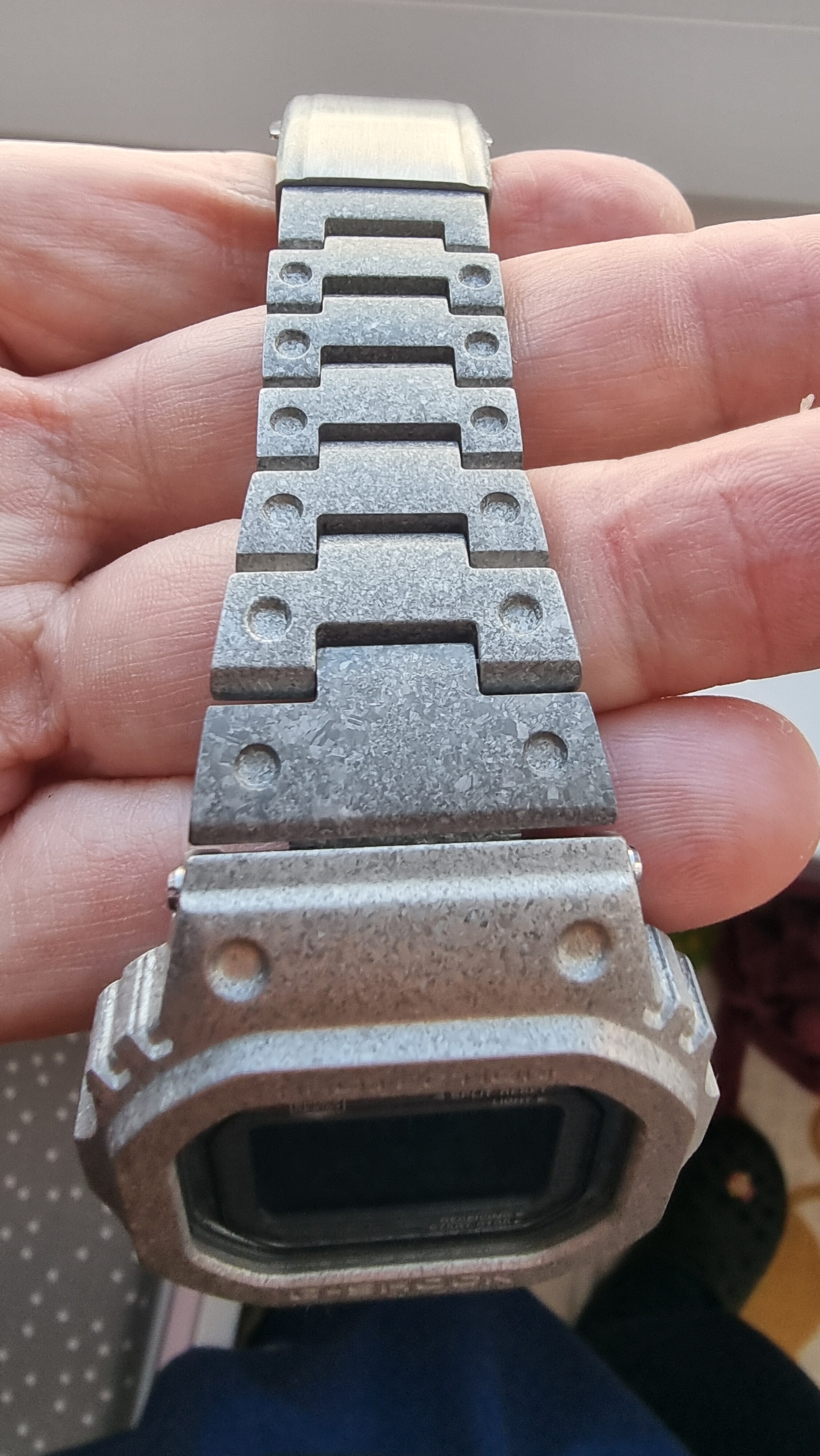 Reloj de edición limitada recristalizado basado en el primer dw-5000, esta revestido de acero inoxidable recristalizado y con endurecimiento de capa profunda. El bisel y la correa estan tratados con chapado ionizado de oro y la tapa trasera con cierre de rosca y revestimiento DLC.