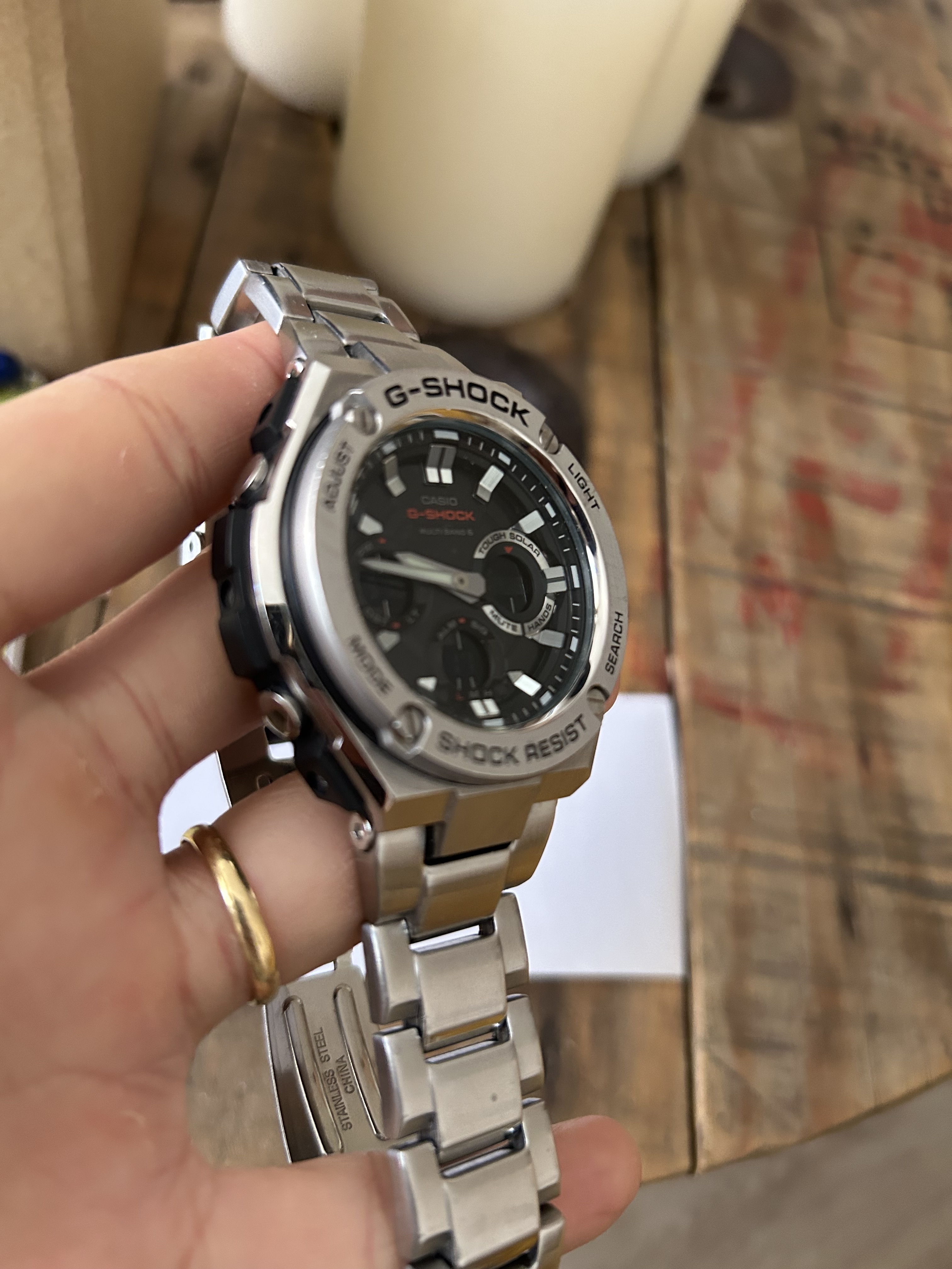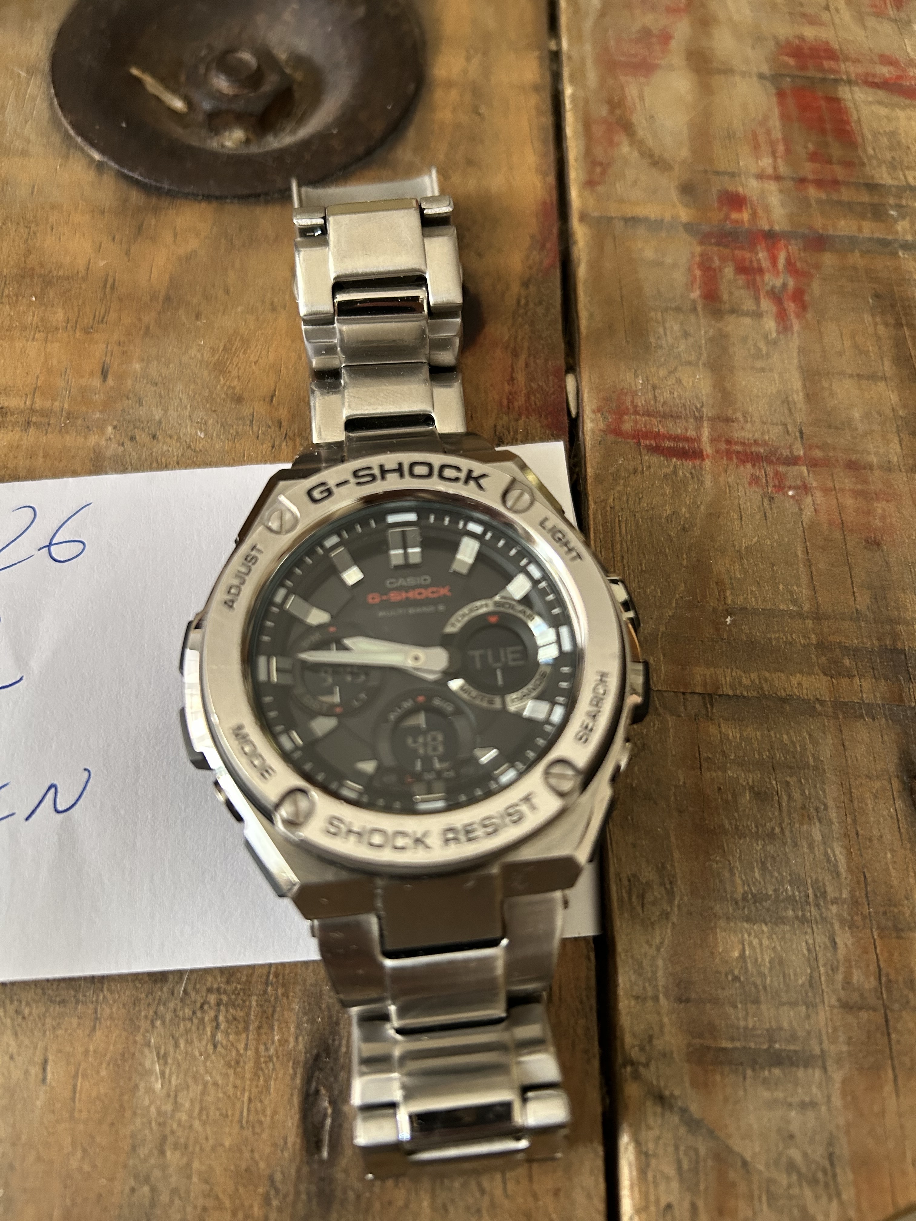 Buenas, otro que tenía por casa y no uso. Casio gst w110 de la gama G steel. Reloj contundente y muy bien construido. Solar y radiocontrolado, de la vieja escuela. Solo dispongo de reloj y Armis para muñecas de hasta 18-18.50 mm. No deseo cambios. Lo dejo en 125 euros envío a parte. Saludo