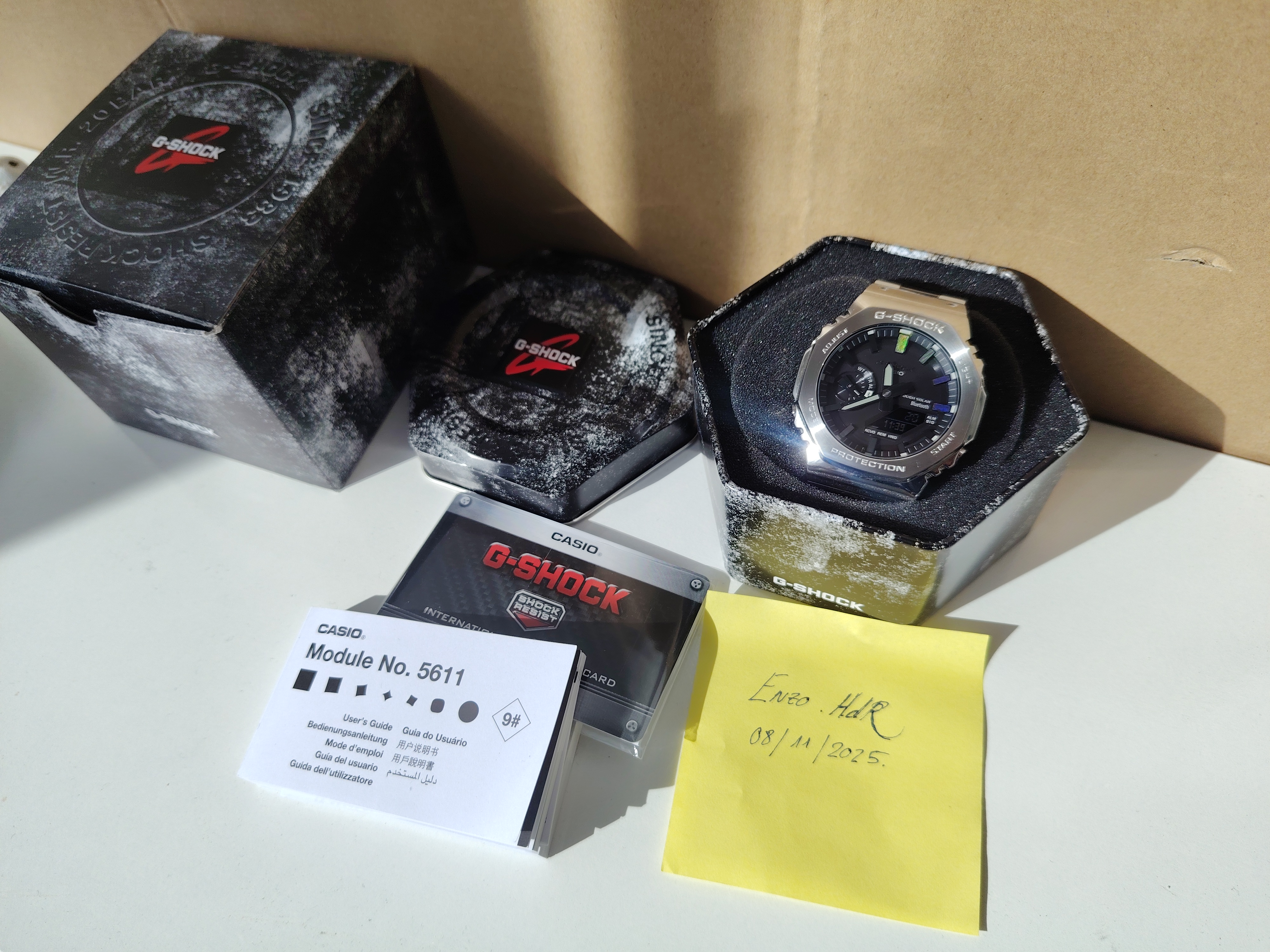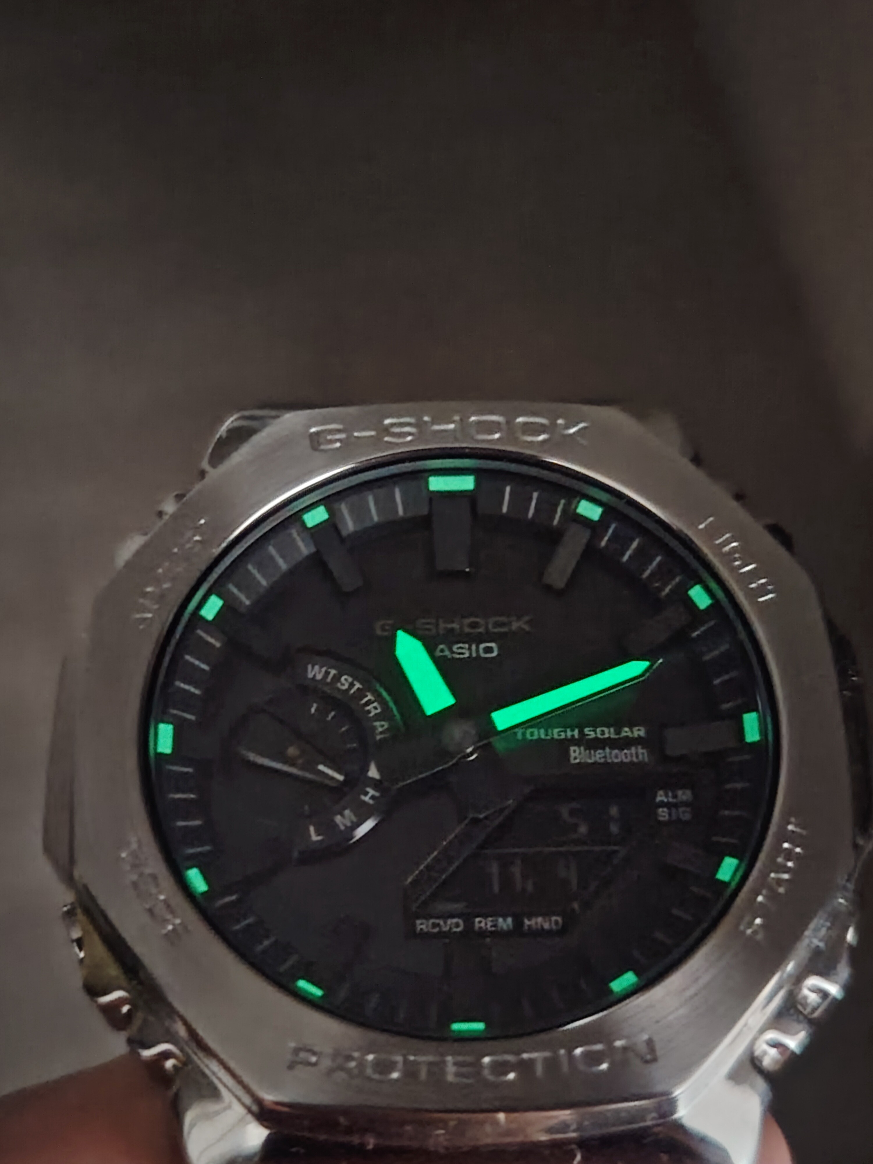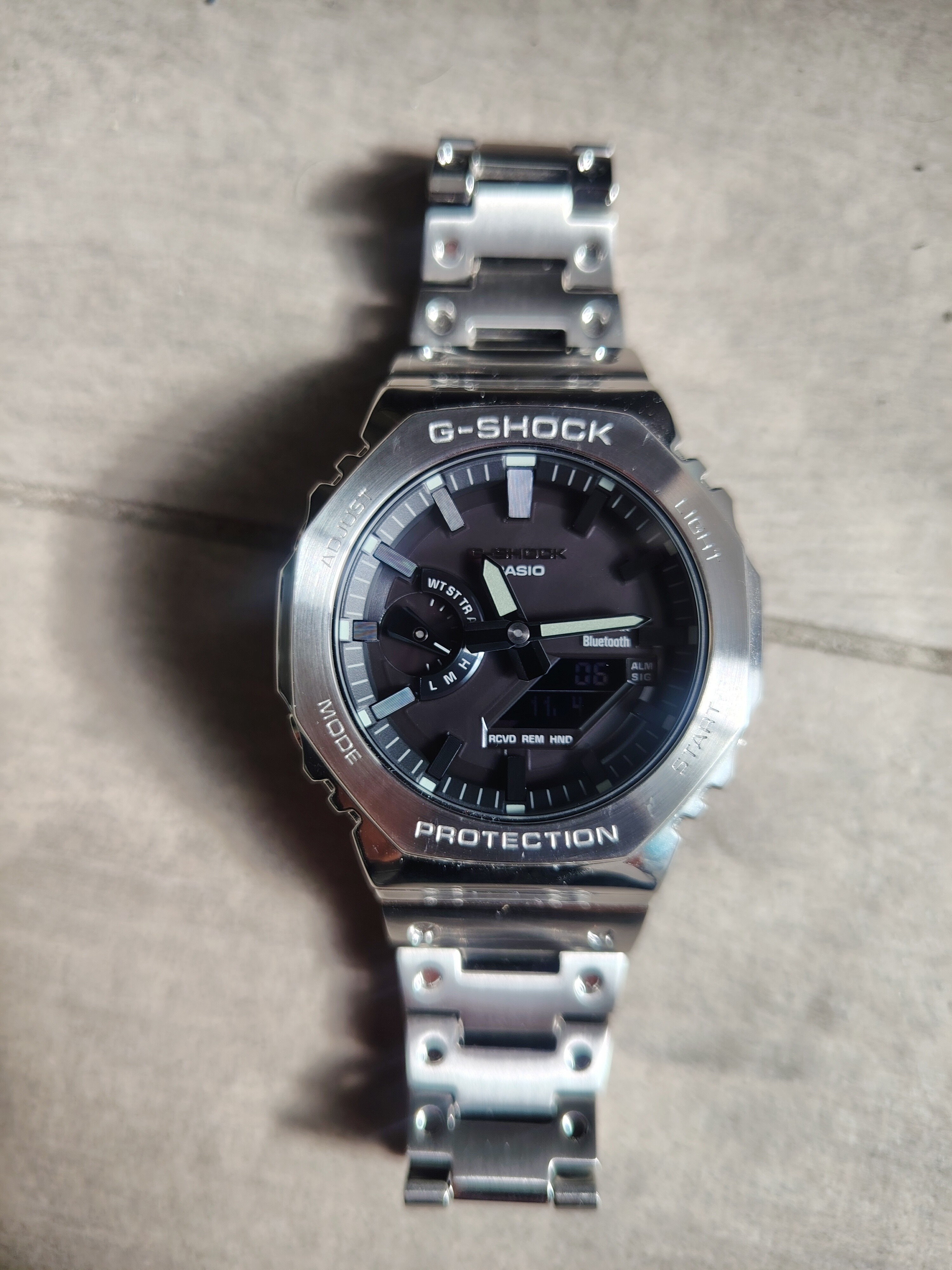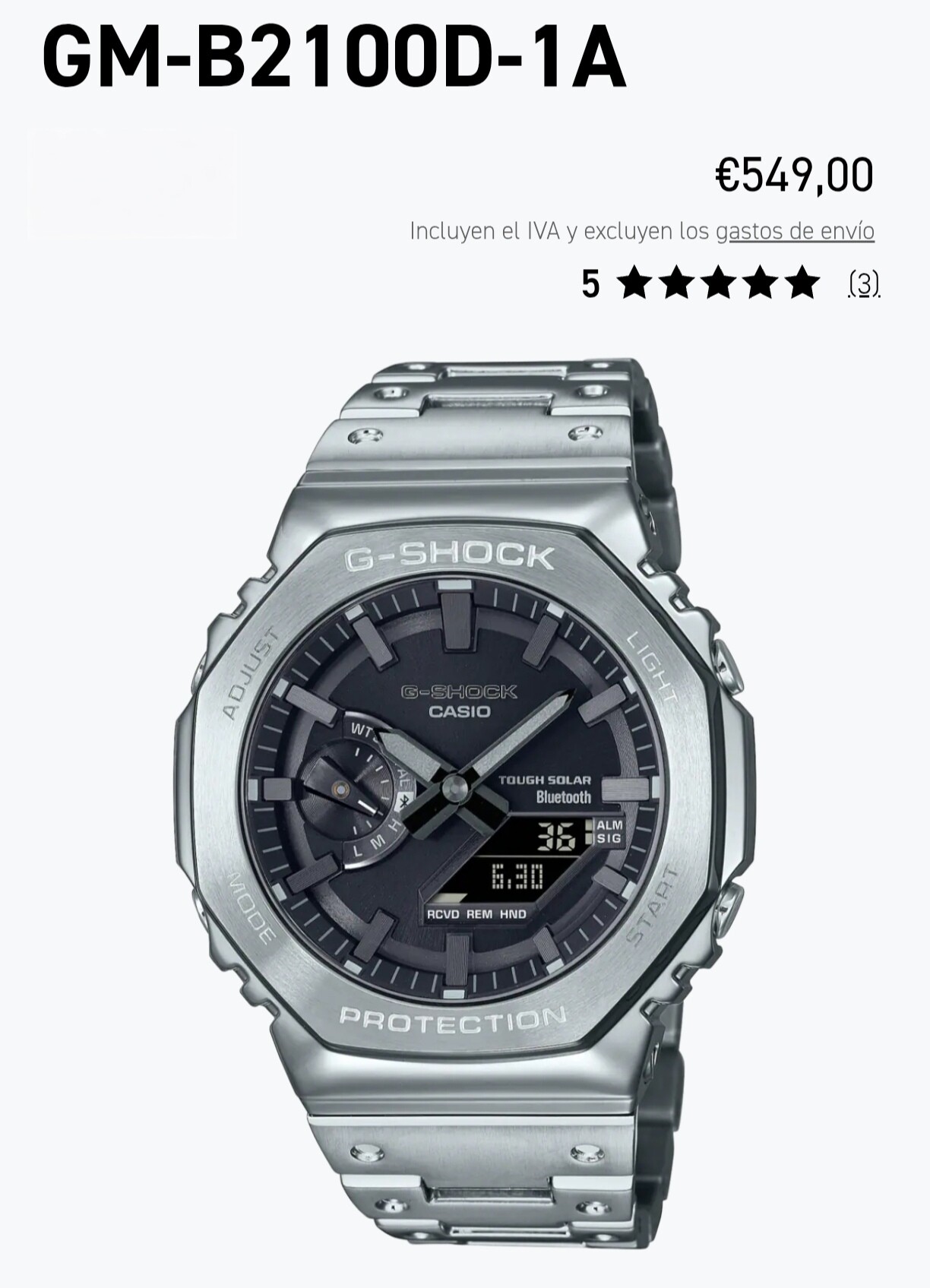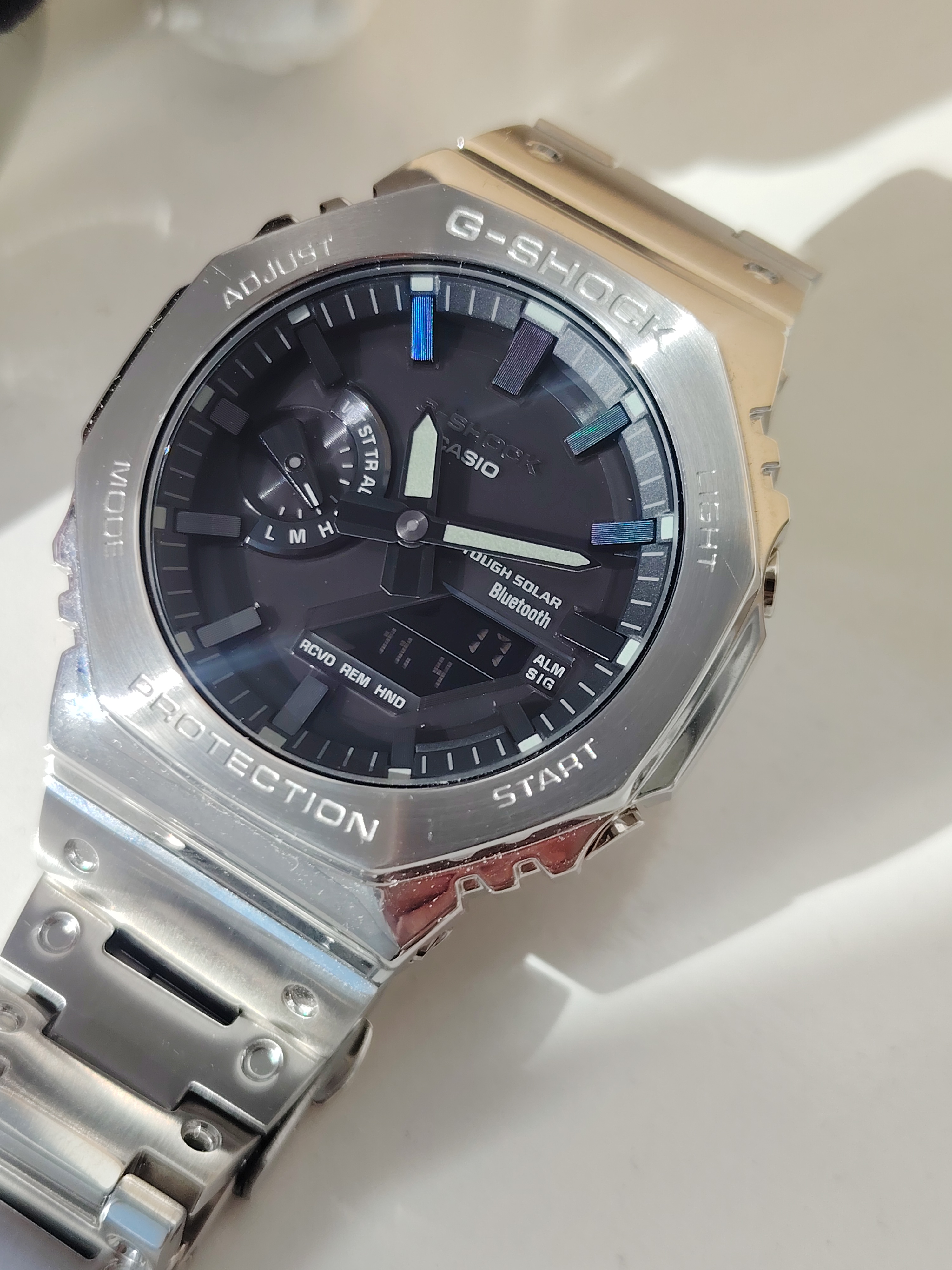 Es el denominado Casio Royal Oak por su parecido, pero a diferencia de tantos mods que se hicieron muchos aficionados cogiendo la base de un 2100 de Resina con tapa de tornillos y poniendole un kit metalico, este es el modelo original de acero completo tal cual fabrica Casio.