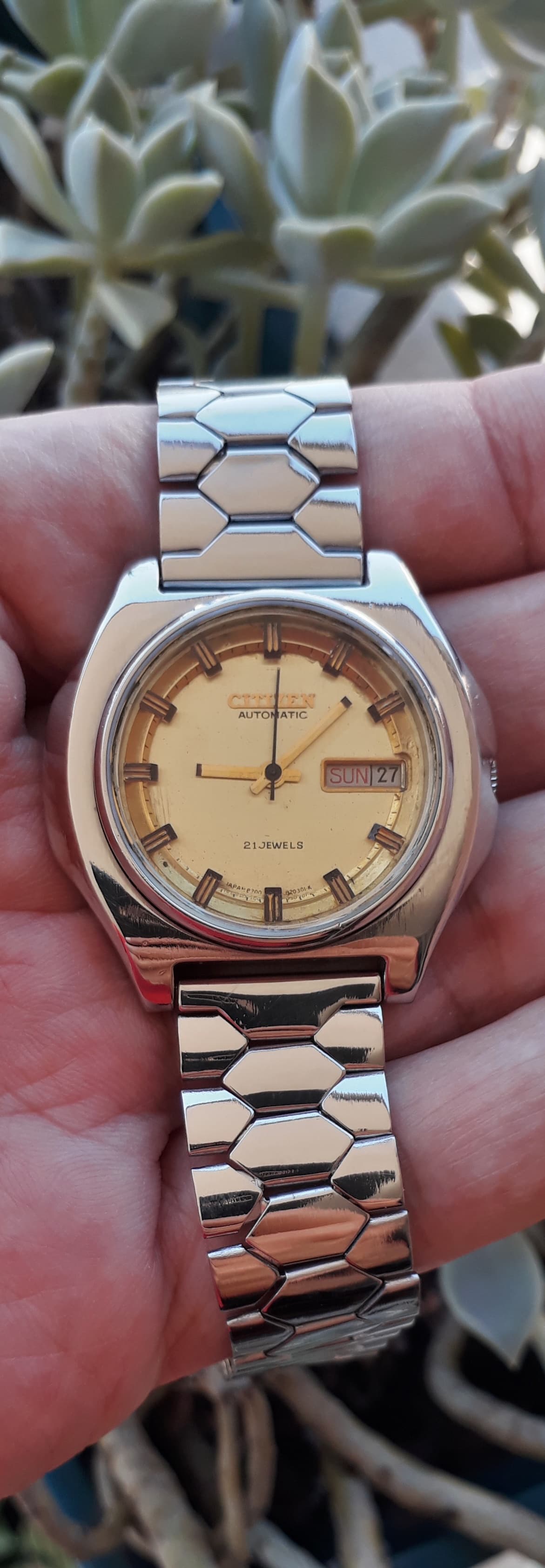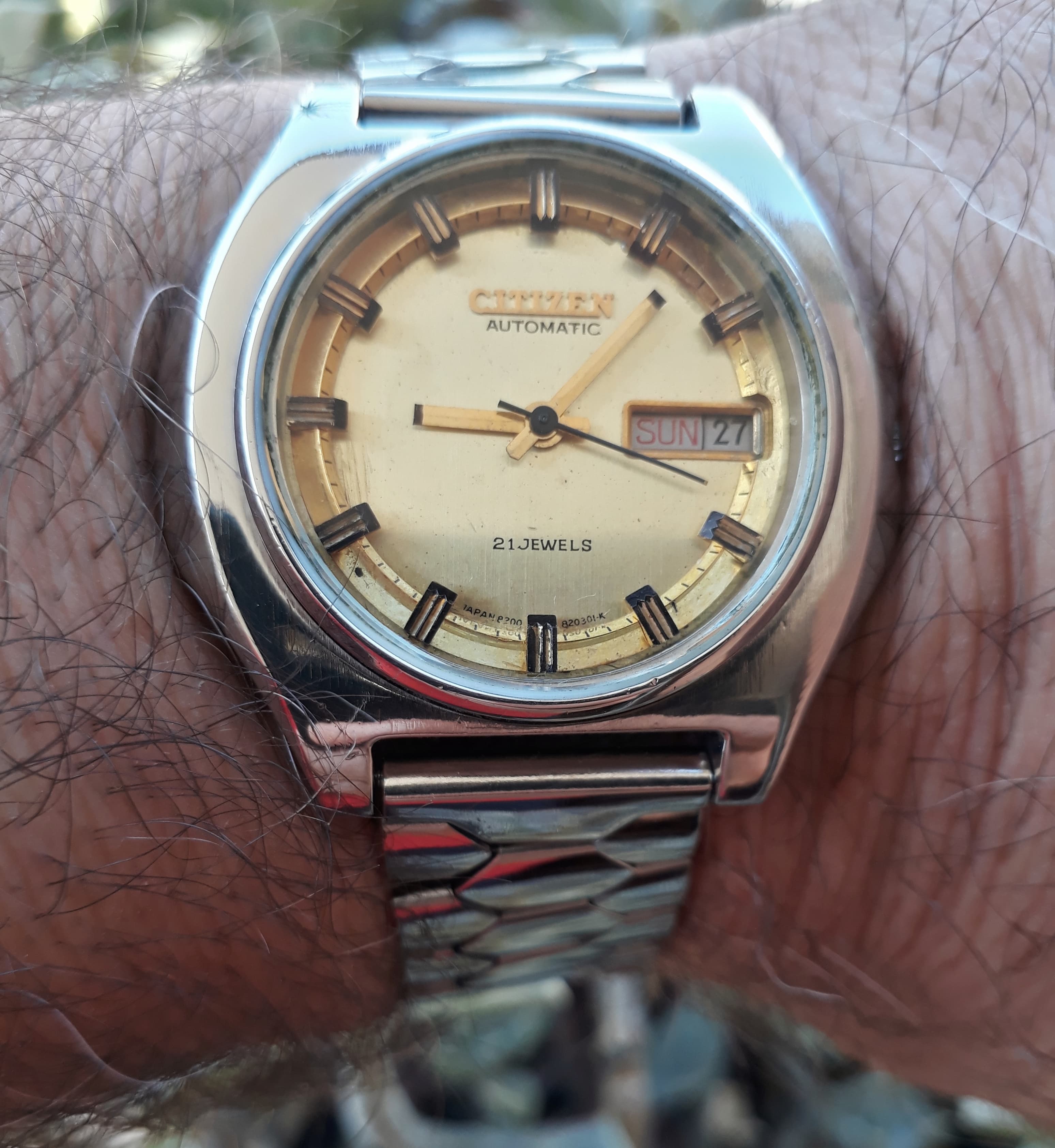 Feliz domingo para todos hoy les comparto,mi Citizen movimiento Miyota 8200,21 joyas,fechador completo a las 3,cristal mineral,permite cuerda manual,todo acero inoxidable, de 1976,restauración propia.