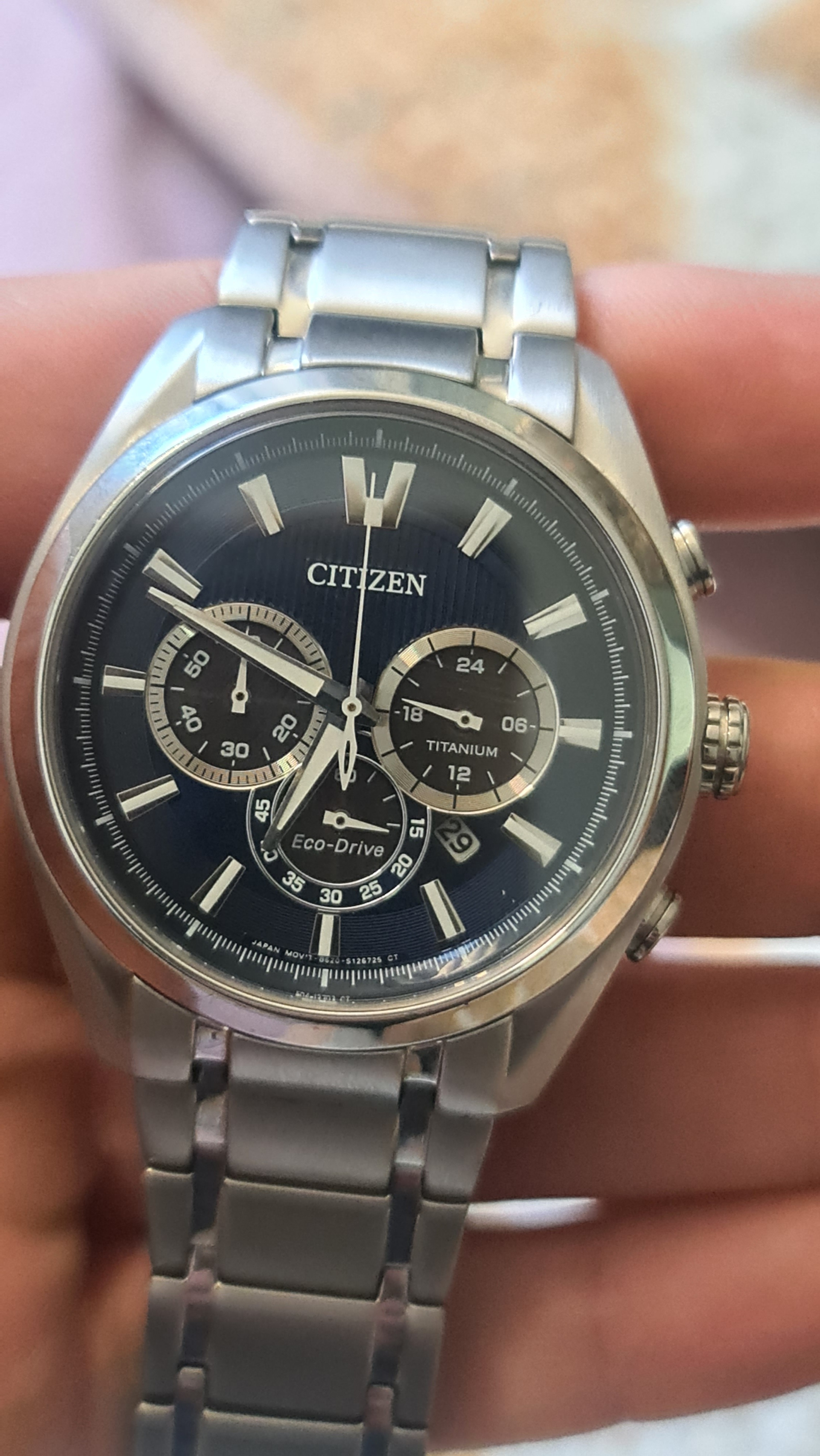Reloj Citizen Super Titanium, Eco Drive B620, 43 mm, Azul, 10 atm, CA4010-58L Cristal zafiro, poco uso , carga solar y cronógrafo. El reloj está impecable se usó muy poco se vende por pasarme al nuevo modelo. Muy leves roces de uso , ver fotos.
