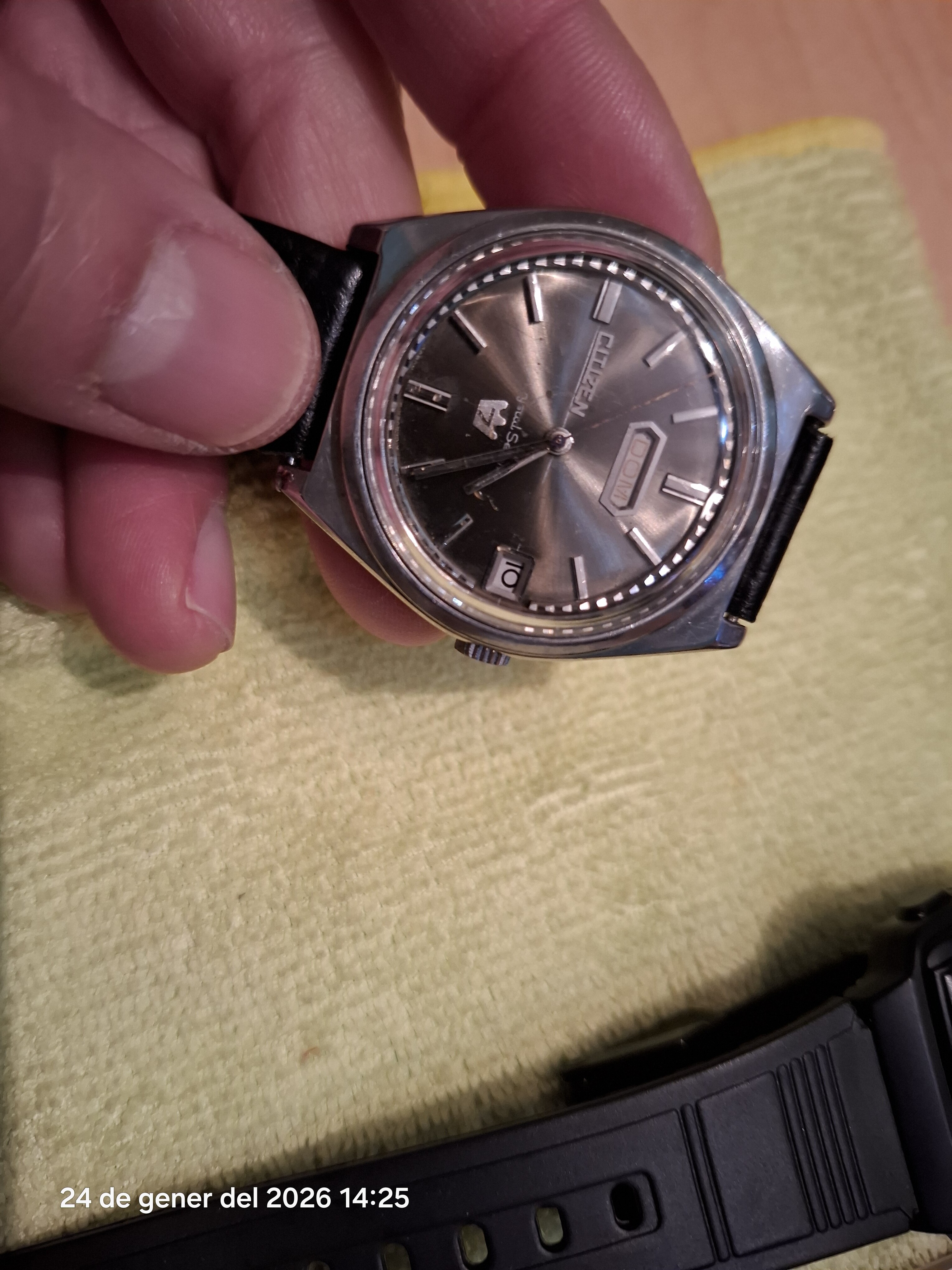 Citizen Vintage. Automático con remonte manual y doble fecha. Plexi,esfera termosolada gris -preciosa-.caja de acero. Correa en piel negra.