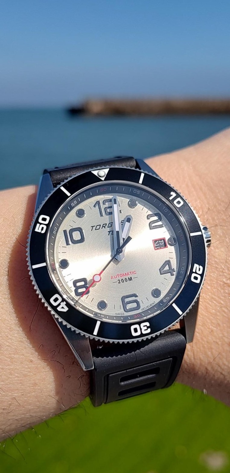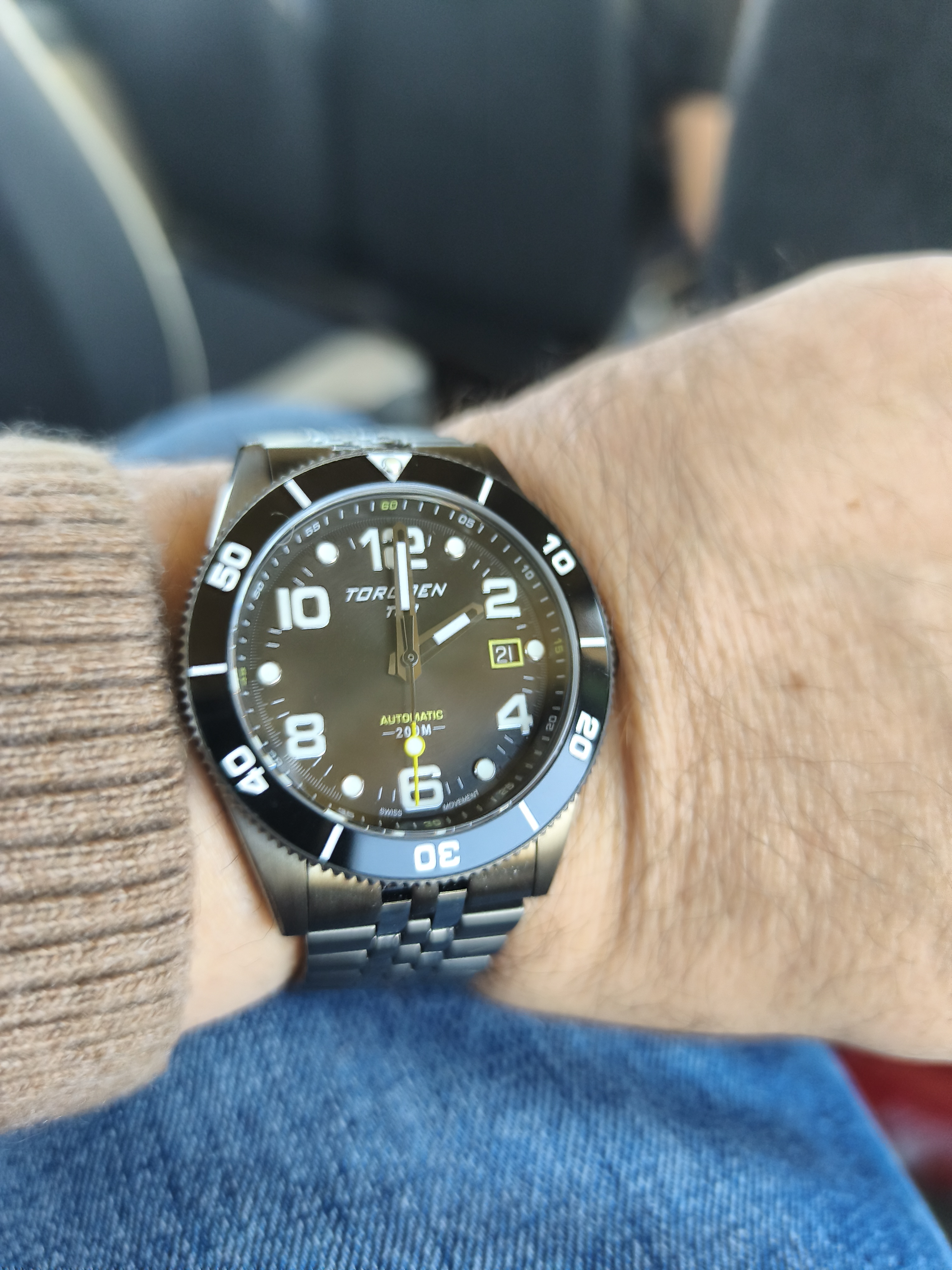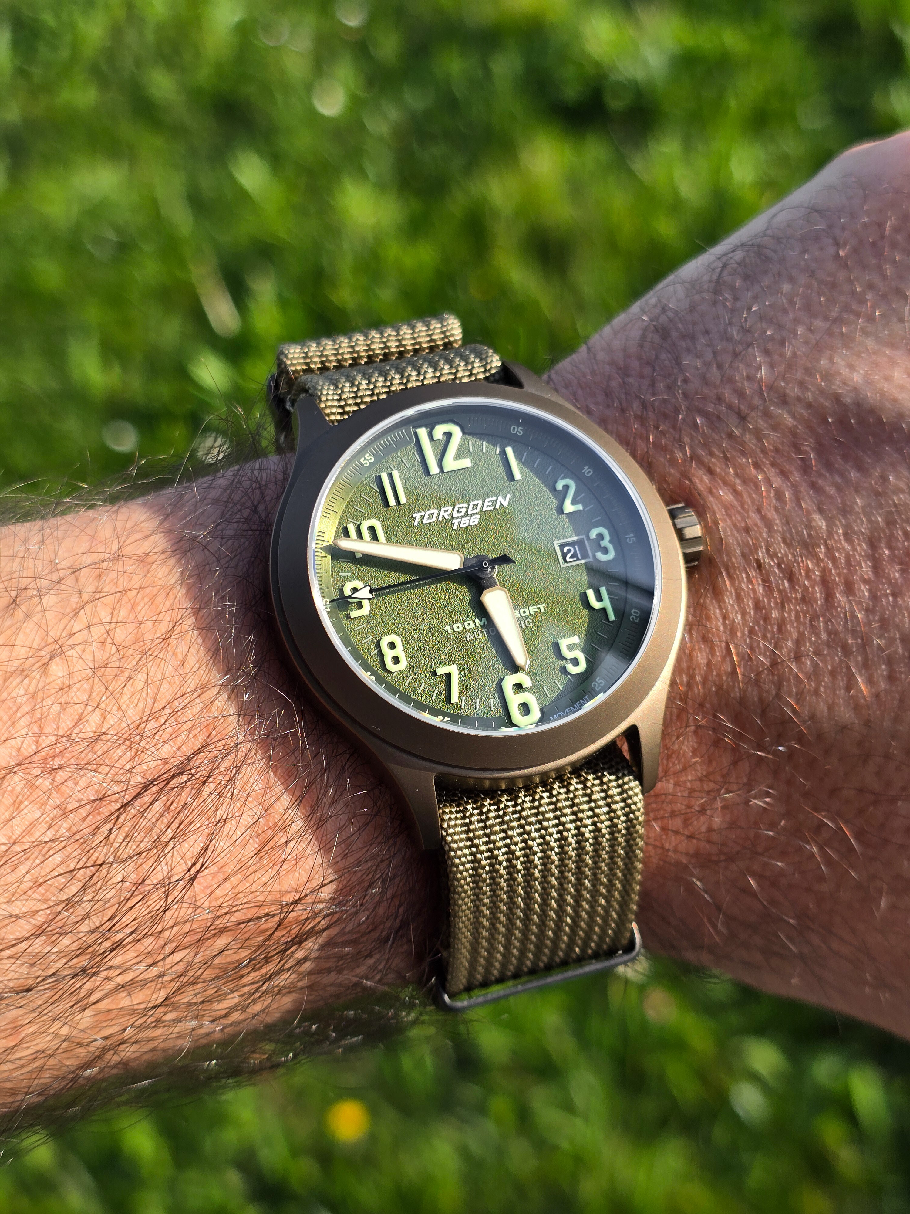 Veo tan mal que no me enteré que tenia la fecha medio torcida hasta que no vi la foto en grande, pero falsa alarma, ya esta bien, culpa de la rosca pequeña y mis dedazos que cada vez que la accionan cambian hora, fecha y mueven el bisel todo a la vez.