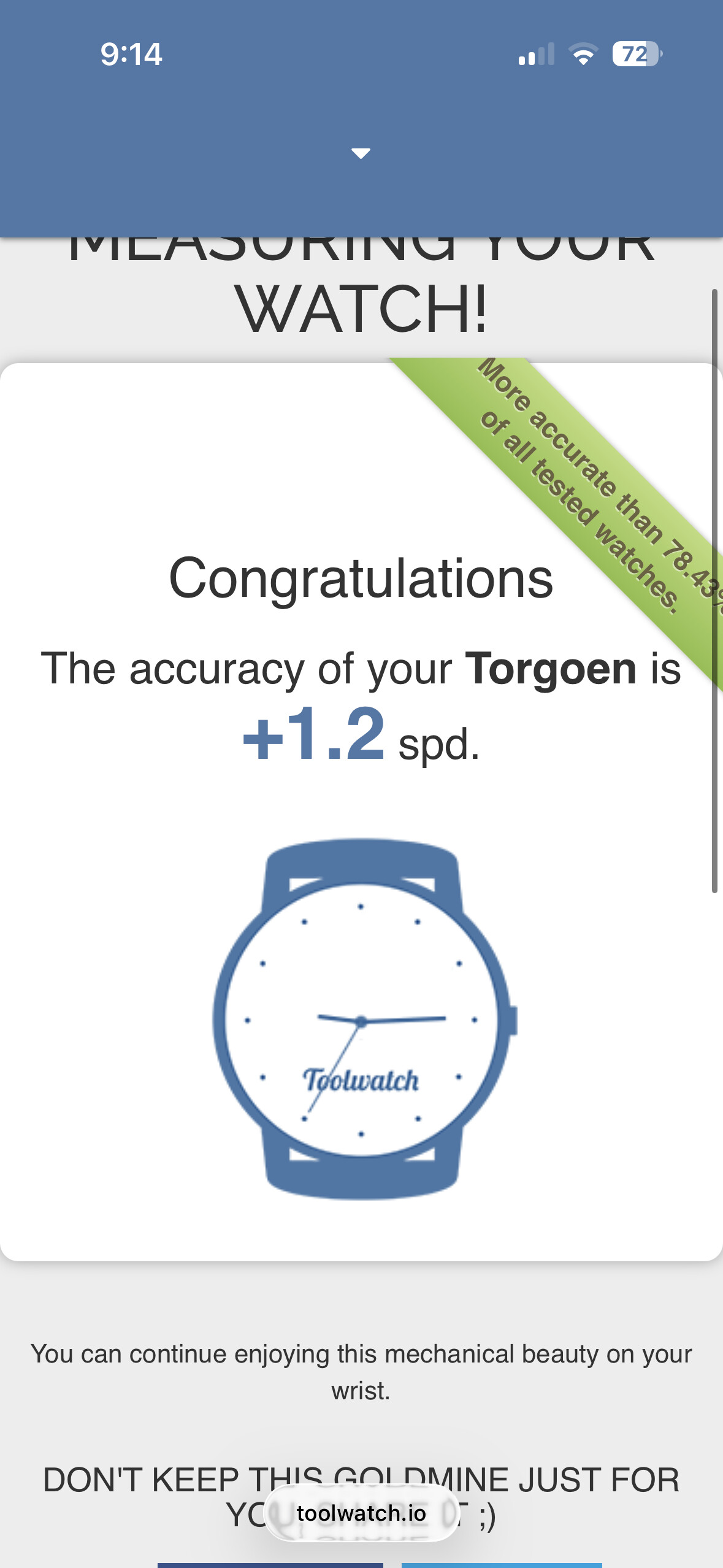 Buenas, es la de toolwatch.io que aparece abajo en la captura, tiene un funcionamiento muy simple: Pones el reloj en hora y le das a tomar medición, una vez el segundero llegue a las 12 justo, le das al botón que aparecerá en grande y confirmas si te encuentras en el minuto 13 o 14 por ejemplo, luego tras 12h mínimo repetirás este proceso, según el reloj haya adelantado o atrasado al volver a comprobar cuando pase por las 12h calculará el adelanto u atraso real.
