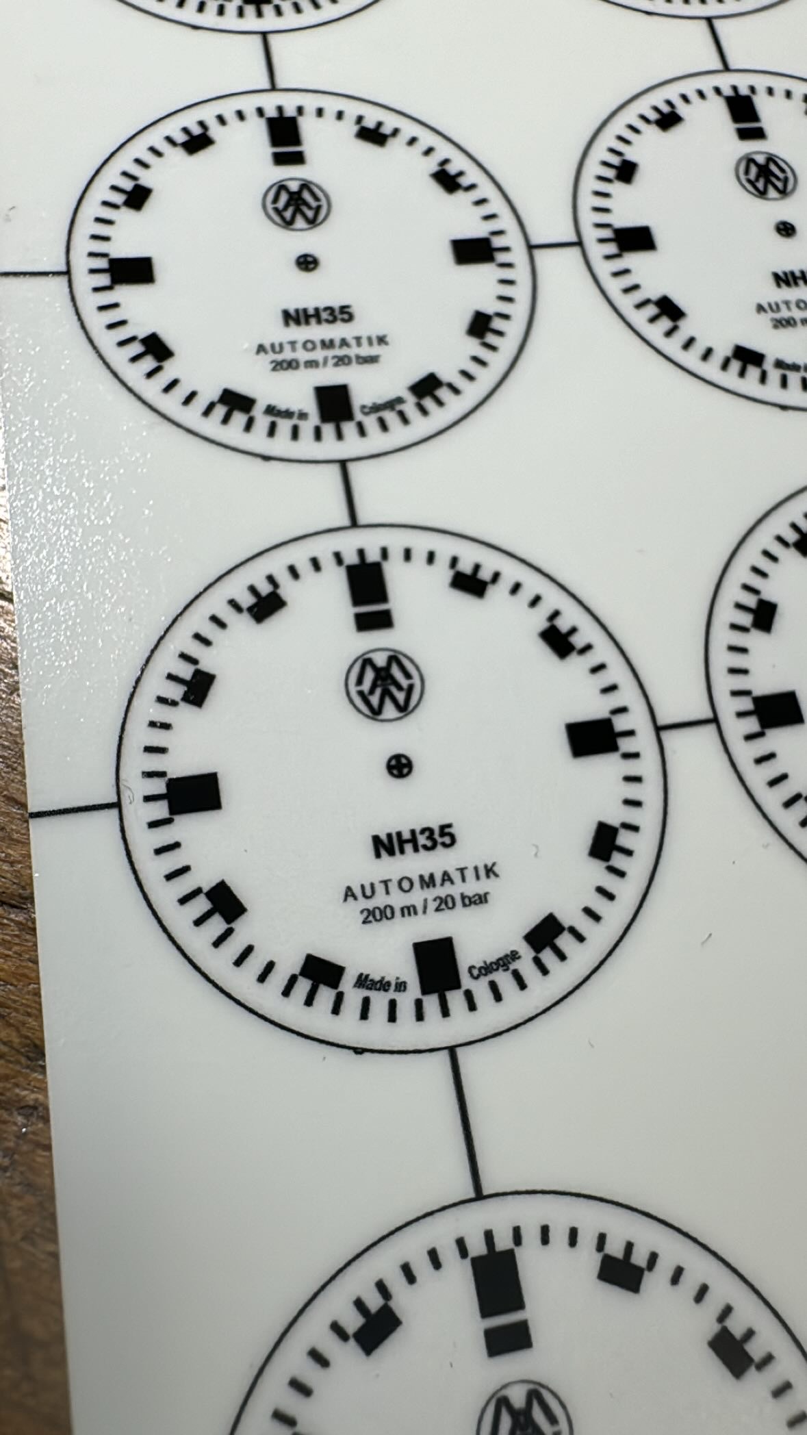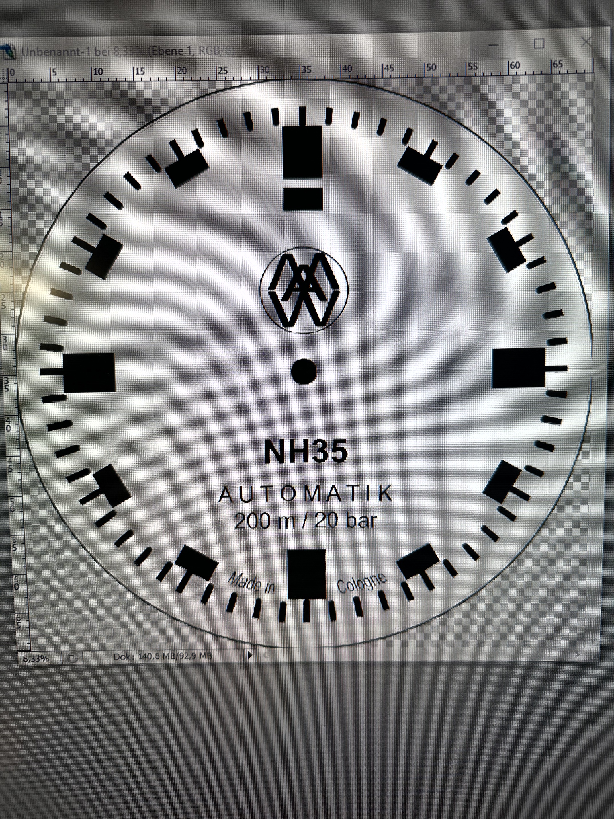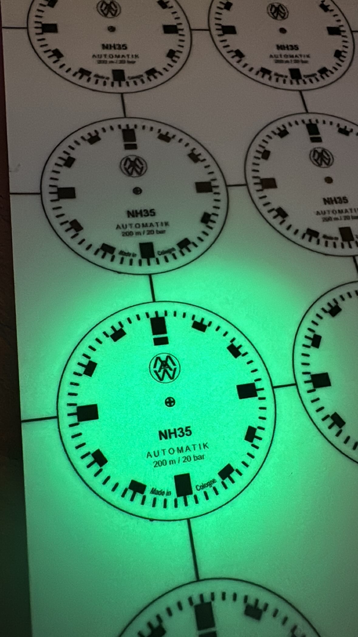 Hola amigos, me gustaría retomar el hilo y presentarles una nueva esfera para un NH 35. El principio es el mismo que mostré arriba. Utilicé un viejo dial NH 35 como dial de soporte y lijé la parte superior. Coloqué la película adhesiva encima y luego pegué la película impresa encima. Los diseñé en la computadora usando Photoshop y los imprimí en una película fluorescente usando una impresora de inyección de tinta. Las agujas utilizadas son de Namoki y han sido pintadas de negro mate. El caso utilizado es de AliExpress. Entonces, si quieres hacer algo similar, ¿no es tan difícil si eres un poco creativo? Aqui estan algunas imagenes.