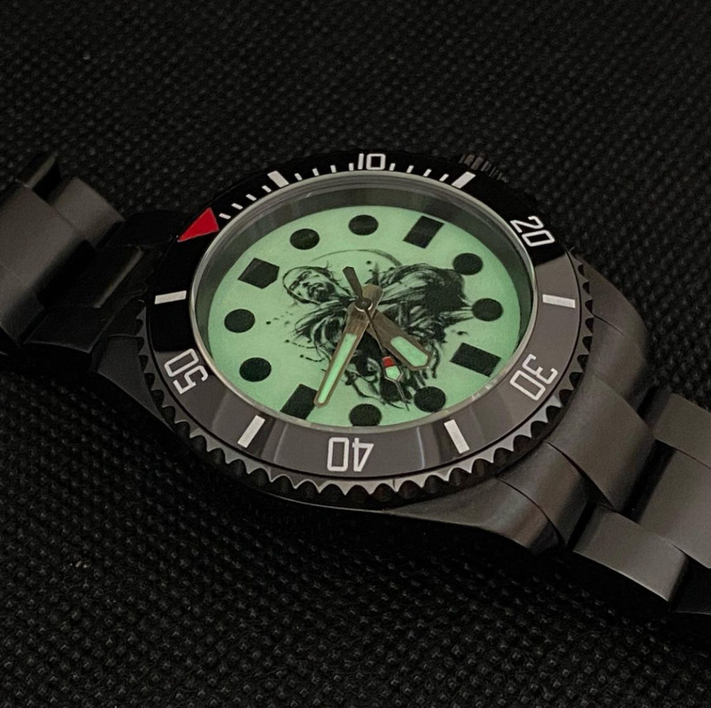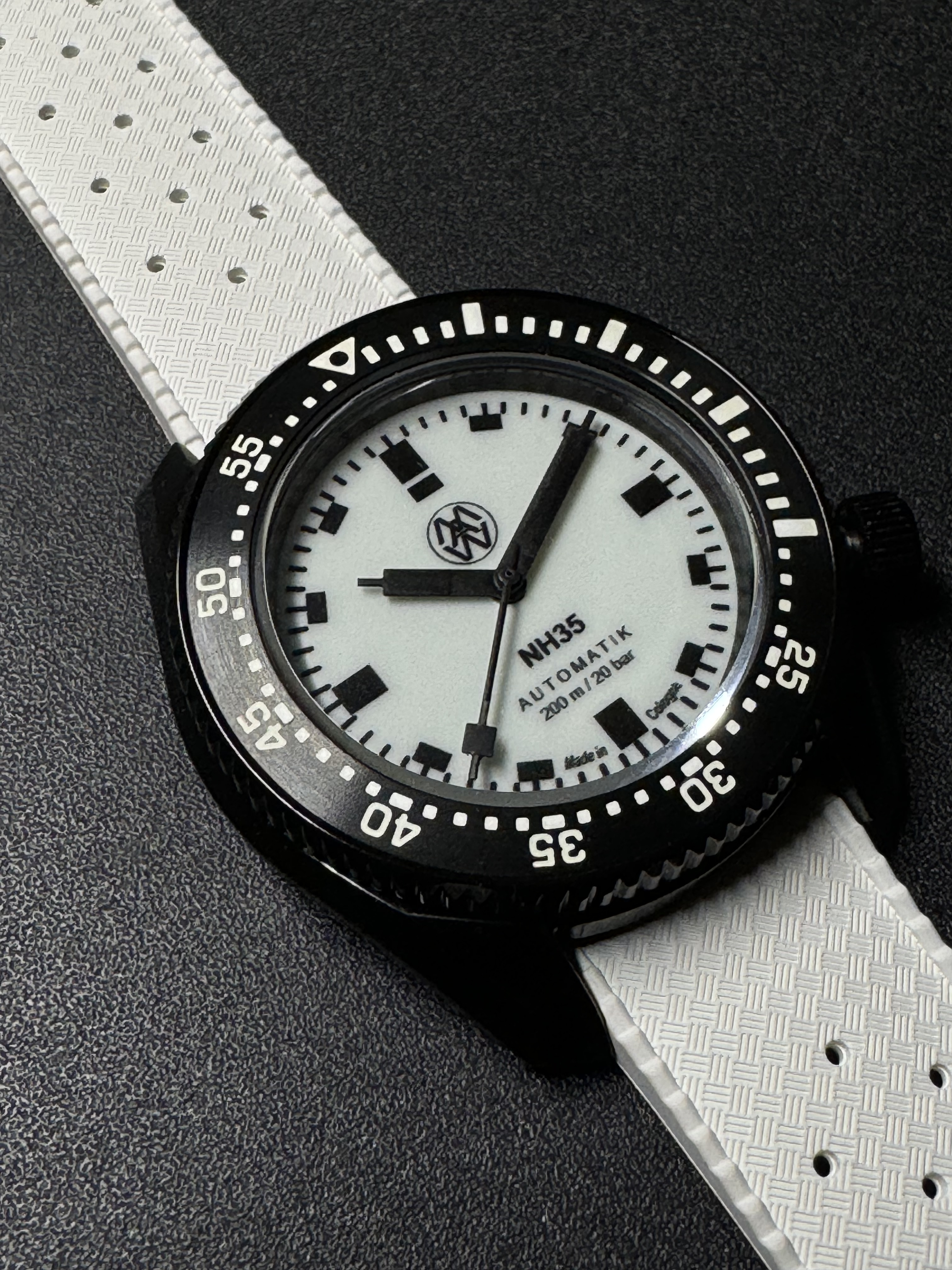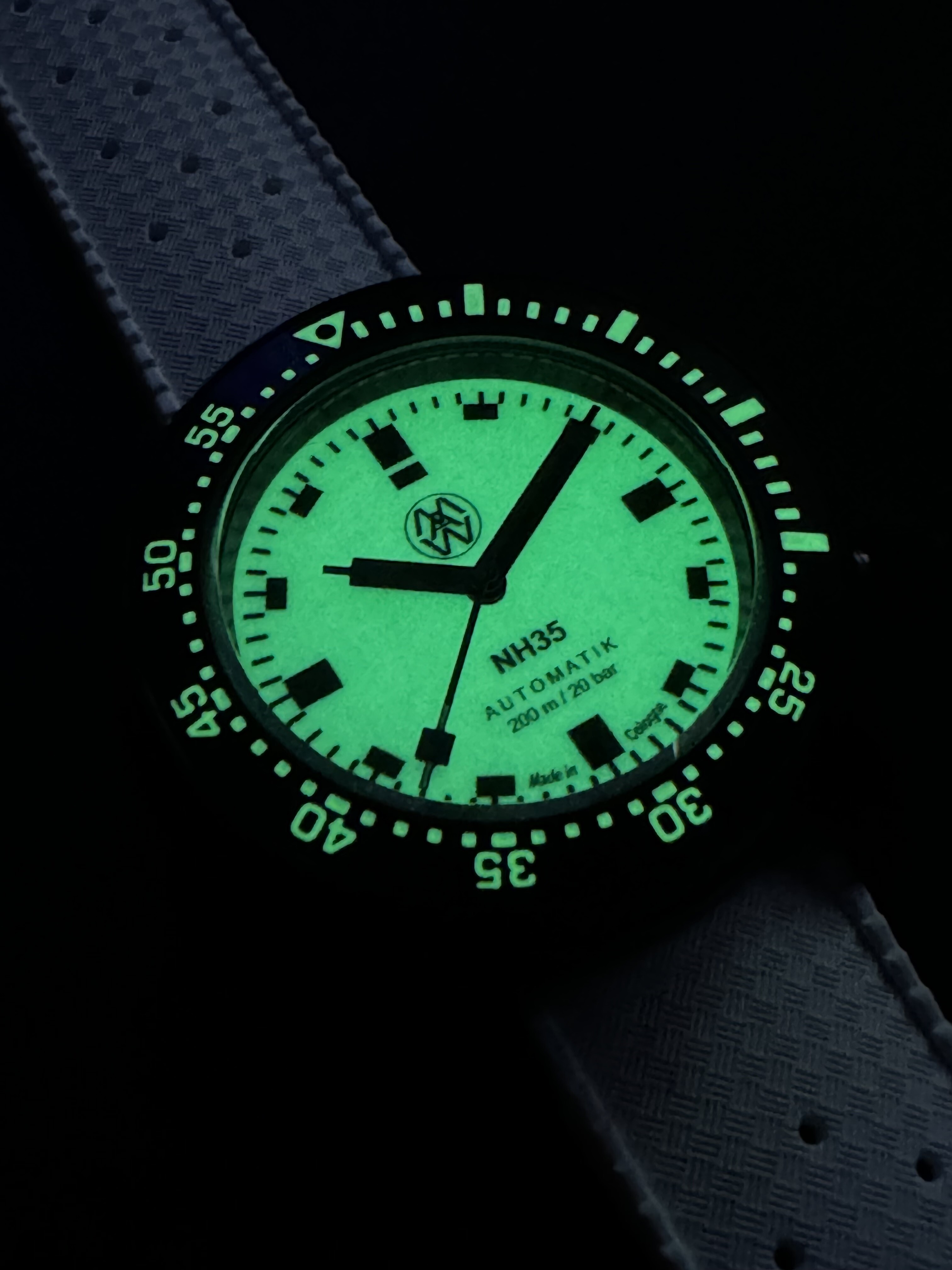 Hola amigos, me gustaría retomar el hilo y presentarles una nueva esfera para un NH 35. El principio es el mismo que mostré arriba. Utilicé un viejo dial NH 35 como dial de soporte y lijé la parte superior. Coloqué la película adhesiva encima y luego pegué la película impresa encima. Los diseñé en la computadora usando Photoshop y los imprimí en una película fluorescente usando una impresora de inyección de tinta. Las agujas utilizadas son de Namoki y han sido pintadas de negro mate. El caso utilizado es de AliExpress. Entonces, si quieres hacer algo similar, ¿no es tan difícil si eres un poco creativo? Aqui estan algunas imagenes.