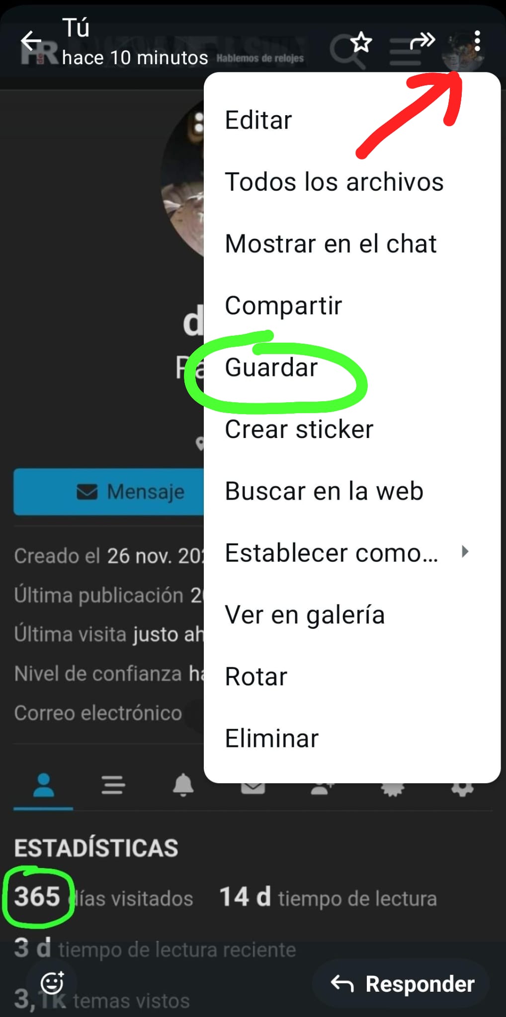 Buenas amigacho, ya tenía un grupo WhatsApp para mi solo, me he enviado una foto para hacer la prueba, pero no me sale lo de guardar cuando ya la tengo allí, como se llega a esa opción?