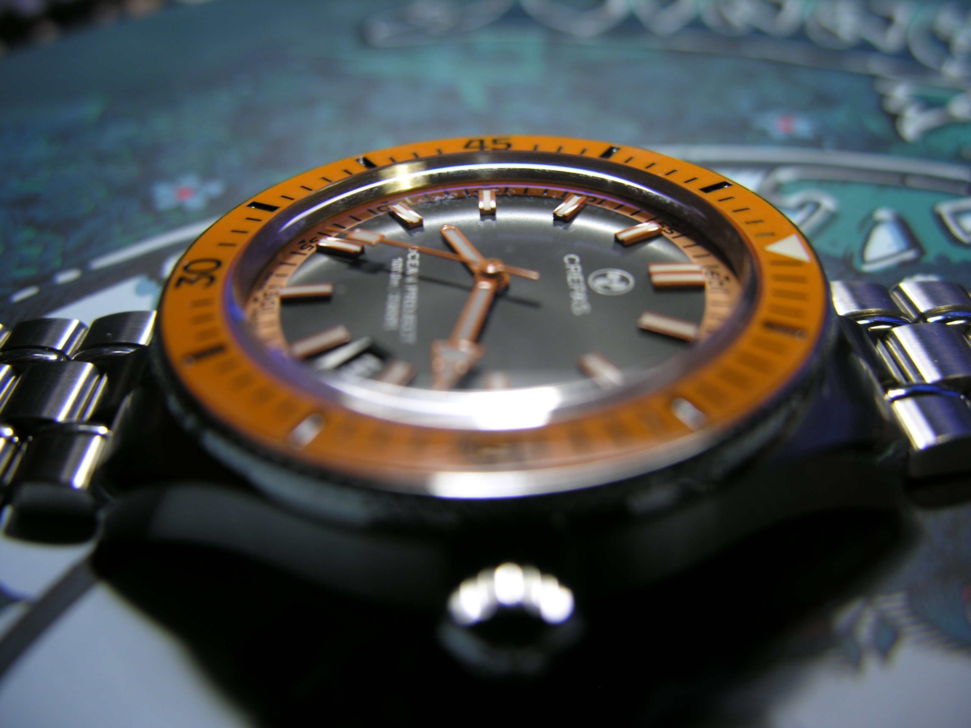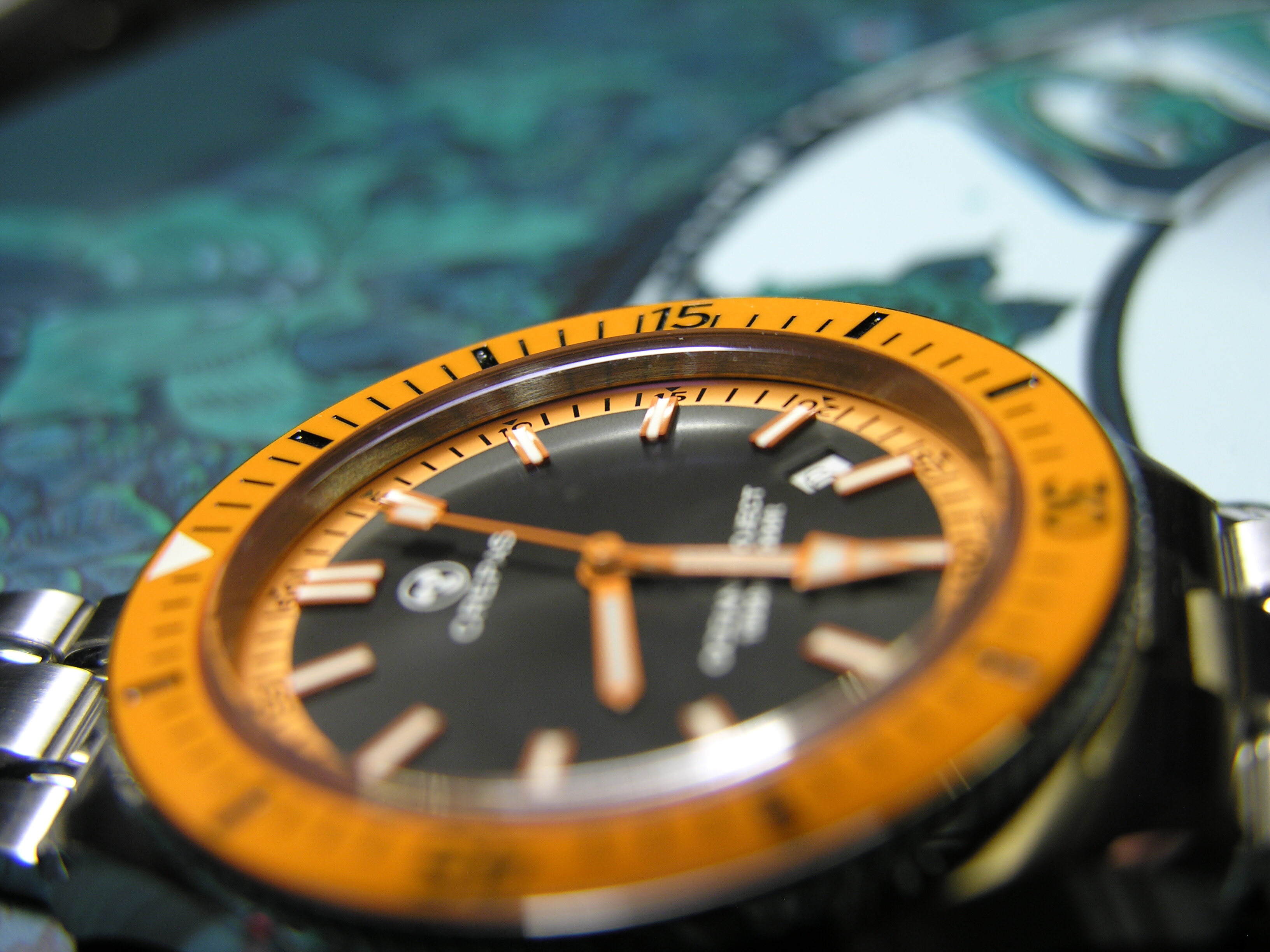 El color naranja es un poco distinto a aquel del SeaP. un pelín más amarillento. El insert del bisel con los números muy exactos y el color negro aplicado perfectamente.