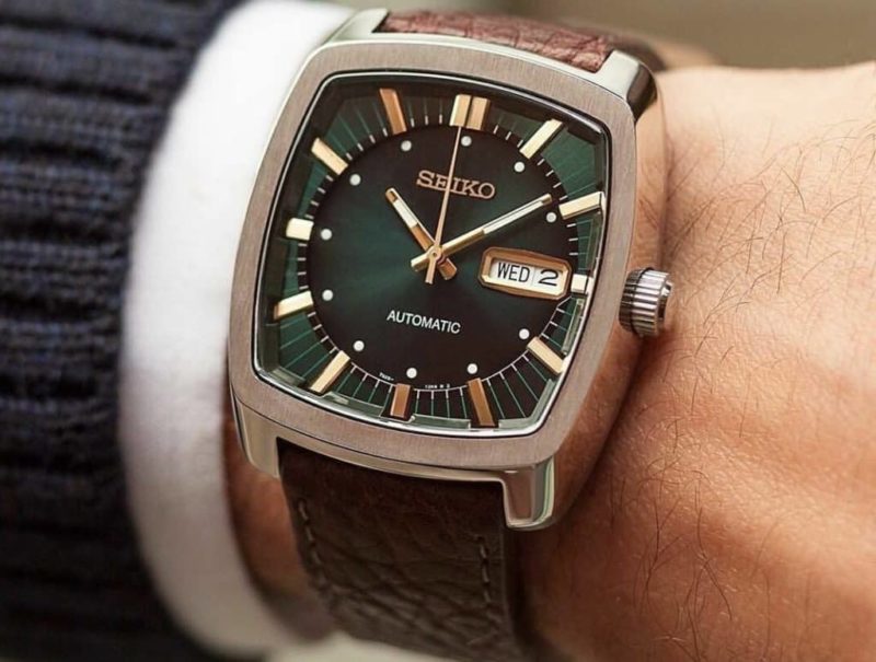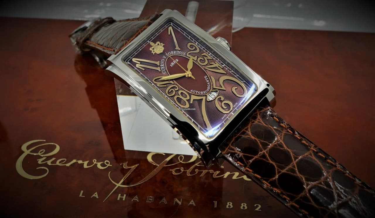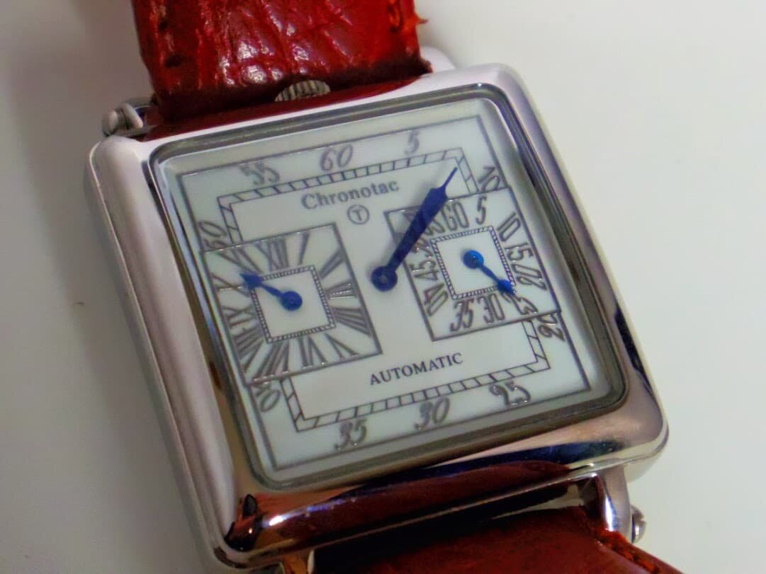 Es un modelo también descatalogado con corazón Seagull ST17 modificado para que ofrezca la complicación de regulador. Está hecho enteramente en acero inbox. y un precioso dial tipo cerámico (o eso me parece a mí). Mide 35mm pero al ser cuadrado y sin bisel aparenta bastante más. Notad el detalle de la corona a las 12.