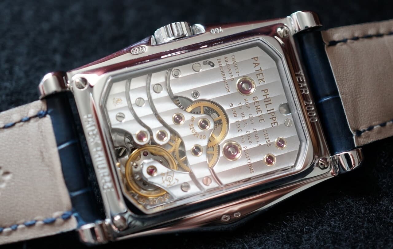 También para el movimiento, aprovechando un calibre redondo con una bata. No son muchos los que, a través del fondo visto, dejan ver un calibre rectangular…