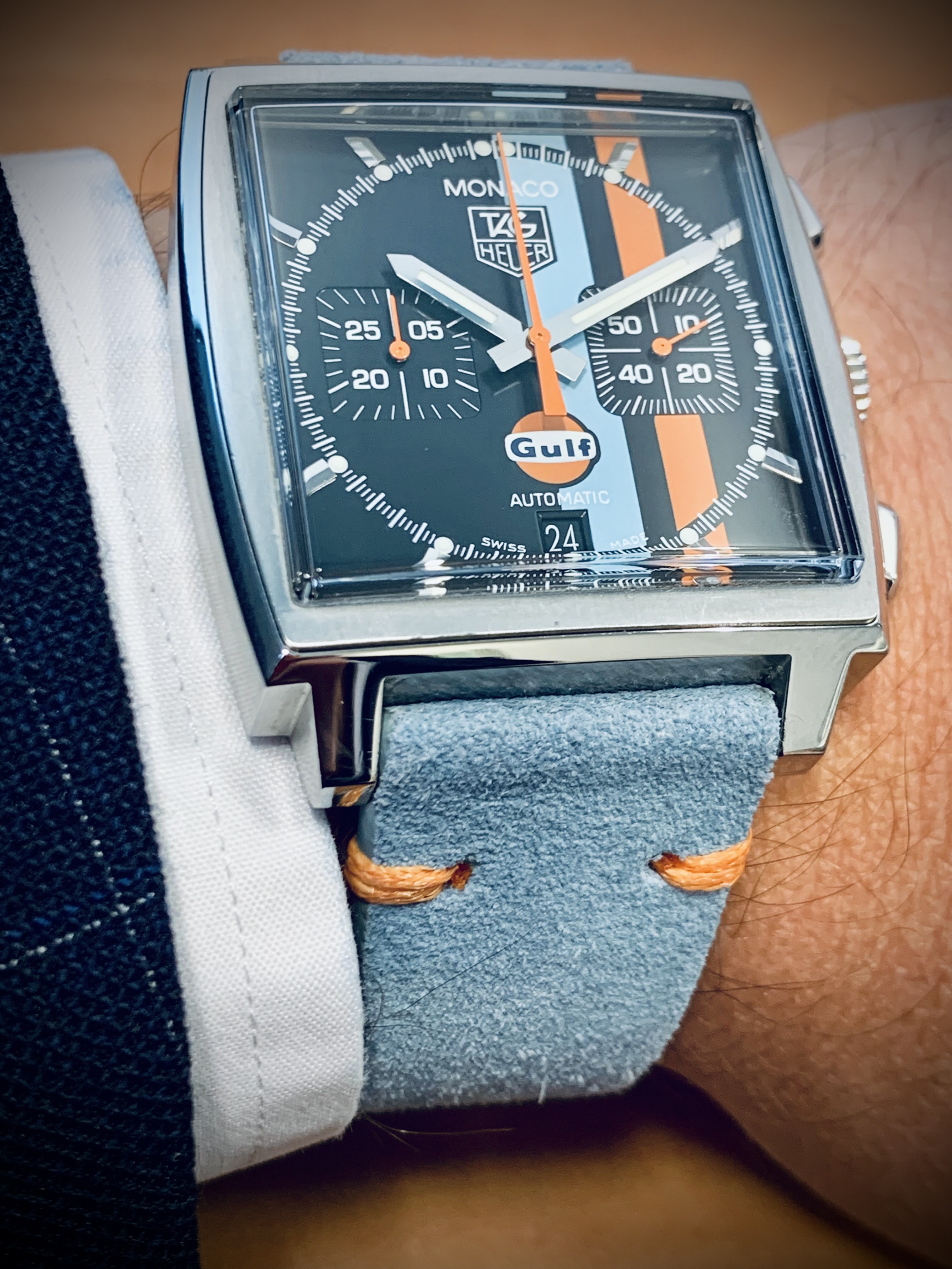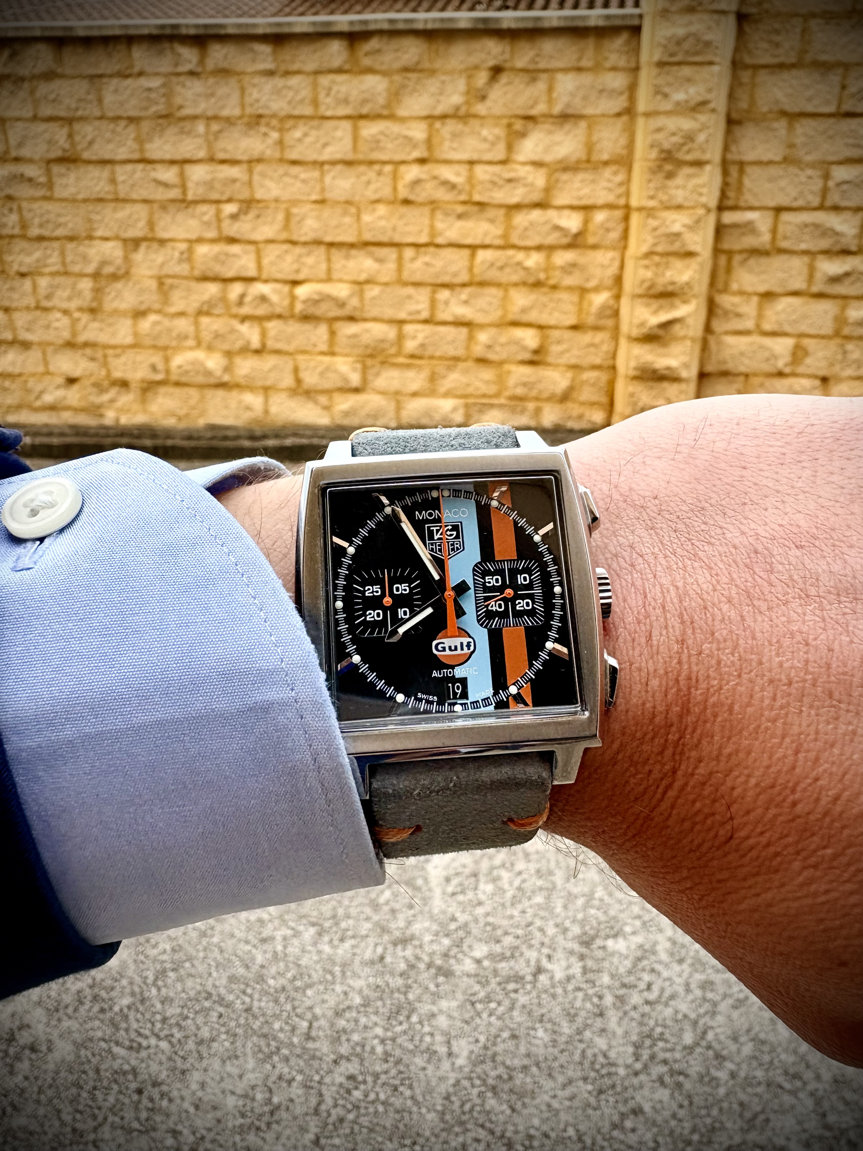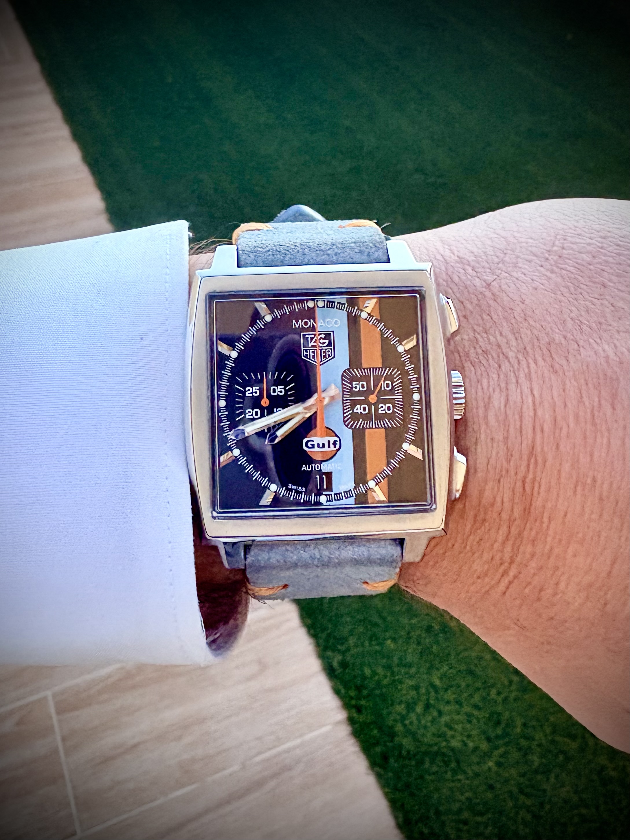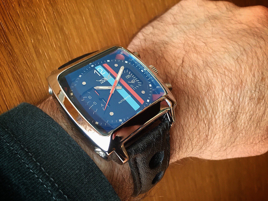 -Es un reloj que siempre me ha gustado. Recuerdo (con pena) que hará unos diez años estuve a punto de salir de una relojería con uno en la muñeca, igual que éste de la foto, y lo que me frenó era que llevara propaganda de la petrolera Gulf en la esfera. Tenía que haber soltado los algo más de 2500 euros… hoy se ha ido a las mismísimas nubes. :sad: