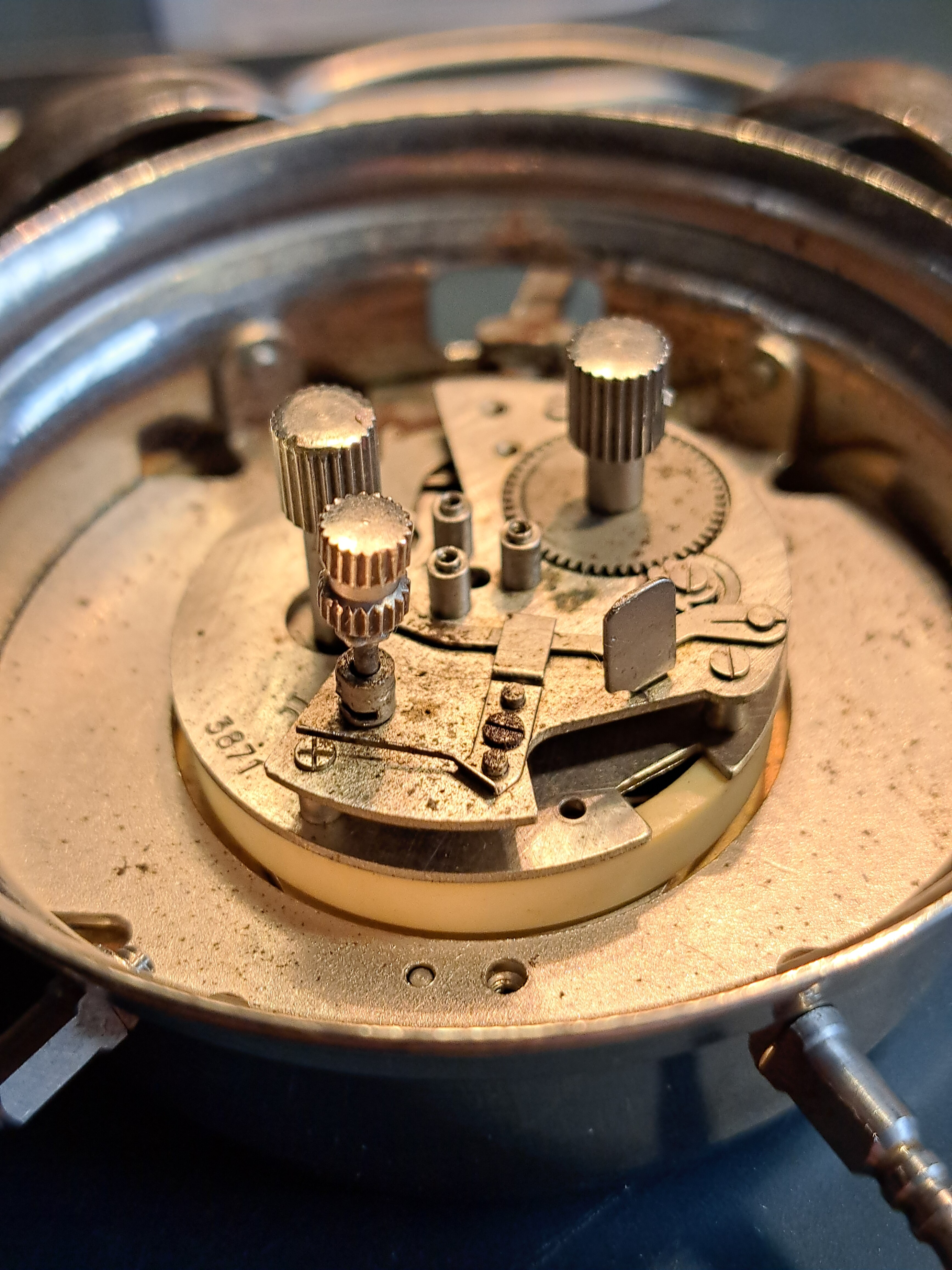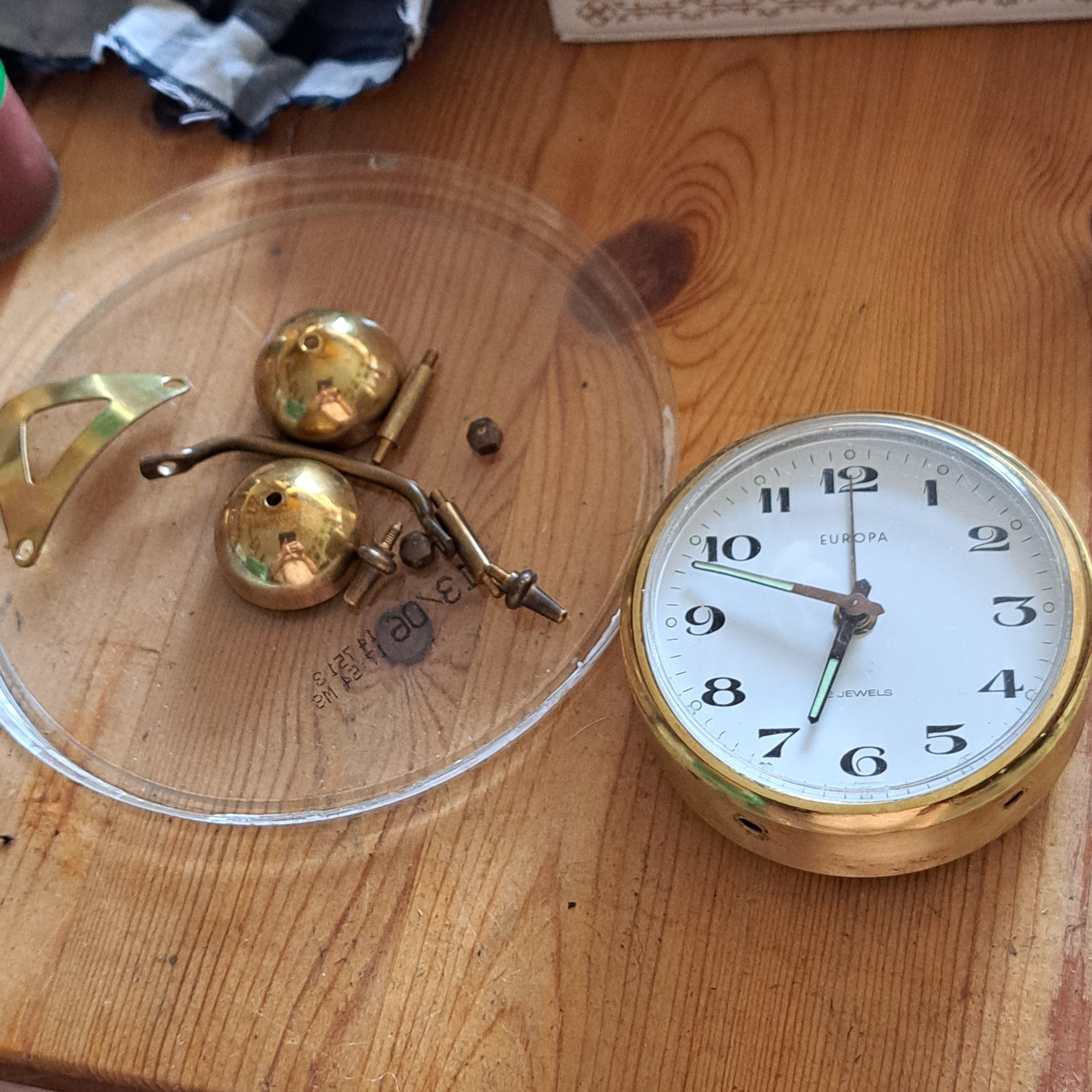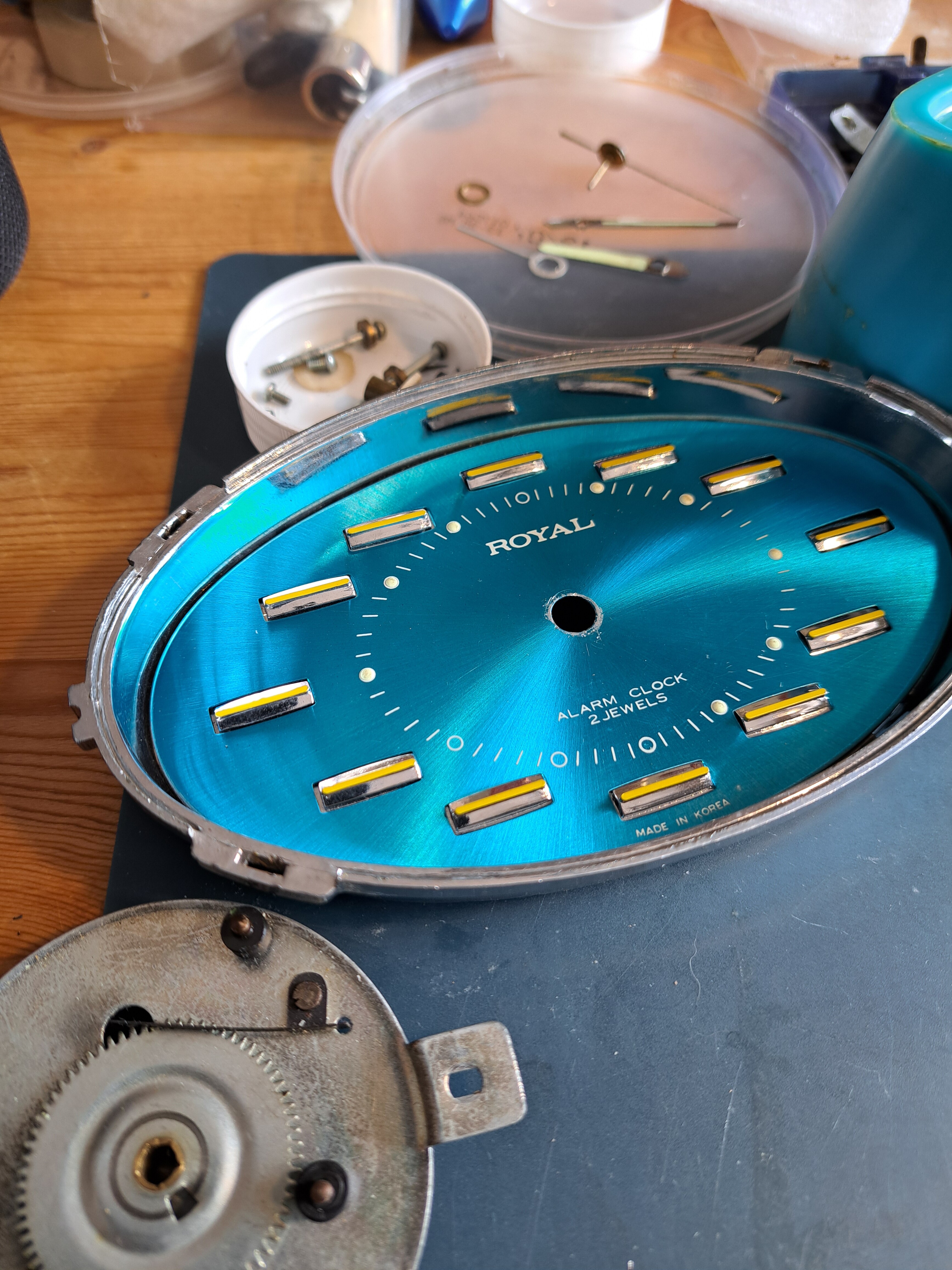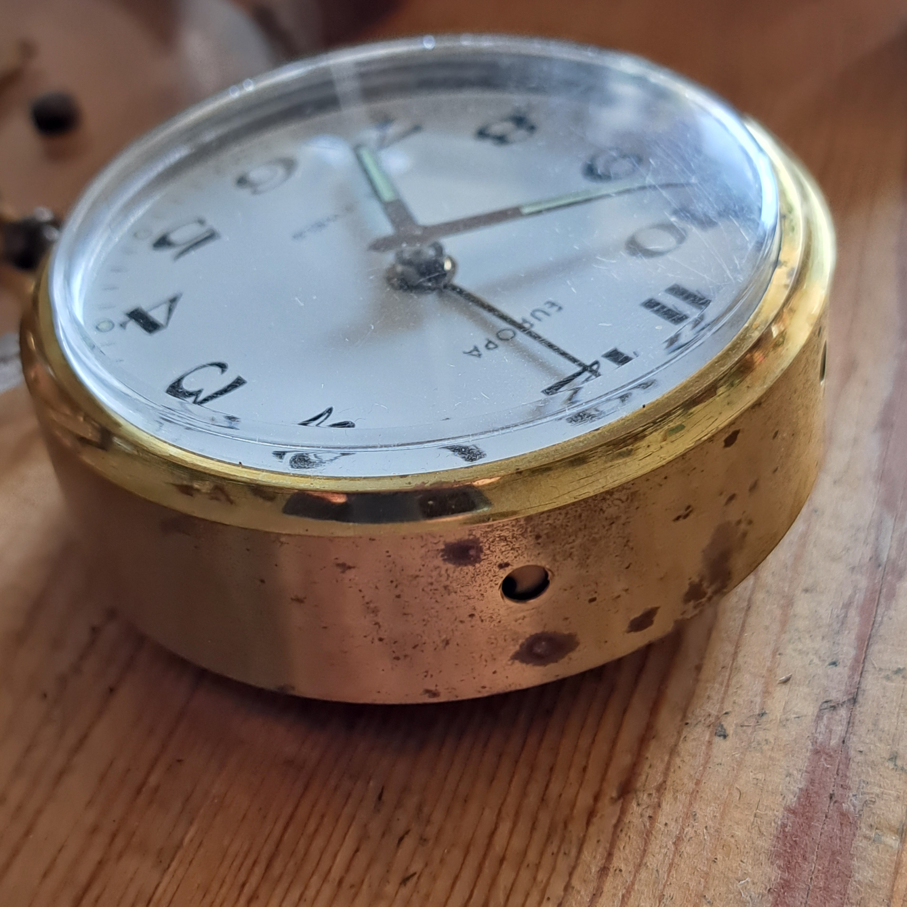 He decapado la pintura con acetona y pulido el metal de la carcasa, repasado con mucho cuidado las agujas, cambiado la manivela de la cuerda, pintado y lacado un par de piezas.