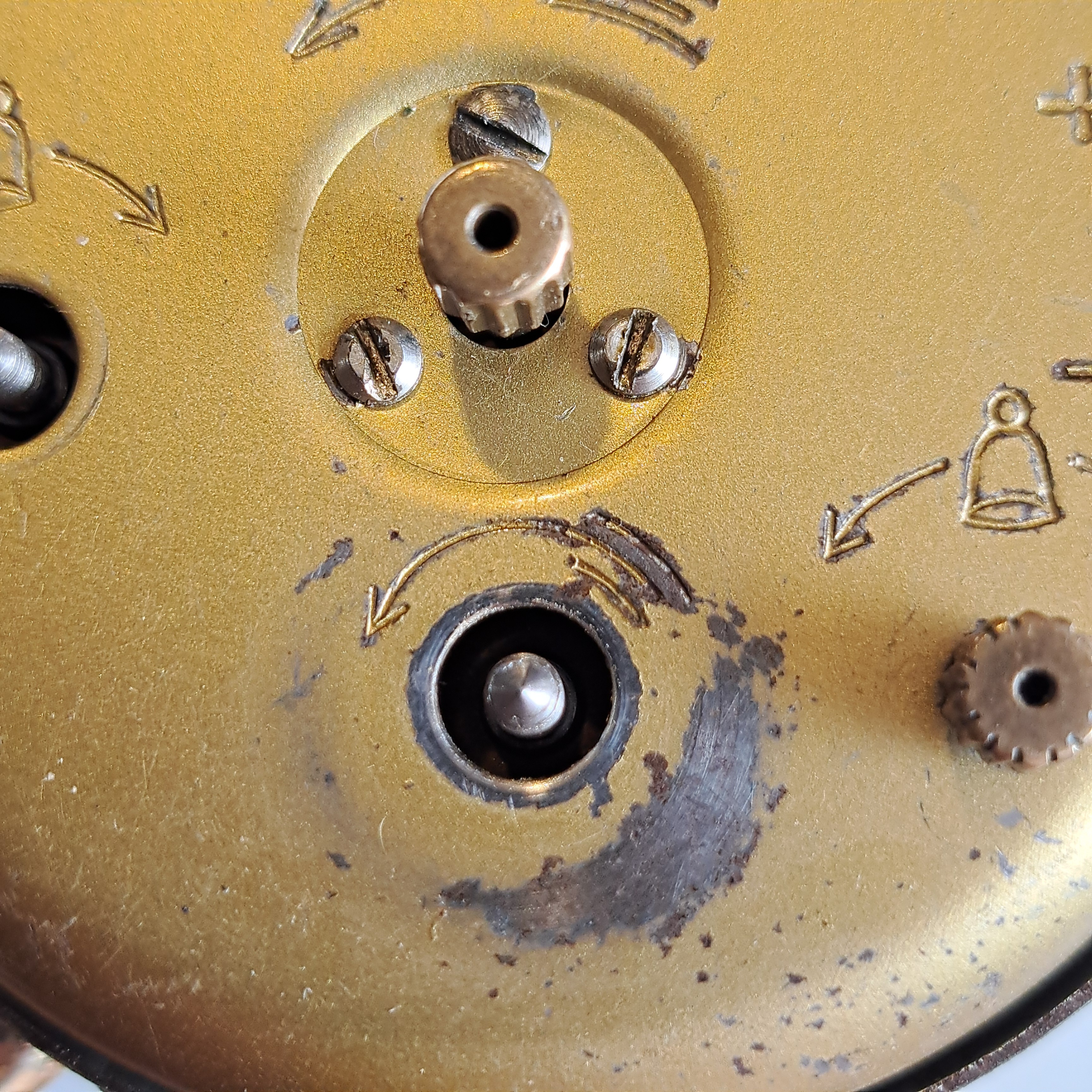 Aunque se ve centrado, al desmontar esta vez me he dado cuenta que la mariposa de la cuerda está muy dura. Y que al desmontarla el mecanismo arranca de nuevo. Han debido cambiar la original y esta impide a la rueda del muelle real girar libremente.