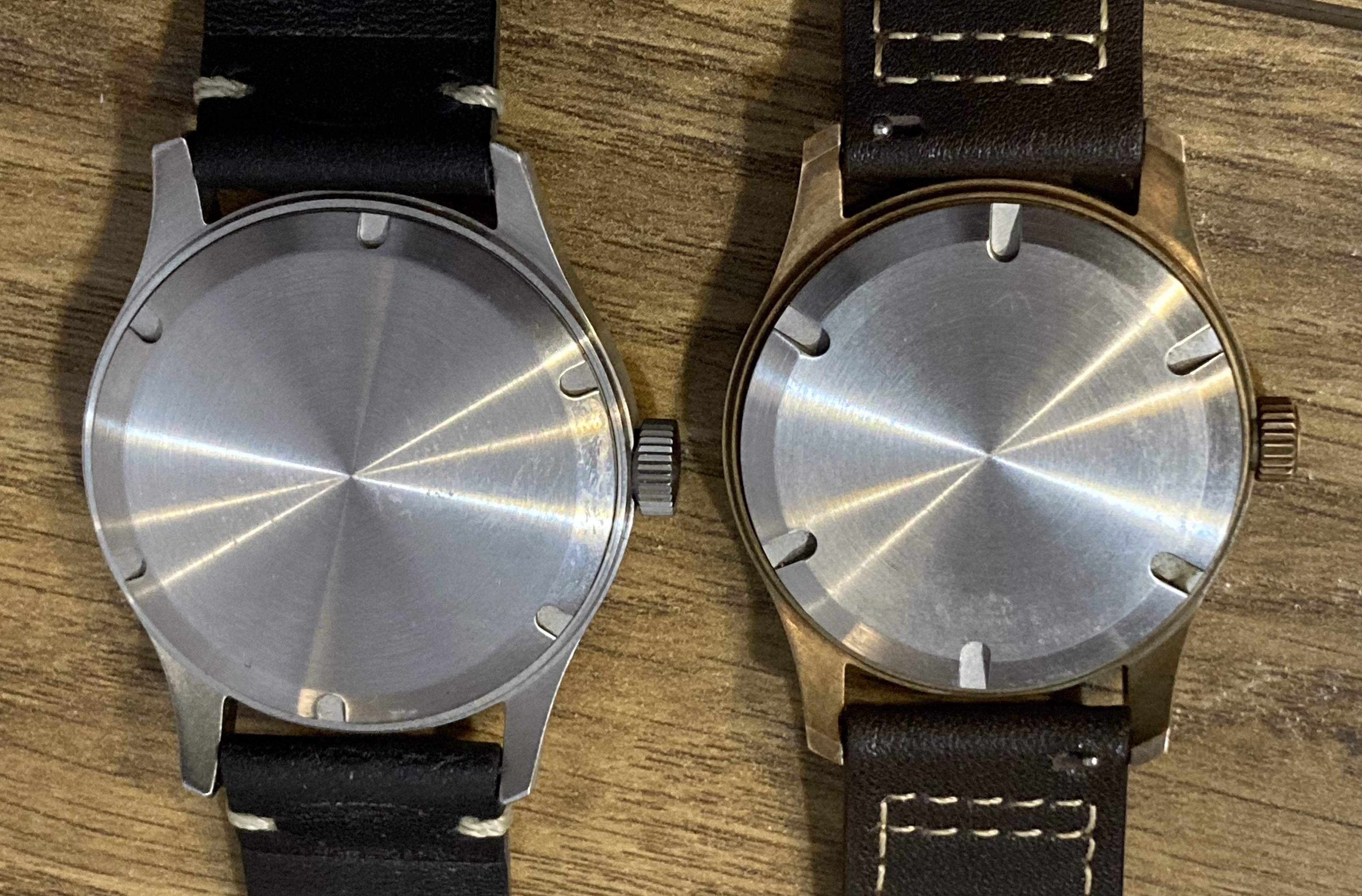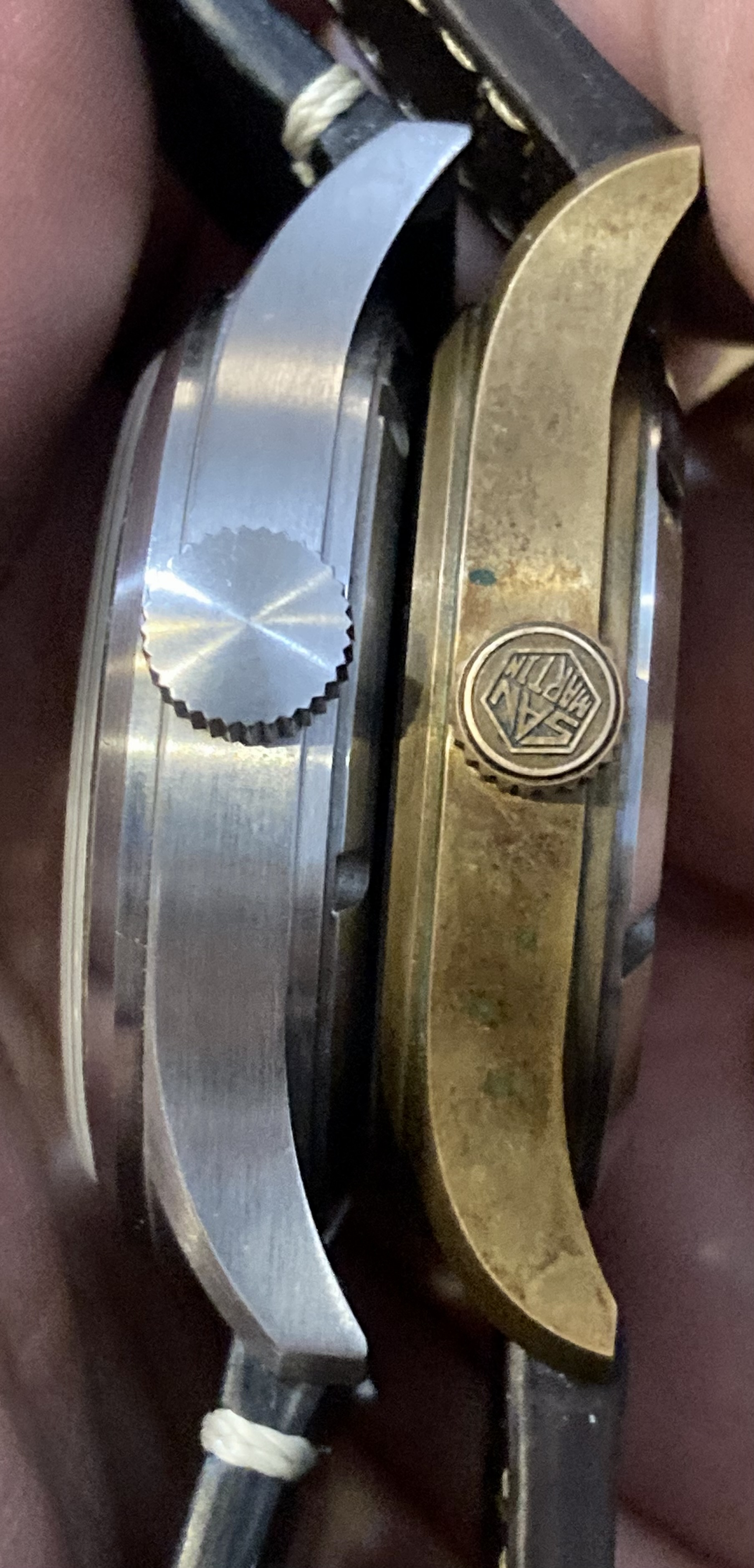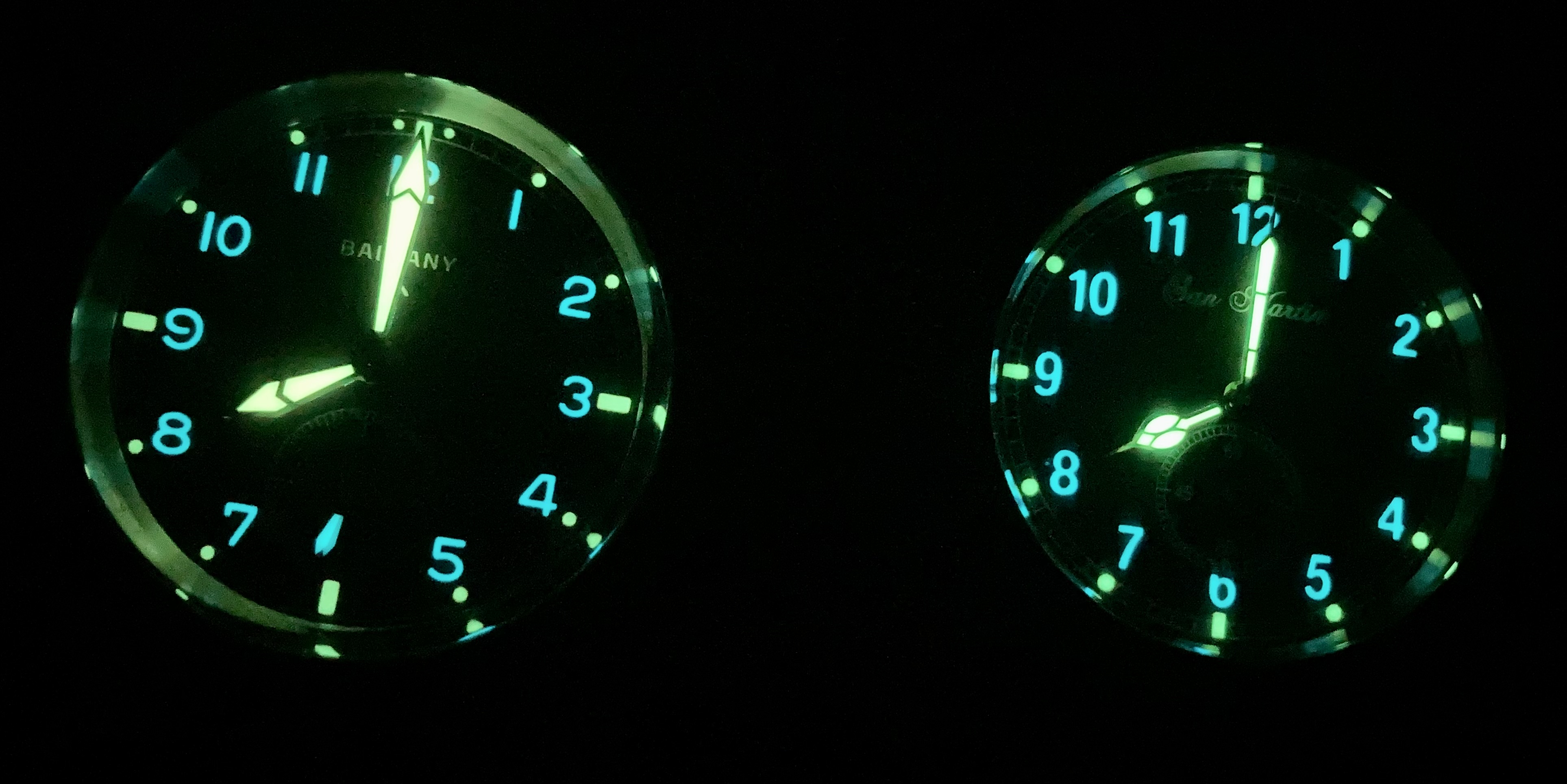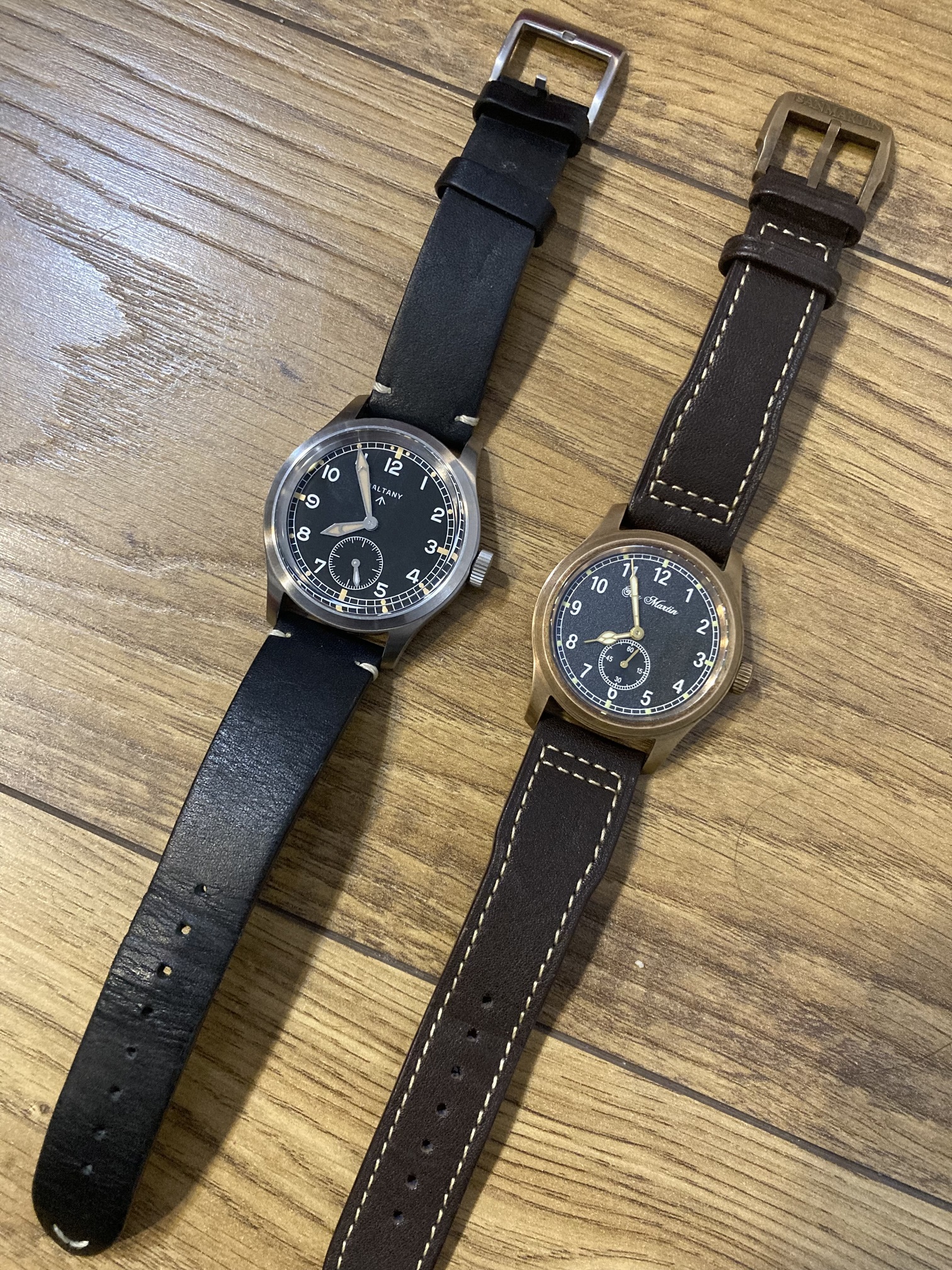 Los dos D12 que poseo, son los dos made in china, un Baltany en inox, y el SM en laton. Los dos con movimiento de quarzo. El Baltany con un Seiko VD78, y el Sant Martin creo que un Ronda 6004. Me parece interesante hacer una pequeña comparación y ponerlos cara a cara.Creo que las dos marcas tienen una calidad remarcable por su precio, ya conocida aquí y compres el que compres, seguro que no te decepcionan. En rasgos generales SM tiene mas detalles, como corona y cierre grabado, pero por lo demás, andan a la par en cuanto a acabo y calidad de materiales/construcción.