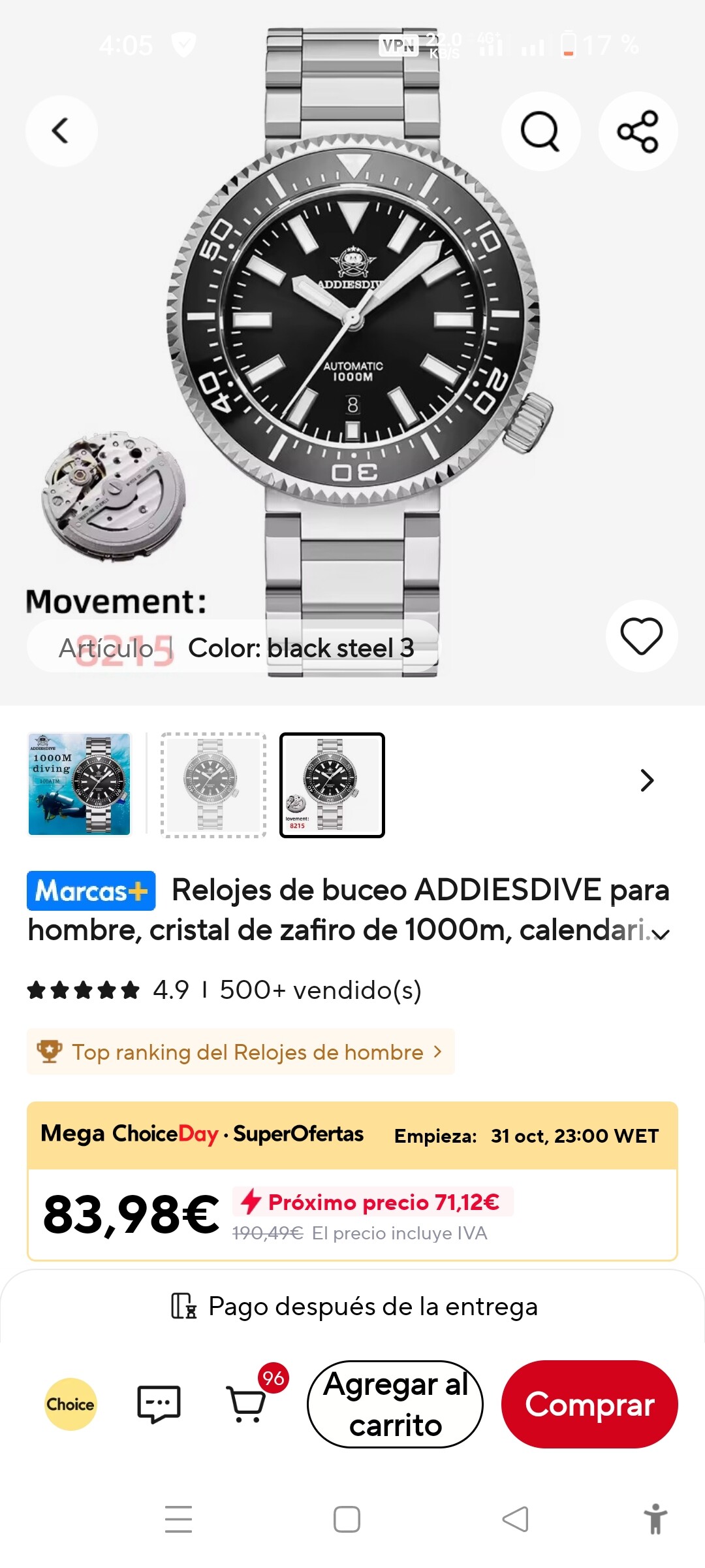 Lástima, lo hubiera preferido incluso con un nh36. Pero por 71 eurillos, aun sin cupones ni monedas añadidos se traduce en… menos de 60€