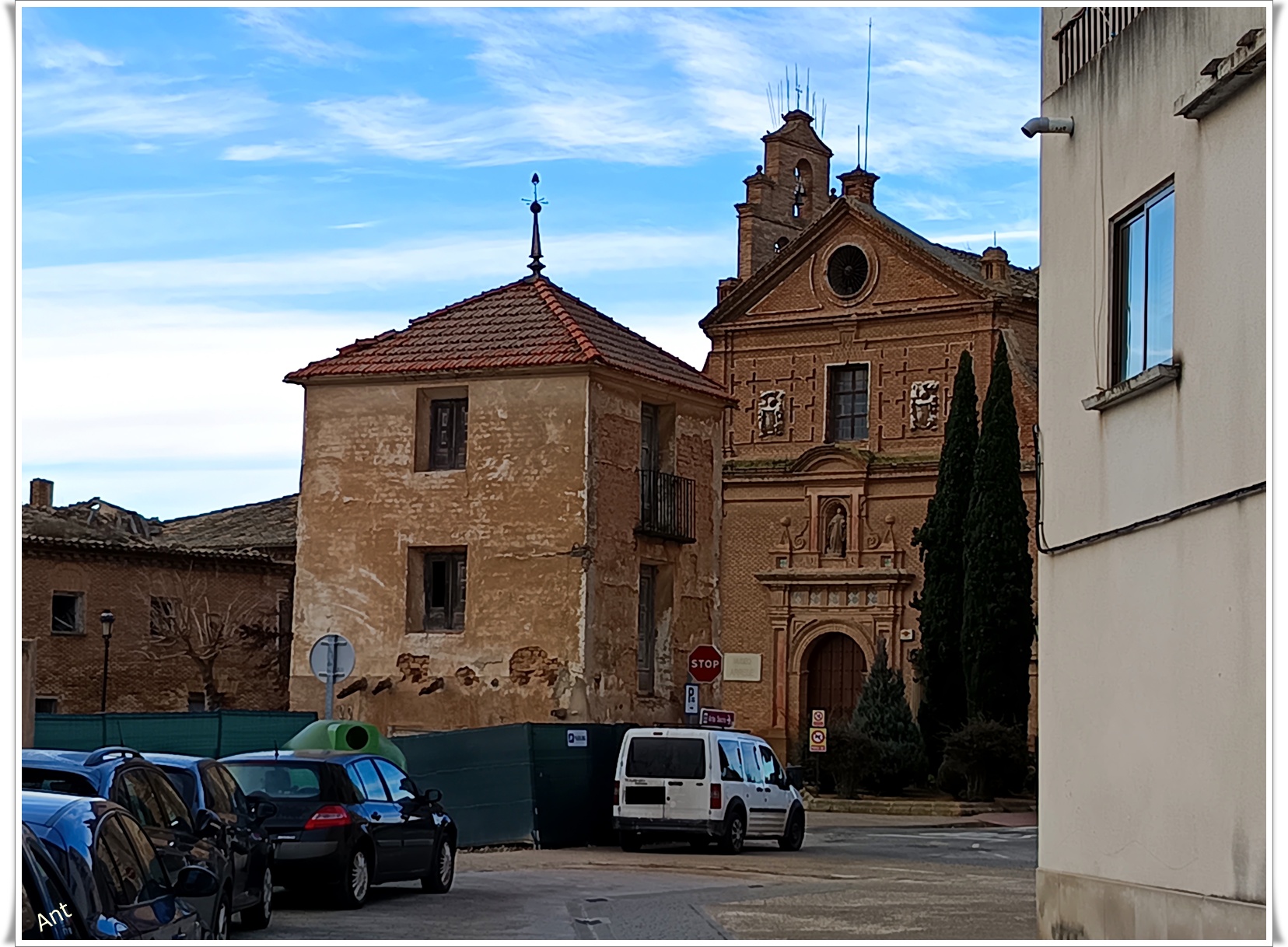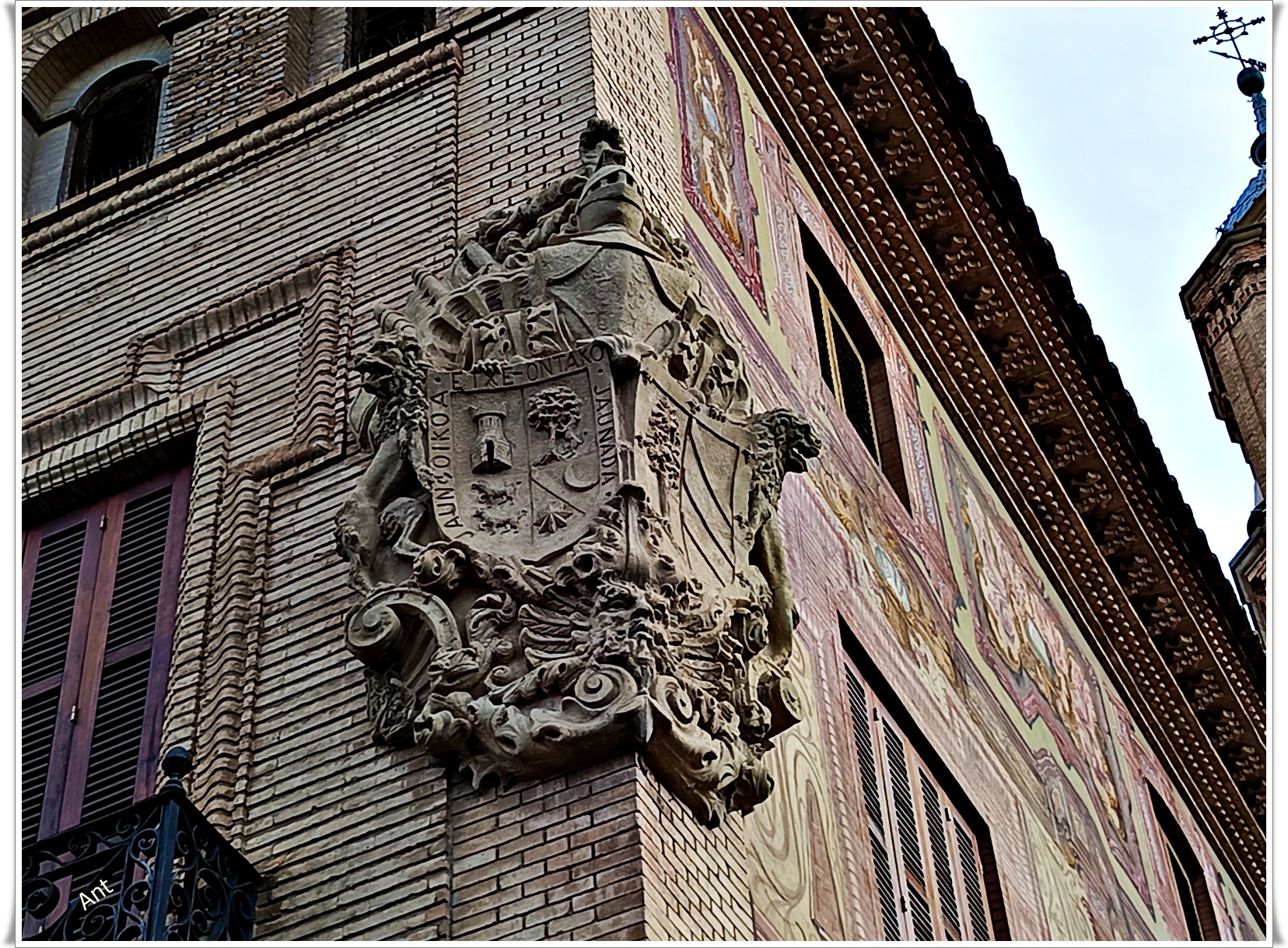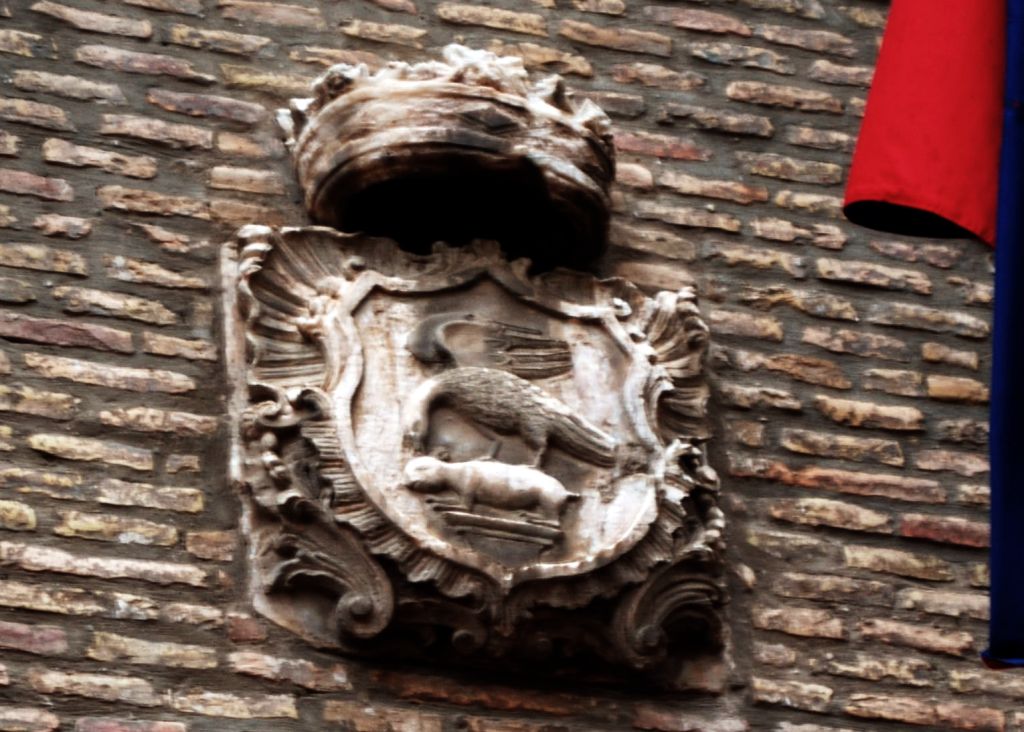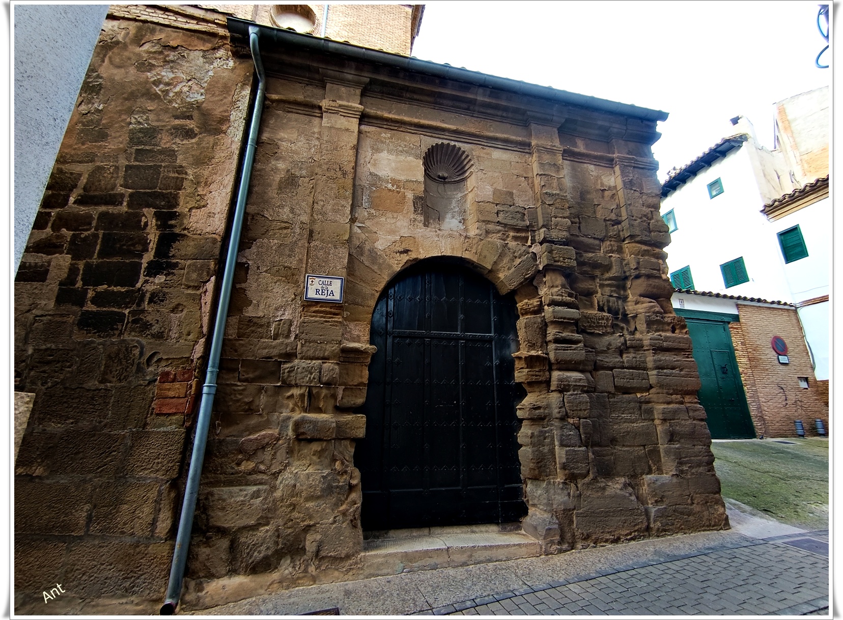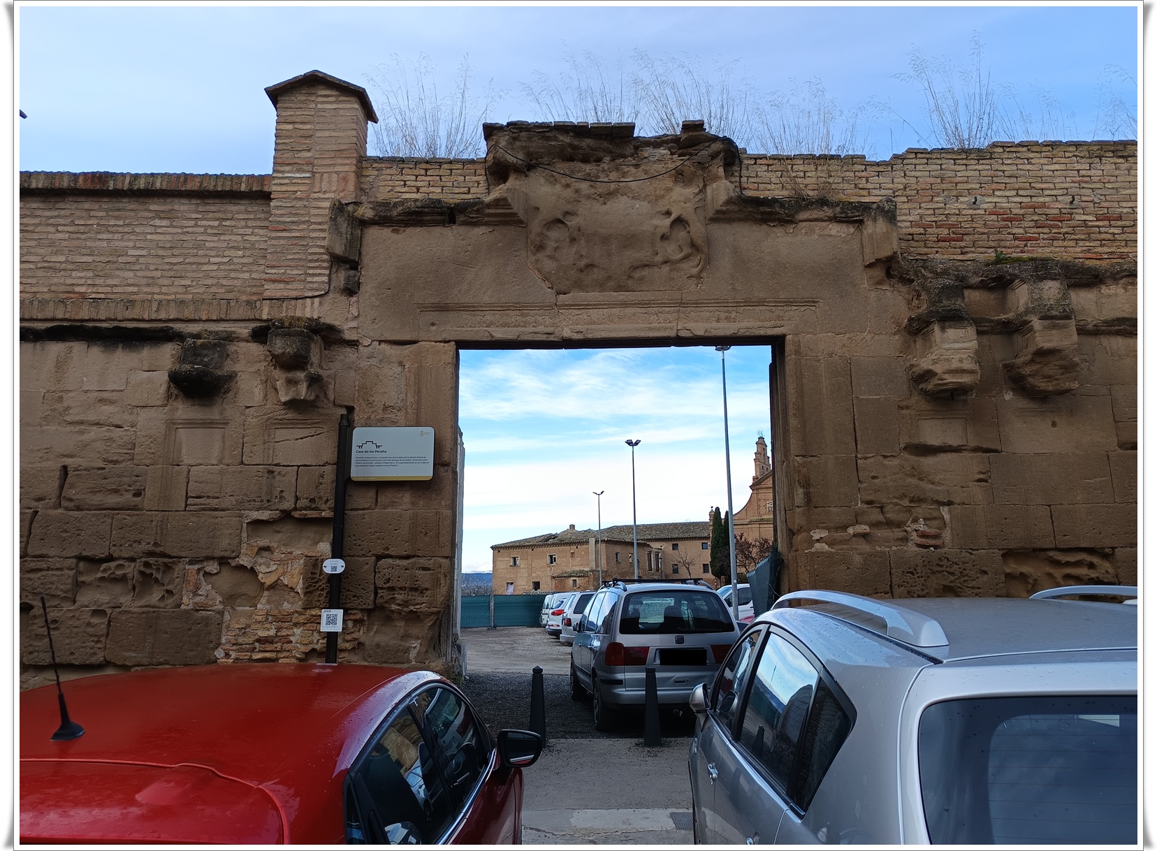 Seguimos andando y vemos un imponente edificio con un enorme escudo de armas de los Arrese y Saenz de Heredia y detrás las torres de la Iglesia.