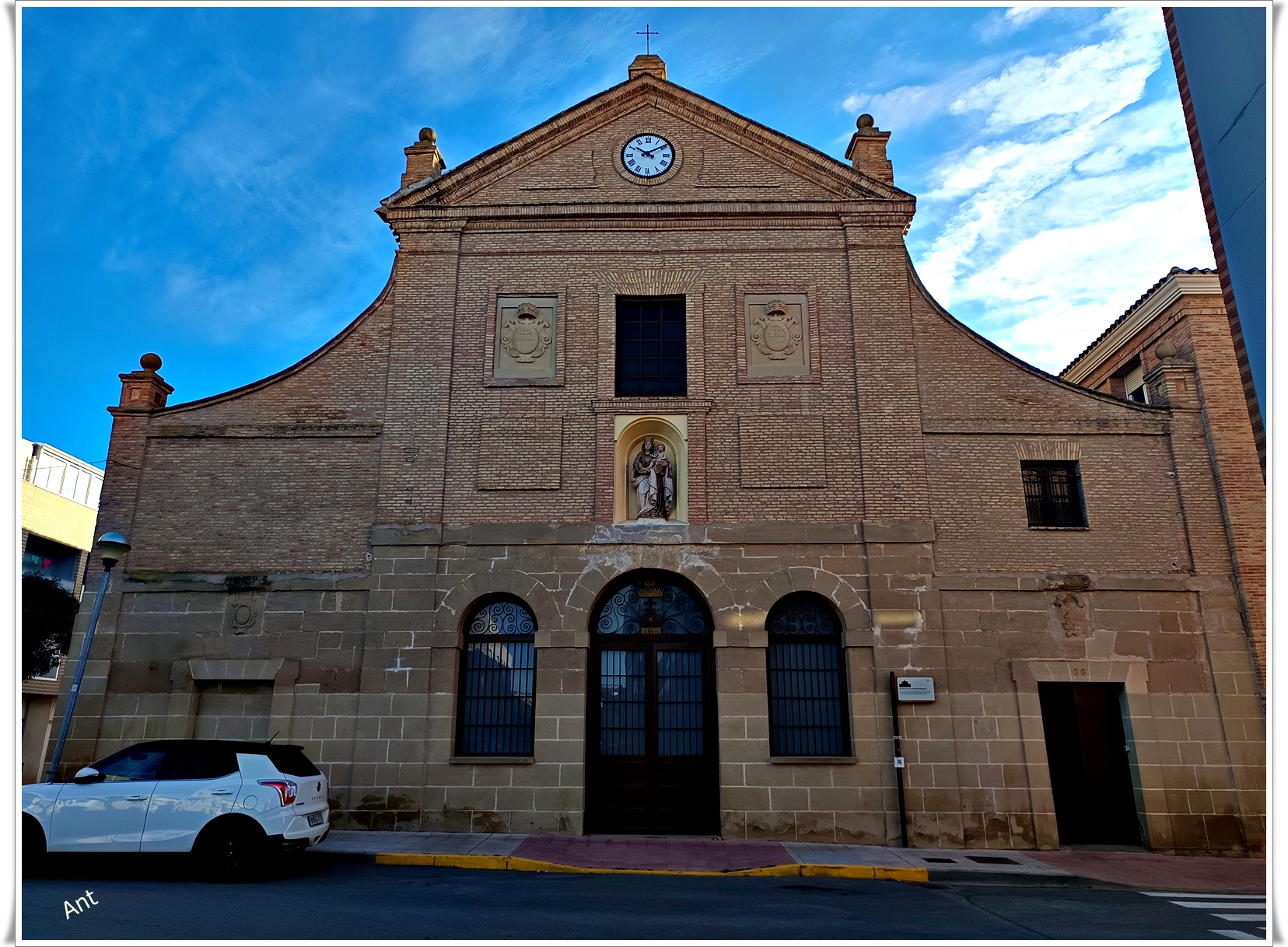 La fachada principal, donde se aprecian los mencionados contrafuertes decorados con motivos geométricos y coronados con pequeñas torretas, muestra una portada de piedra articulada geométricamente con una talla de la Virgen del Rosario y el Niño del s. XVII que destaca frente al ladrillo y, que al igual que la torre lateral, fue añadida a mediados del s. XX siguiendo esquemas barrocos.