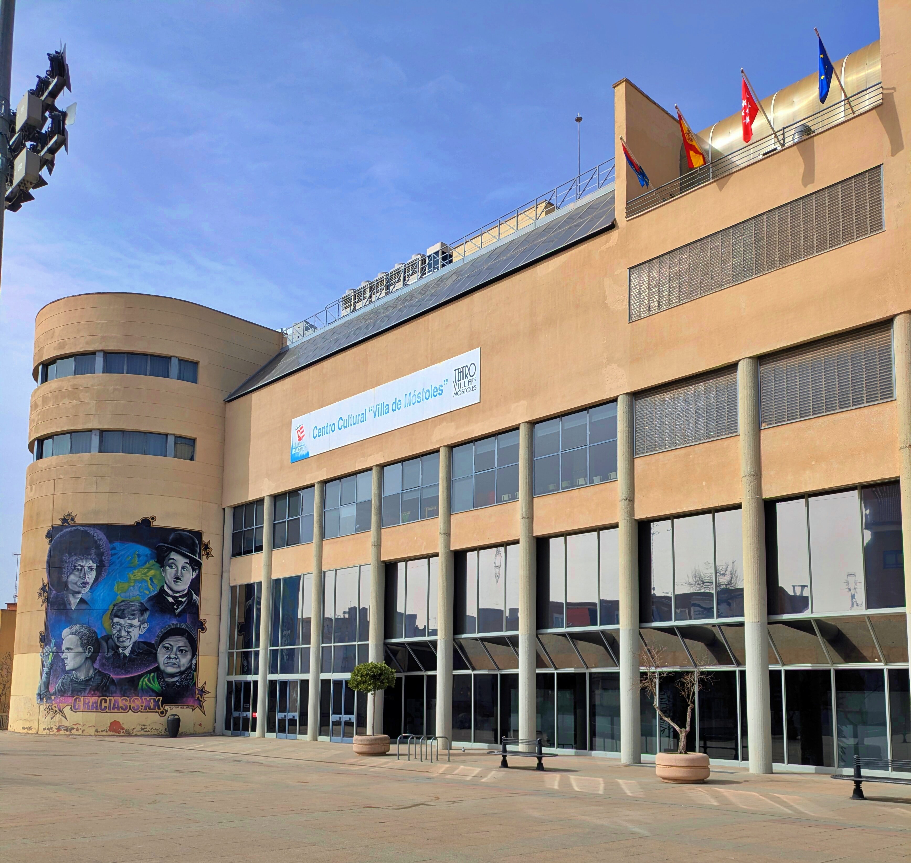 La ruta siguió hacia la Casa de la Cultura de Móstoles, un edificio más moderno donde suelen organizar exposiciones y eventos durante todo el año. Justo delante hay un reloj bastante llamativo y algunos murales. Es una zona bastante viva del centro, donde muchas veces hay conciertos, talleres o actividades culturales.
