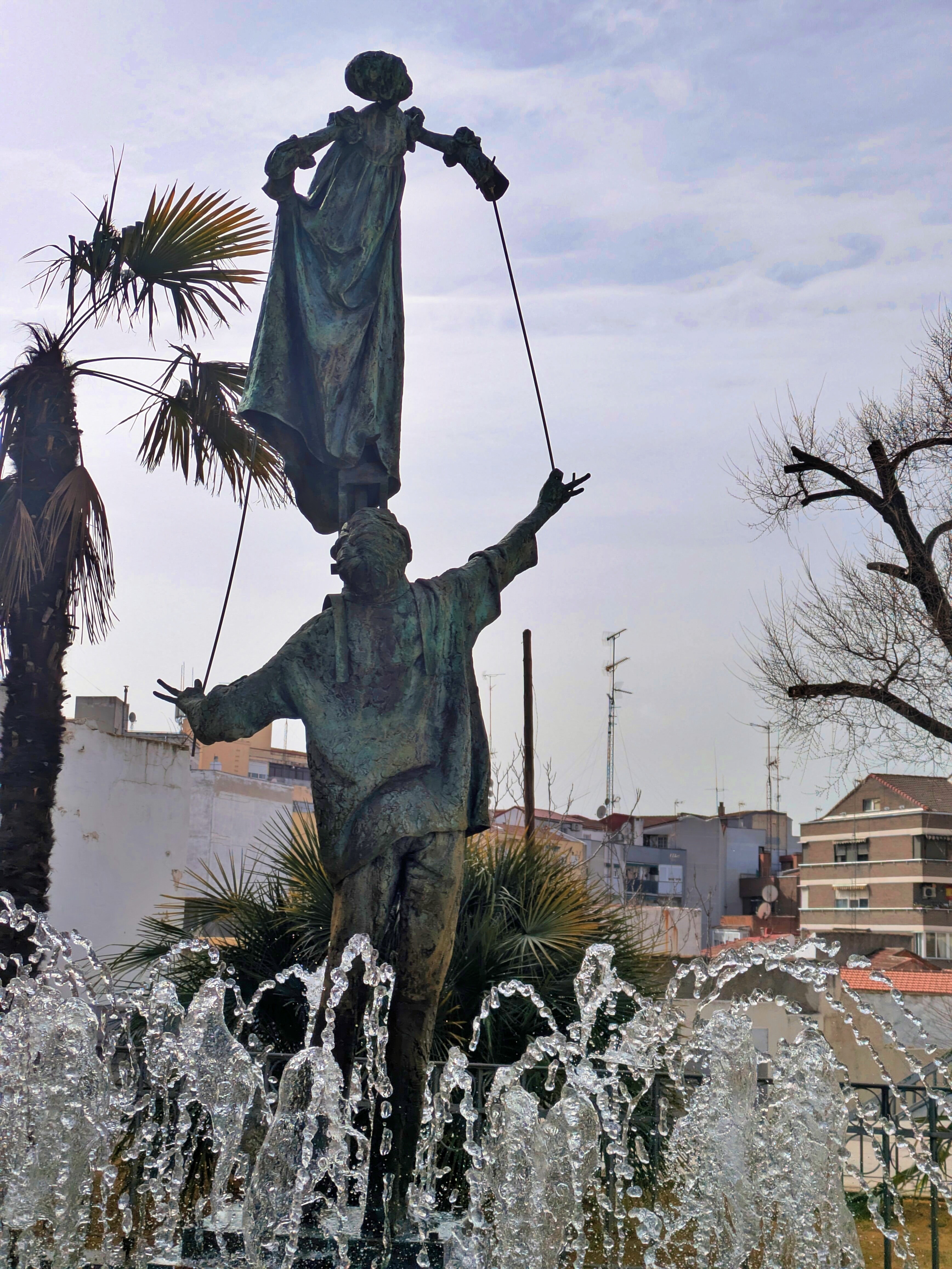 Por allí también está una de las esculturas más curiosas de la ciudad: la estatua del titiritero con su marioneta, que fue la primera dedicada al mundo del títere en España. Es de esas cosas que, si no te paras un momento a mirarla, casi pasan desapercibidas.