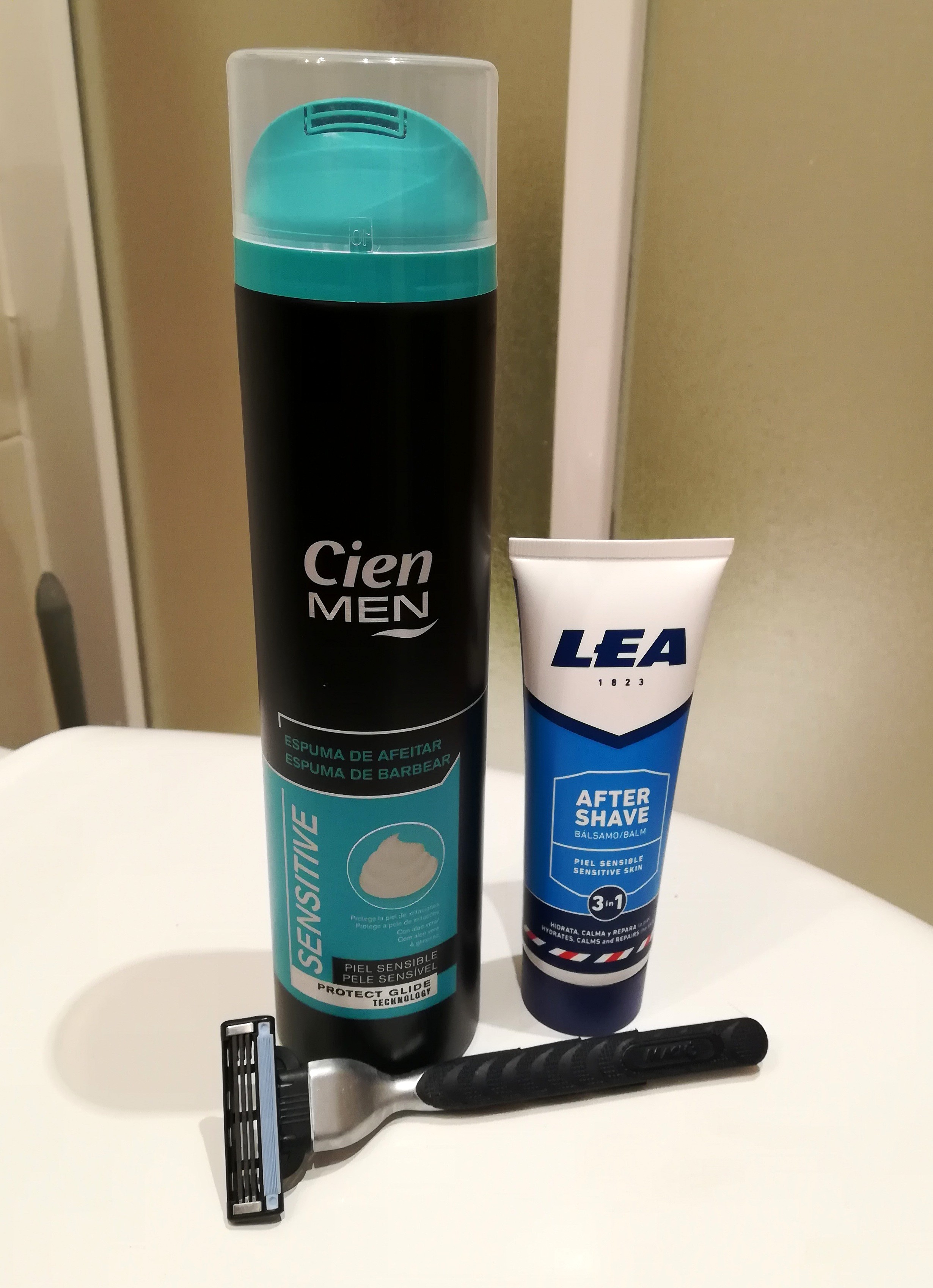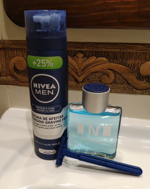Cuchillas Astra, una brocha de pelo sintético marca Yaqui en Aliexpres y mejor una crema Lea para empezar que jabón.