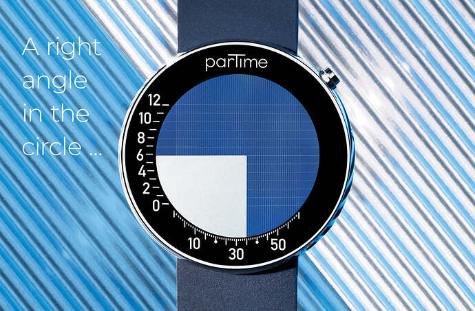 Versión geométrica del reloj de arena. El Partime muestra, al igual que un reloj de arena, tanto el tiempo pasado como el tiempo por transcurrir. Sin embargo, no hay ningún otro medidor de tiempo que pueda comparársele. Sin tics tacs. Sin arena cayendo. Sin números parpadeando. Un ángulo recto en el círculo indica en horizontal las horas y en vertical los minutos. El tiempo ya transcurrido es el “part” blanco, “time” la parte restante del día. Minuto a minuto la superficie azul disminuye, hasta que el círculo queda vacío al final del día. Apretando un botón se puede ver de forma digital la hora exacta en segundos.