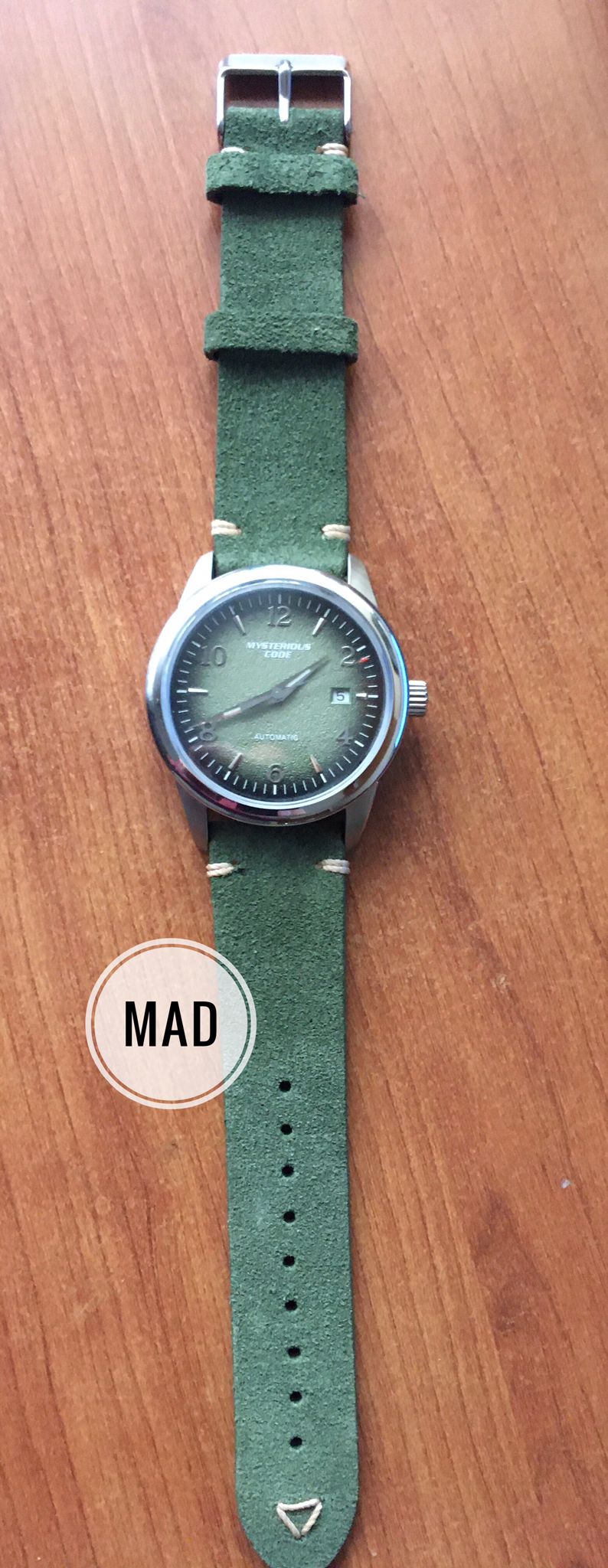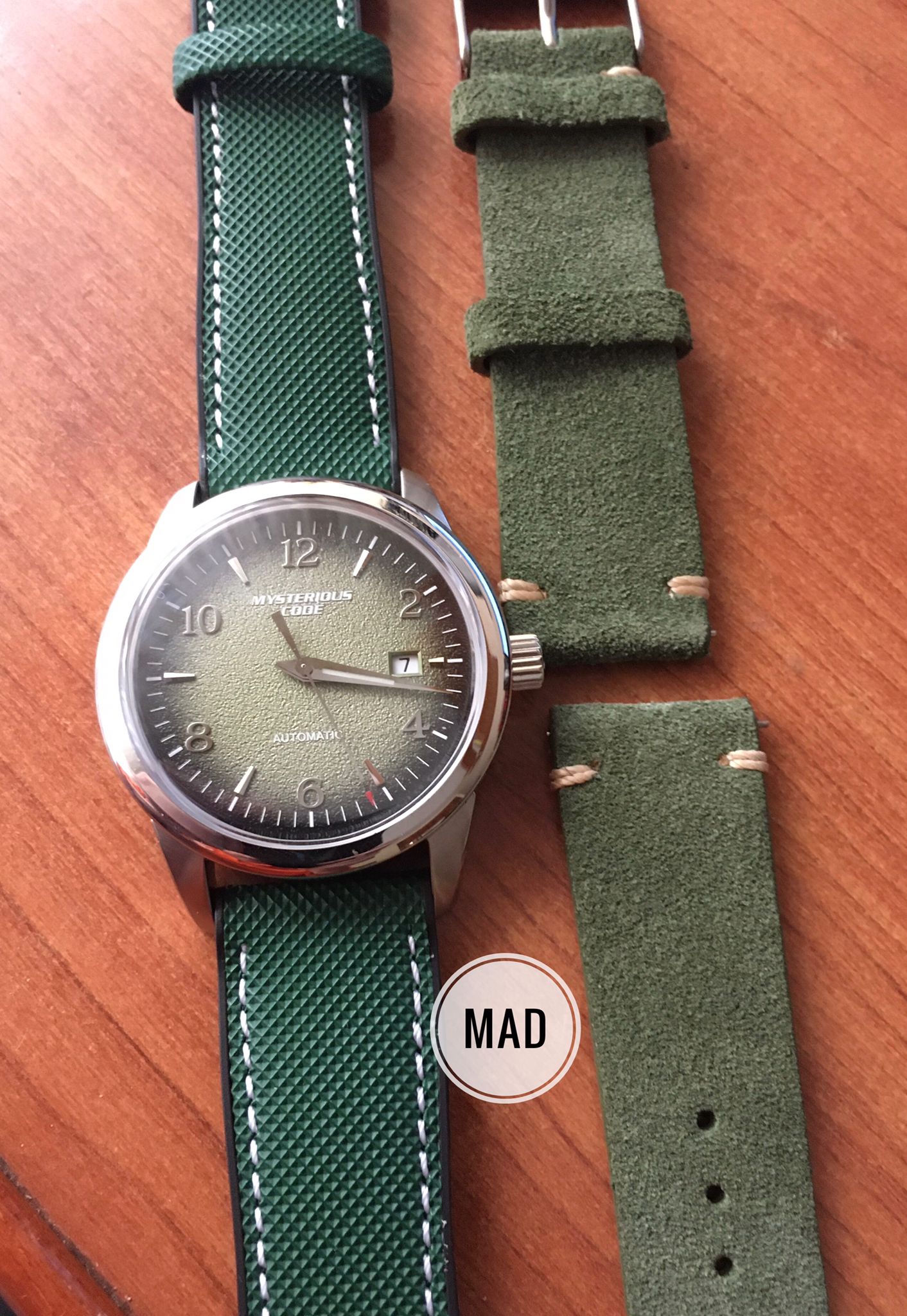 Ami me ha llegado la ultima, una verde oliva oscuro. Y me encanta el resultado Los chinos han aprendido a hacer correas, es gruesa pero no es dura. Muy comoda. Y el reloj … no lo habia podido estrenar pero esque me encanta. Es carisimo (incluso con descuento) pero es chulo … El otro que tuve de la marca no me acabo de gustar, tenia cosas que no … no estaba bien pero este si. Este mola mucho.