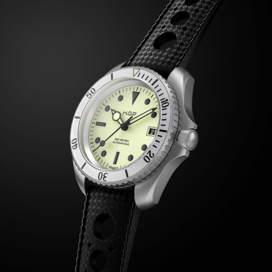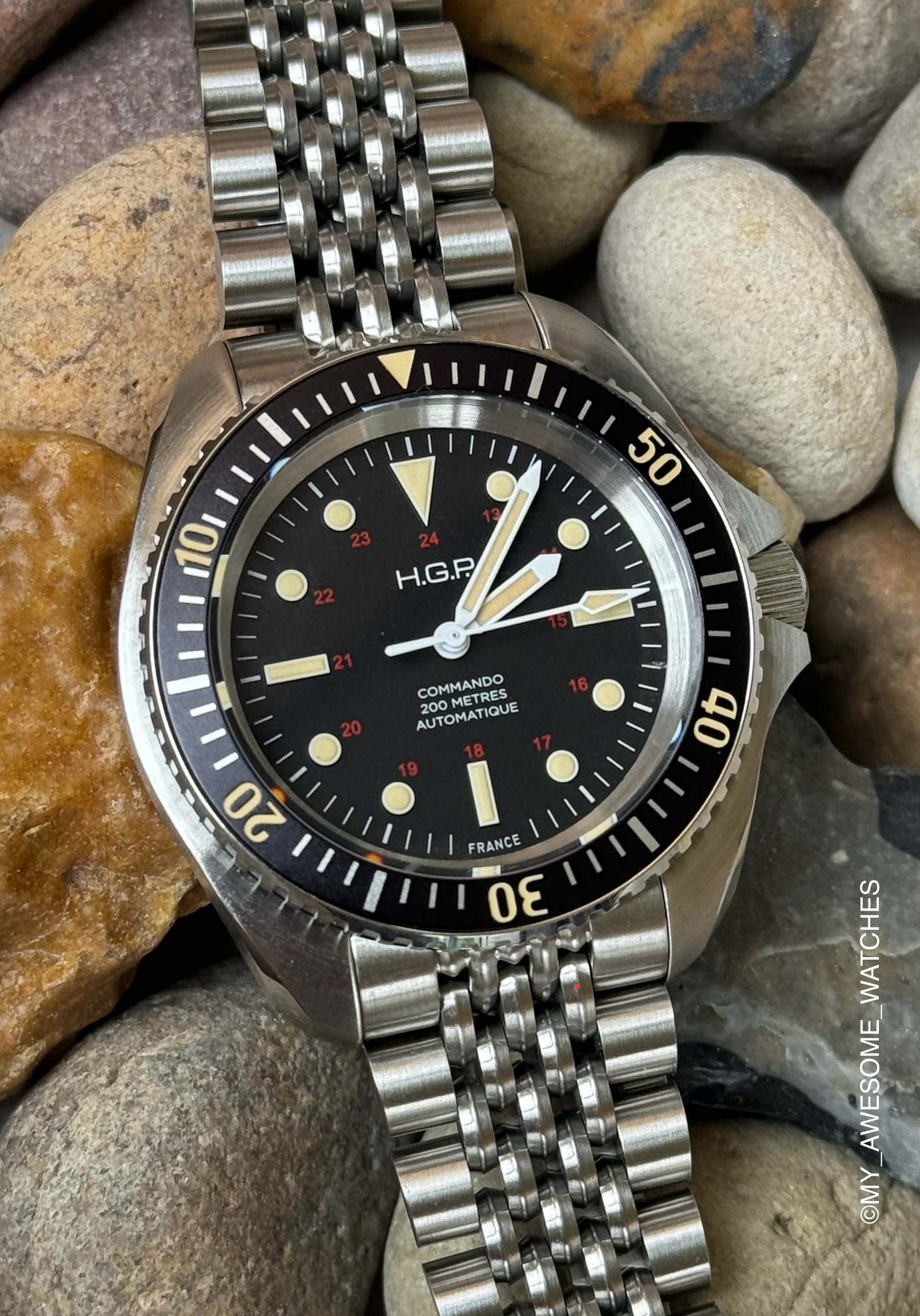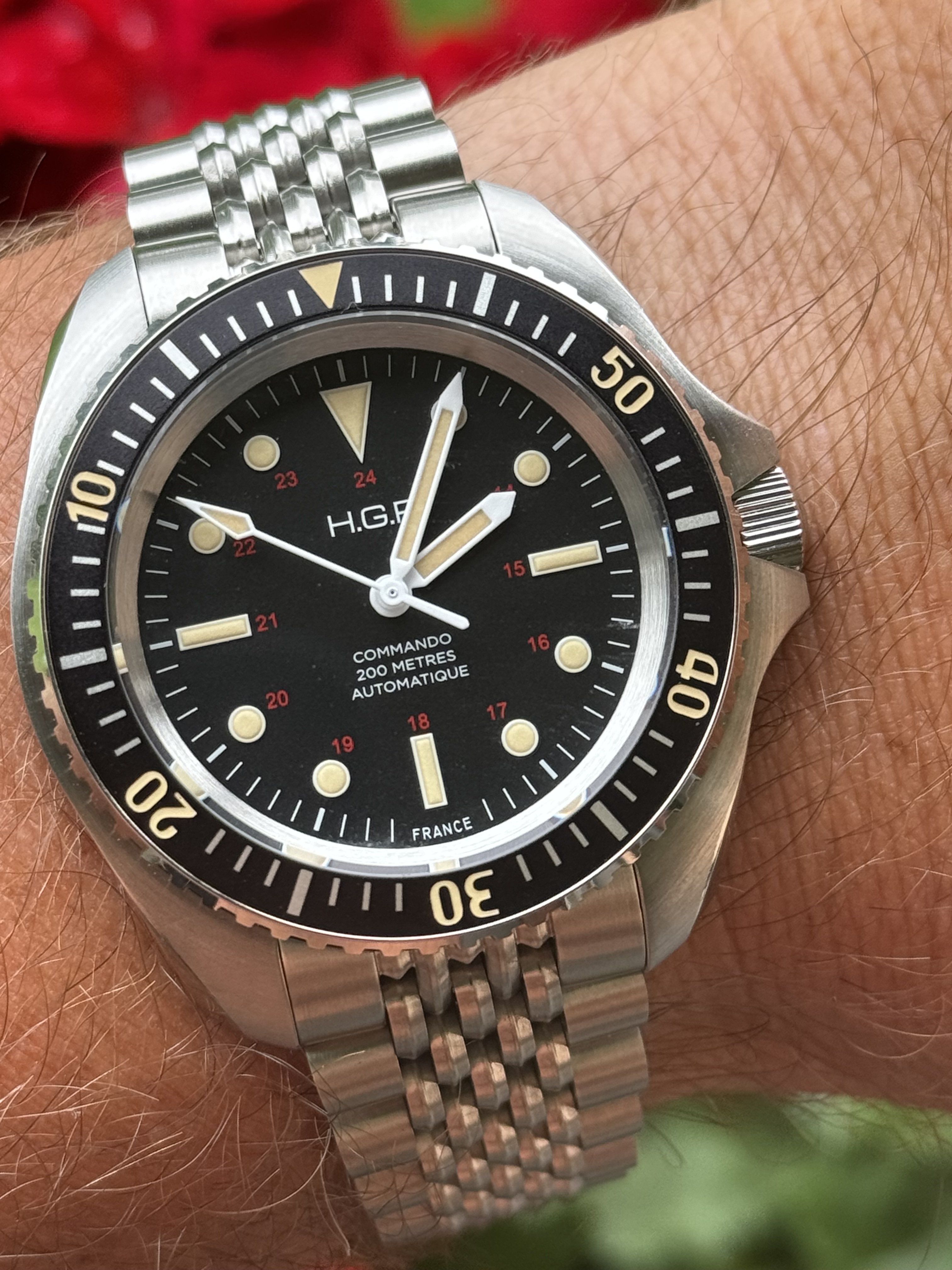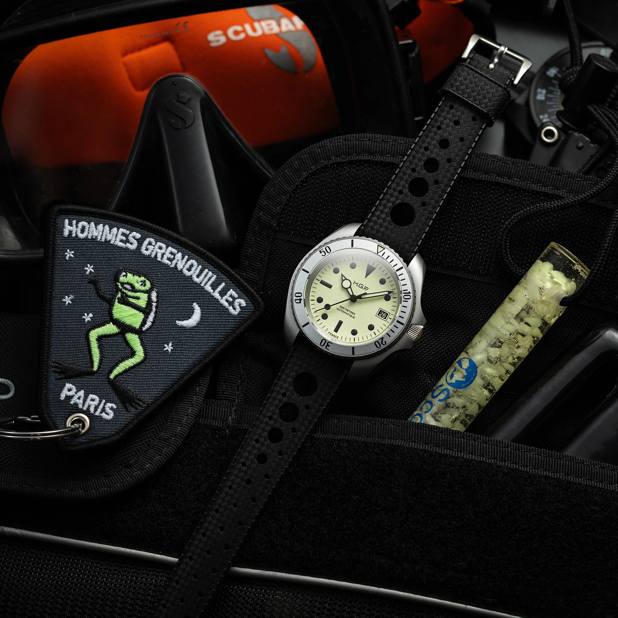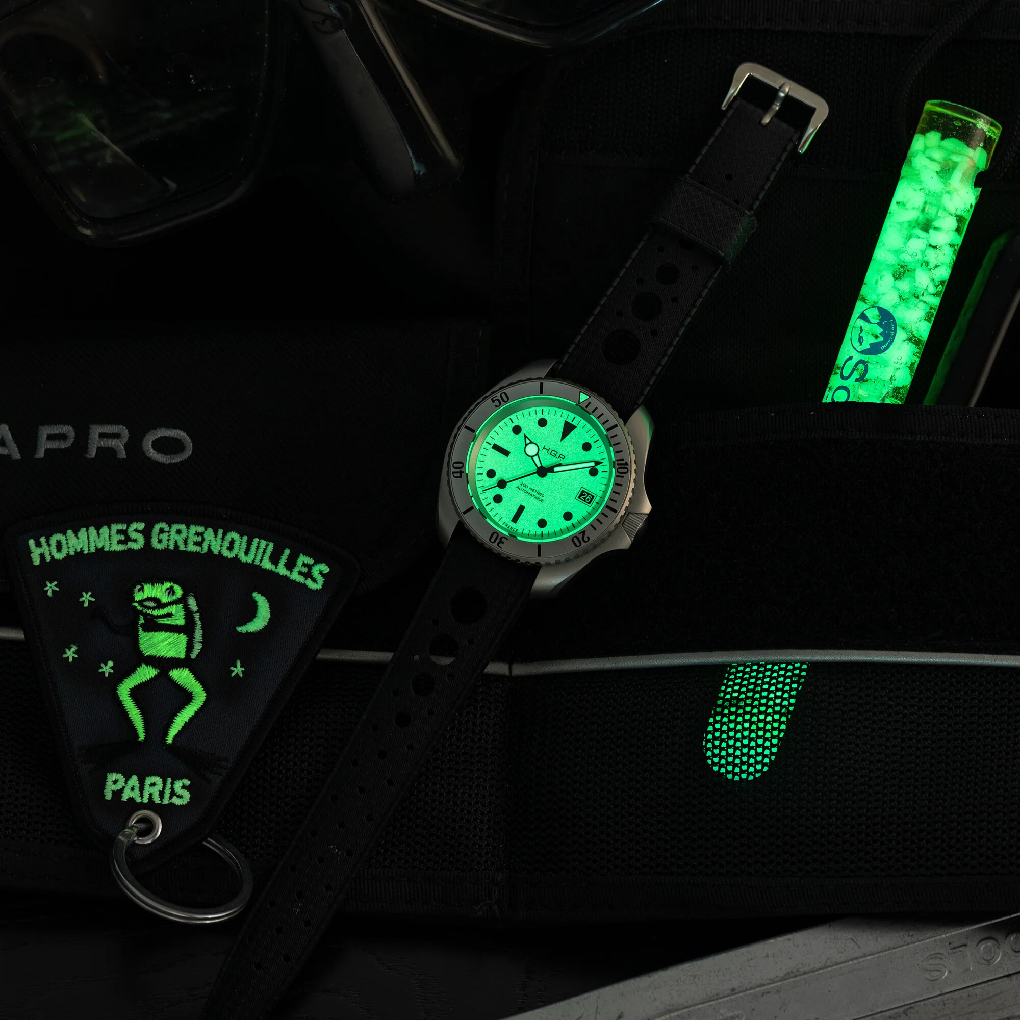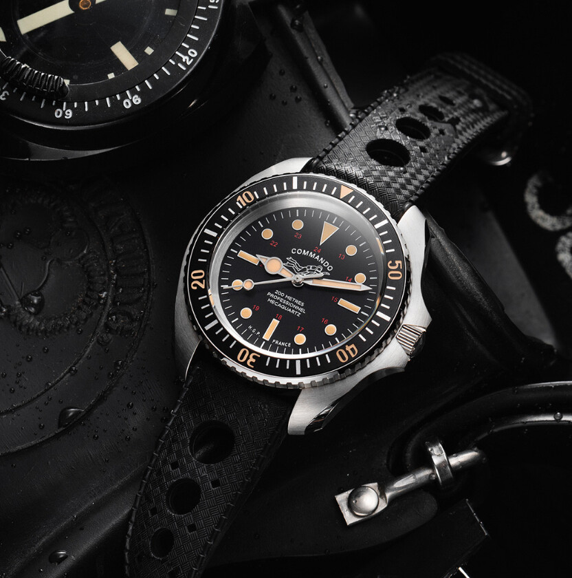 Siguiendo con la esfera Commando, recuperan ahora el “scuba dude” francés (ellos lo llamaban “gentilhomme-grenouille”) que aparecía en los antiguos Monnin Commando que comercializaban casas como, por ejemplo, la marsellesa Jacques Bianchi.