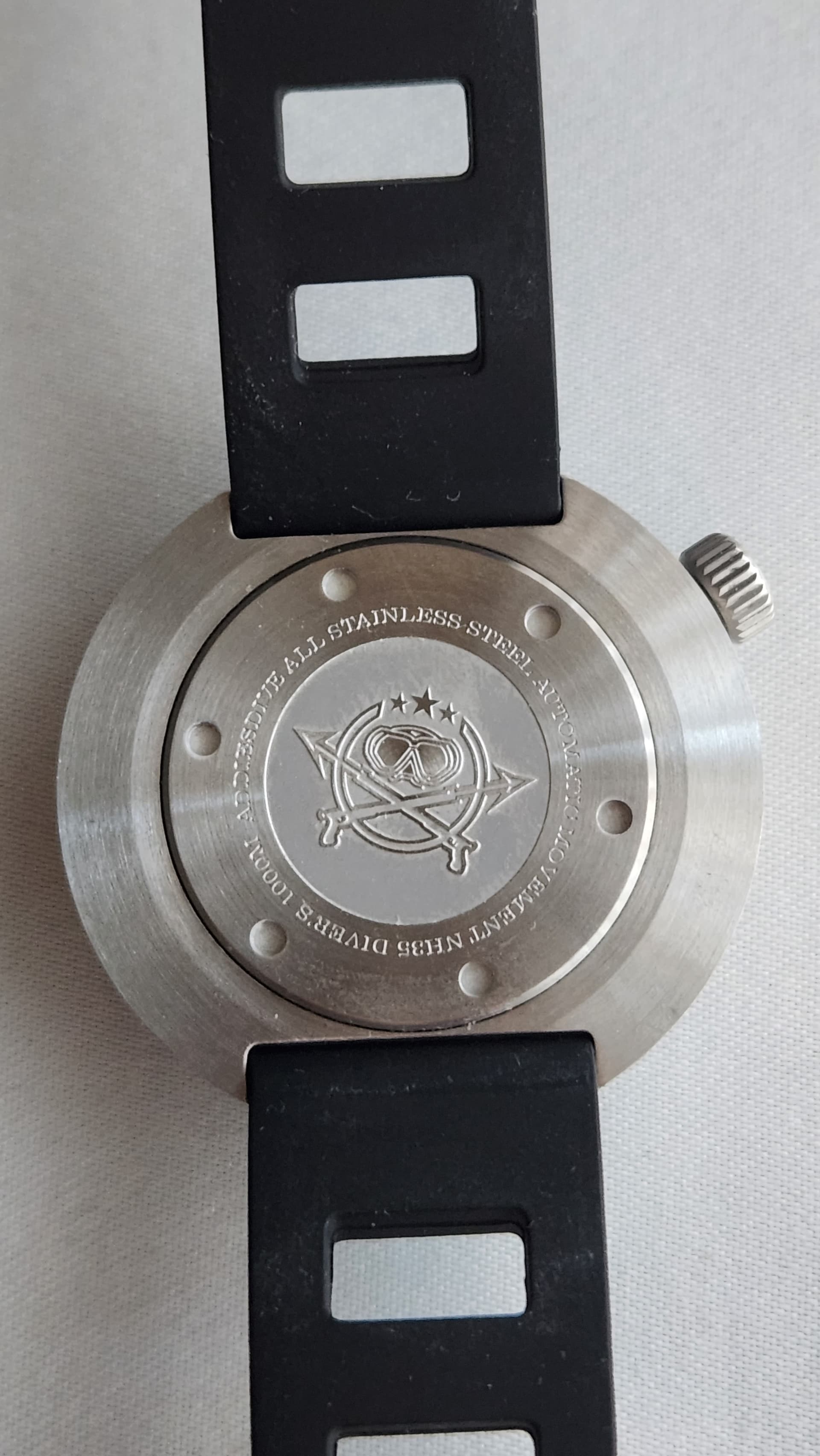 La trasera tiene grabado con buen texturado (aquí no hay láser) el logo de la firma con la máscara y las pistolas-arpón de buceo, y sus características principales, como son el llevar un NH35. Una cosa poco habitual del reloj es que su caja no tiene asas.