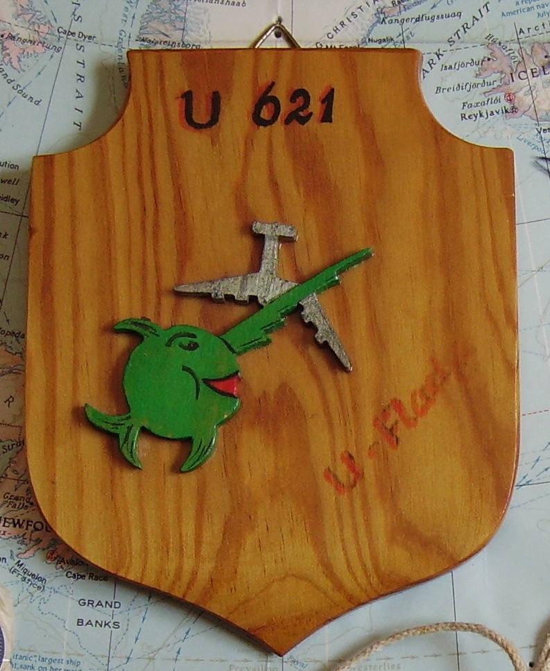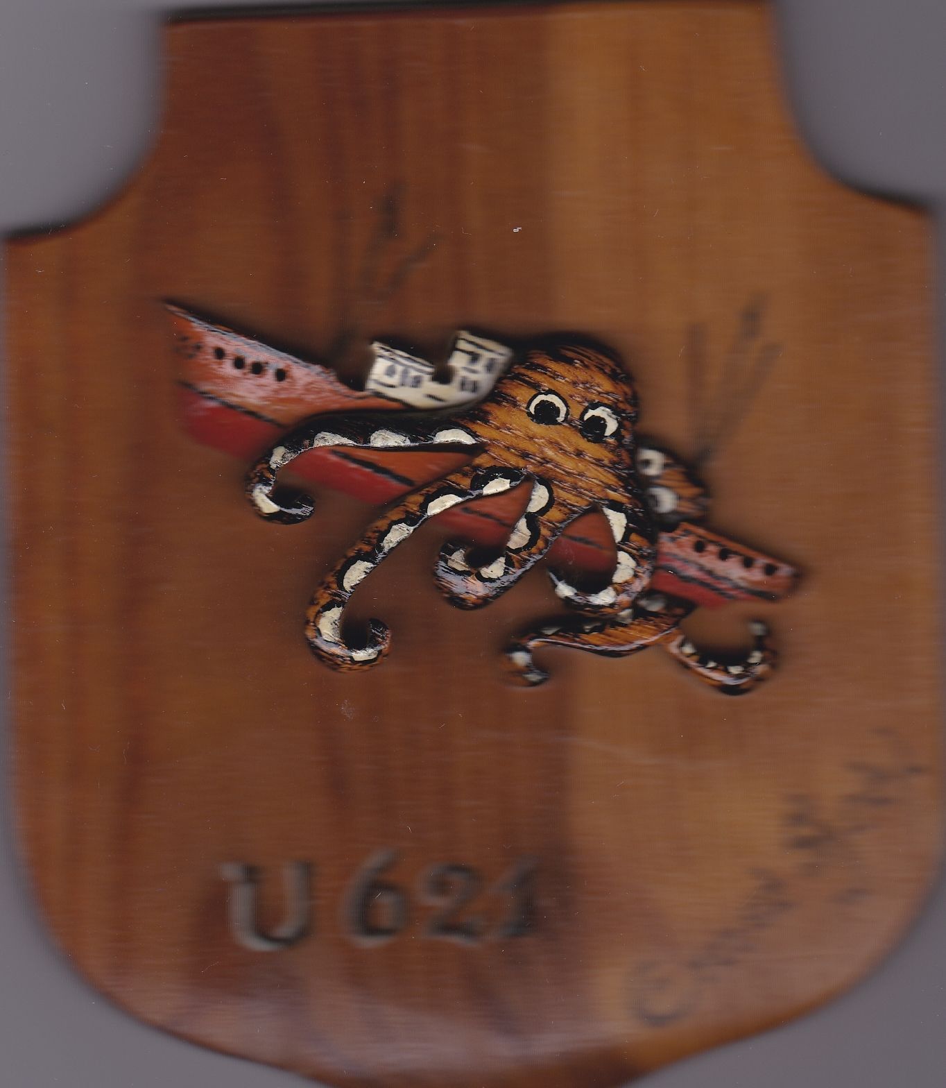 Se trata de una metopa finamente trabajada a mano y totalmente en madera muy dura policromada y en relieve cuyas medidas son 145 mm de alto y 113 mm de ancho. Sobre la placa base se encuentra representado un pez espada sonriente saltando del agua que corta con su pico por la mitad a un cuatrimotor enemigo, británico. El pez está decorado en verde con motivos negros y rojos. El avión se destaca con un simple “plateado fuselaje”. En el encabezamiento de la misma figura la palabra U-621 y abajo a la derecha la palabra U-Flak. Todo barnizado delicadamente y rematado con un robusto y bien anclado colgante de latón con dos tachuelas para la decoración del camarote del comandante.