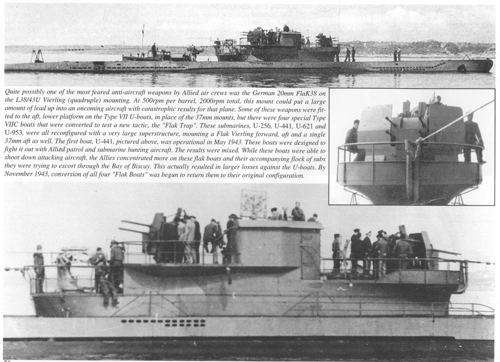 Los submarinos así artillados servían de defensa estratégica para el resto de submarinos presentes en la manada de lobos. Así mismo, se suponía incrementarían los derribos de aviones enemigos cazasubmarinos. Finalmente no fue así debido entre otras razones al considerable peso añadido que modificaba las condiciones hidrodinámicas del buque, unido a problemas tanto logísticos como de seguridad hicieron que la idea en apariencia brillante, constituyese un fracaso. Los U-Flak modificados del modelo VII-C fueron U-441, U-256, U-621, U-953, U-211, U-263 y U-271.