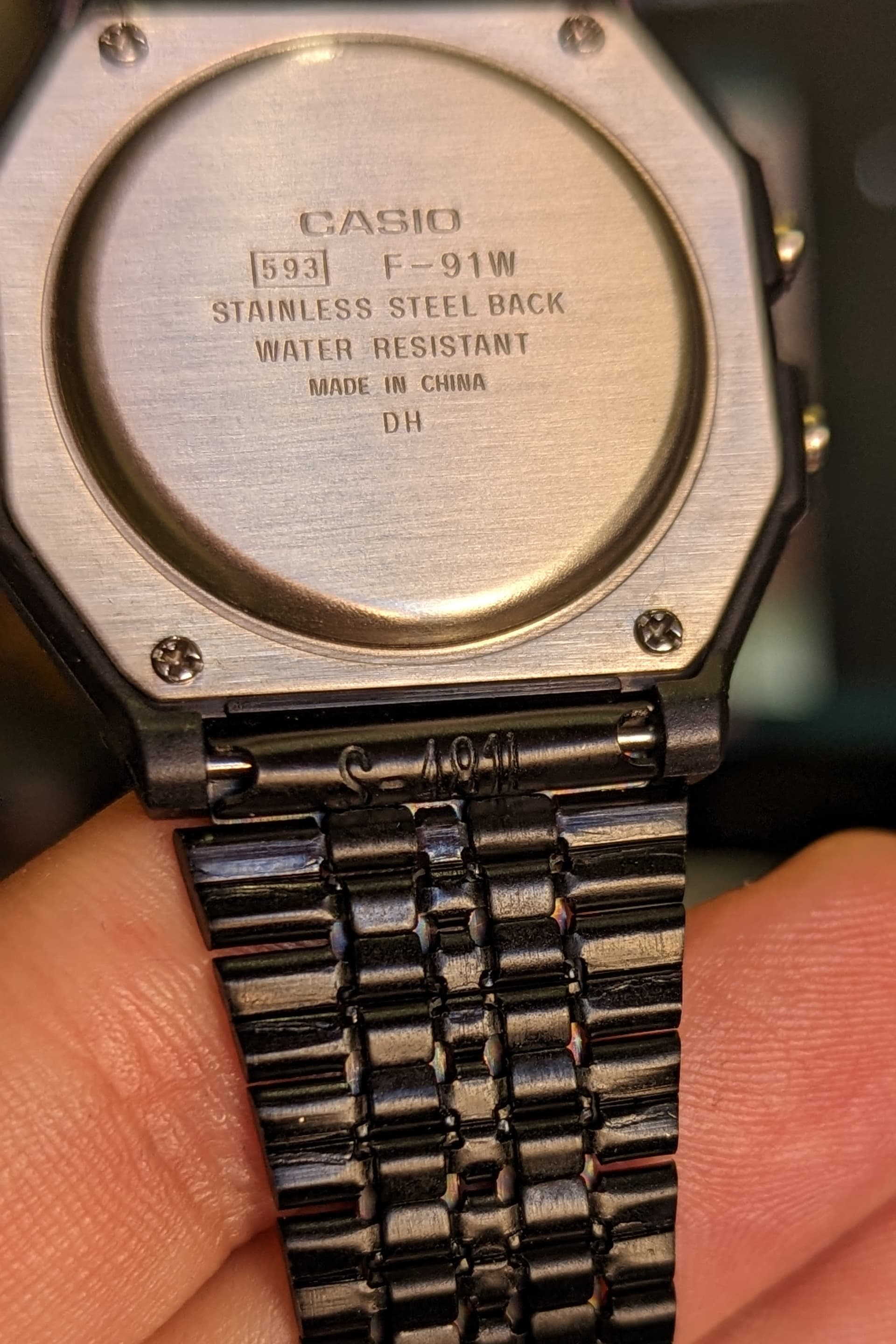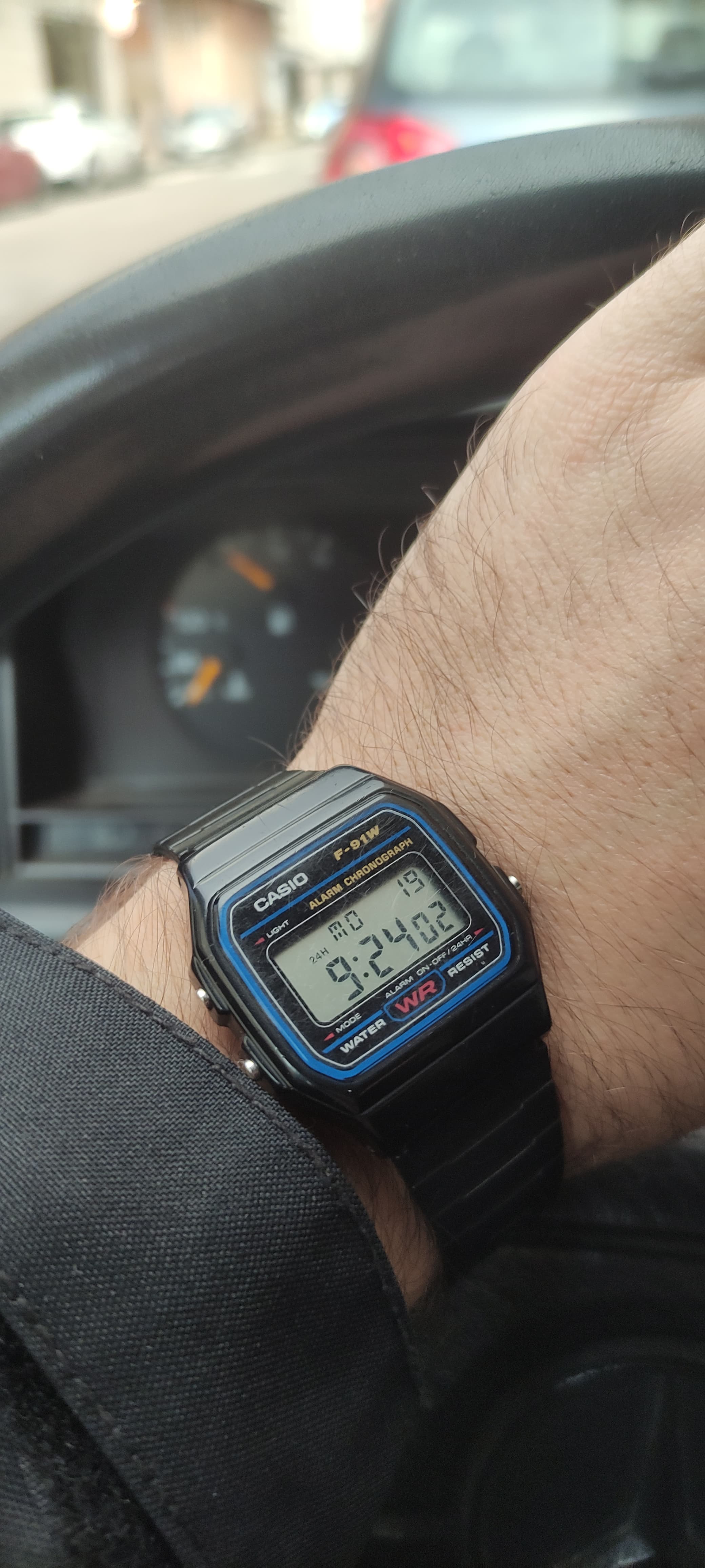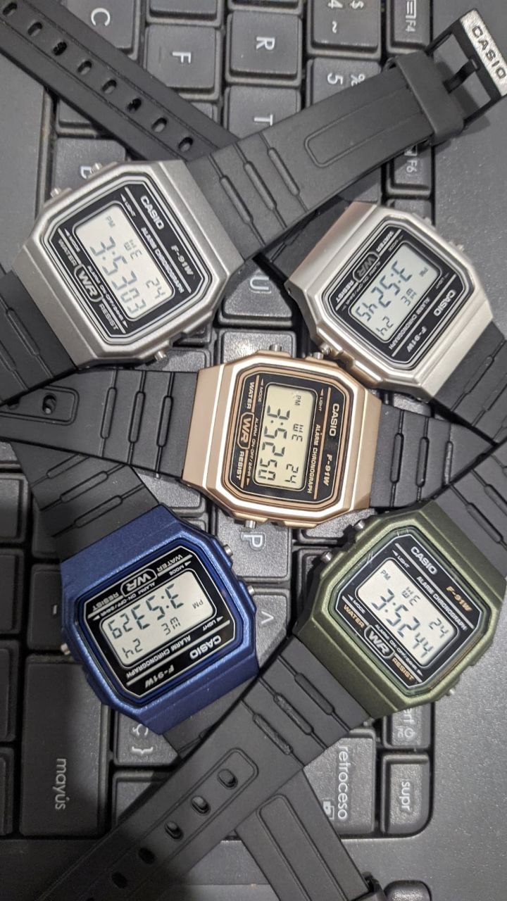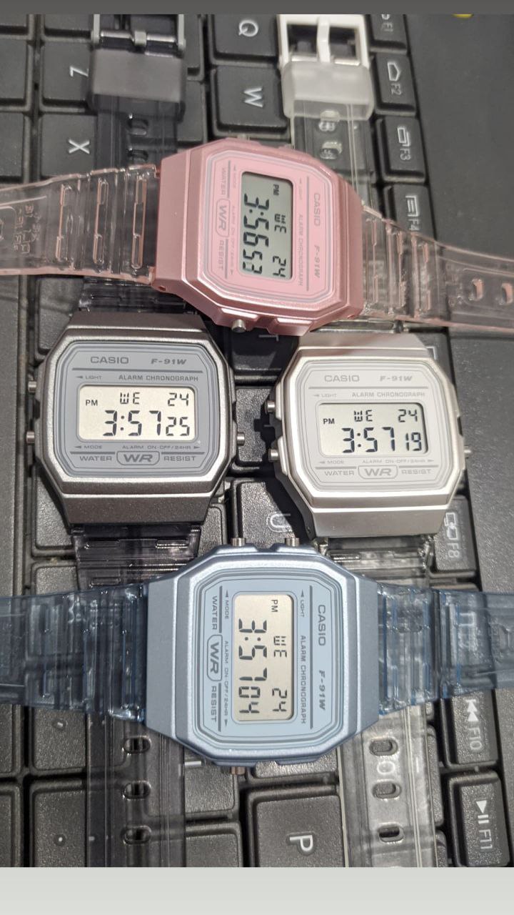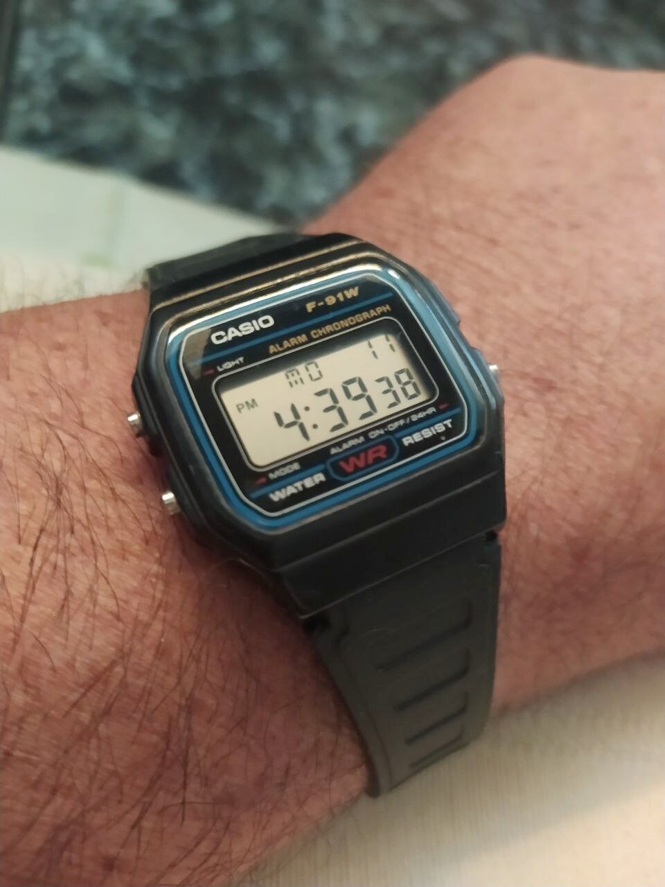 Buenos días, el Casio F-91W es el Casio más famoso de todos los F, creo que incluso ha superado al icónico F-100 pero el diseño del display y el tipo de caja está inspirado en el F-84, F-86 y F-87 y antes que estos Casio fabricó relojes que eran iguales pero no tenían alarma.